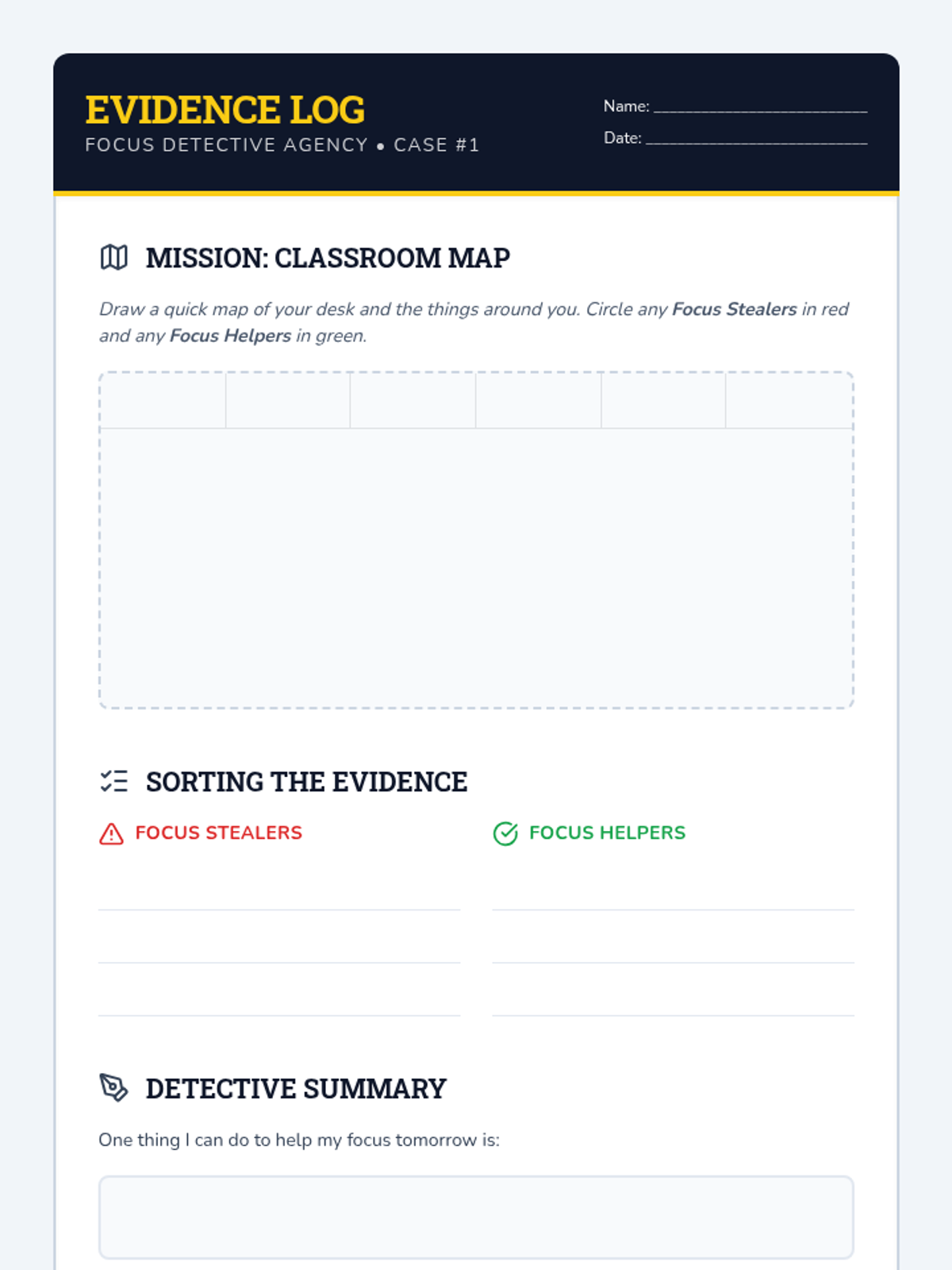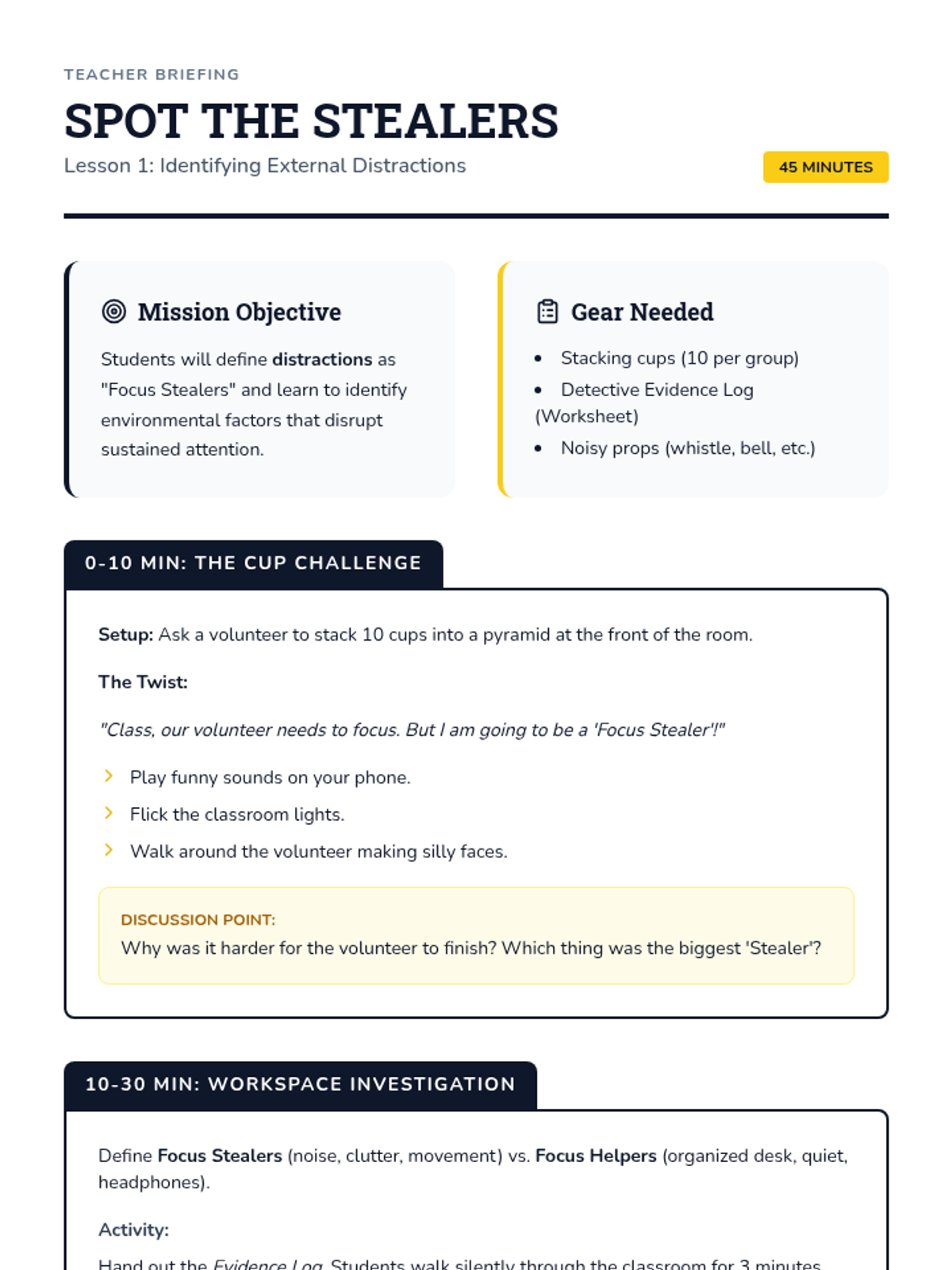 A 5-lesson metacognitive sequence for 2nd graders to identify environmental and internal distractions, using a 'detective' theme to develop sustained attention strategies for complex tasks.