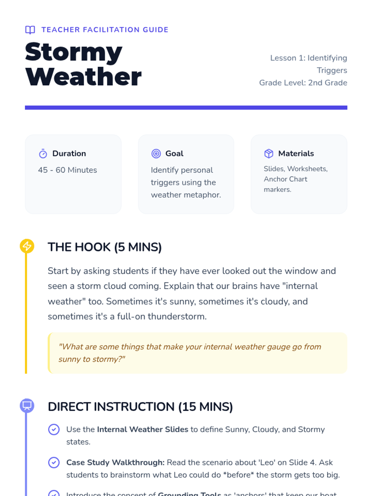 A comprehensive unit for 2nd-grade students to recognize emotional escalation and apply appropriate grounding strategies. Through storytelling, mapping, and simulation, students build self-awareness and co-regulation skills to navigate crisis moments effectively.