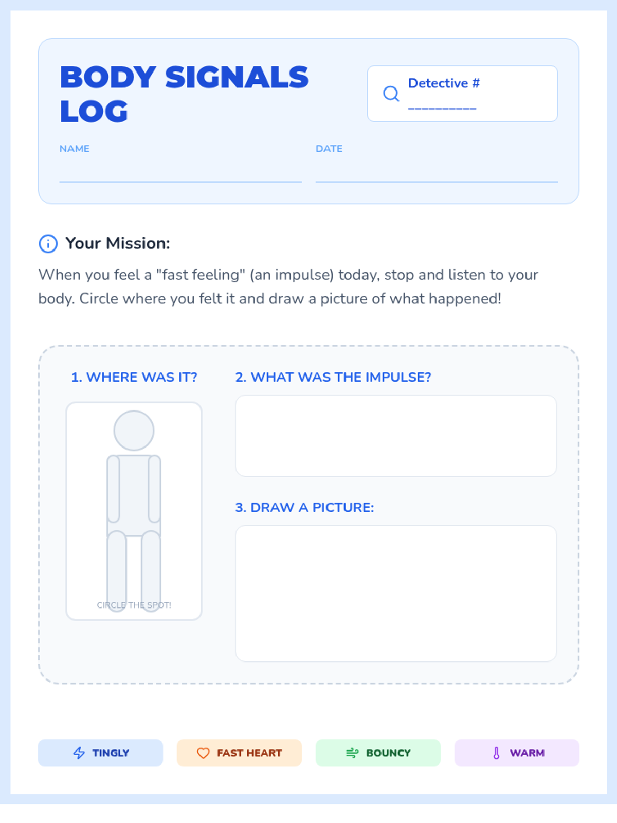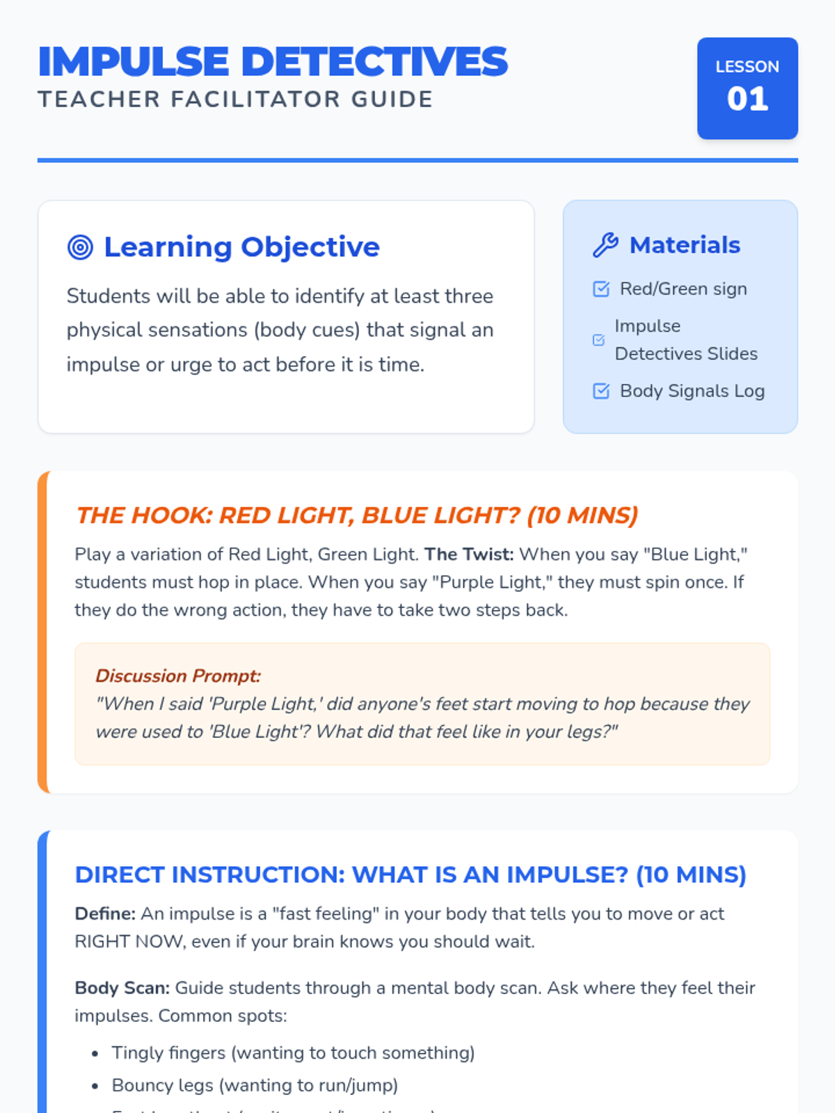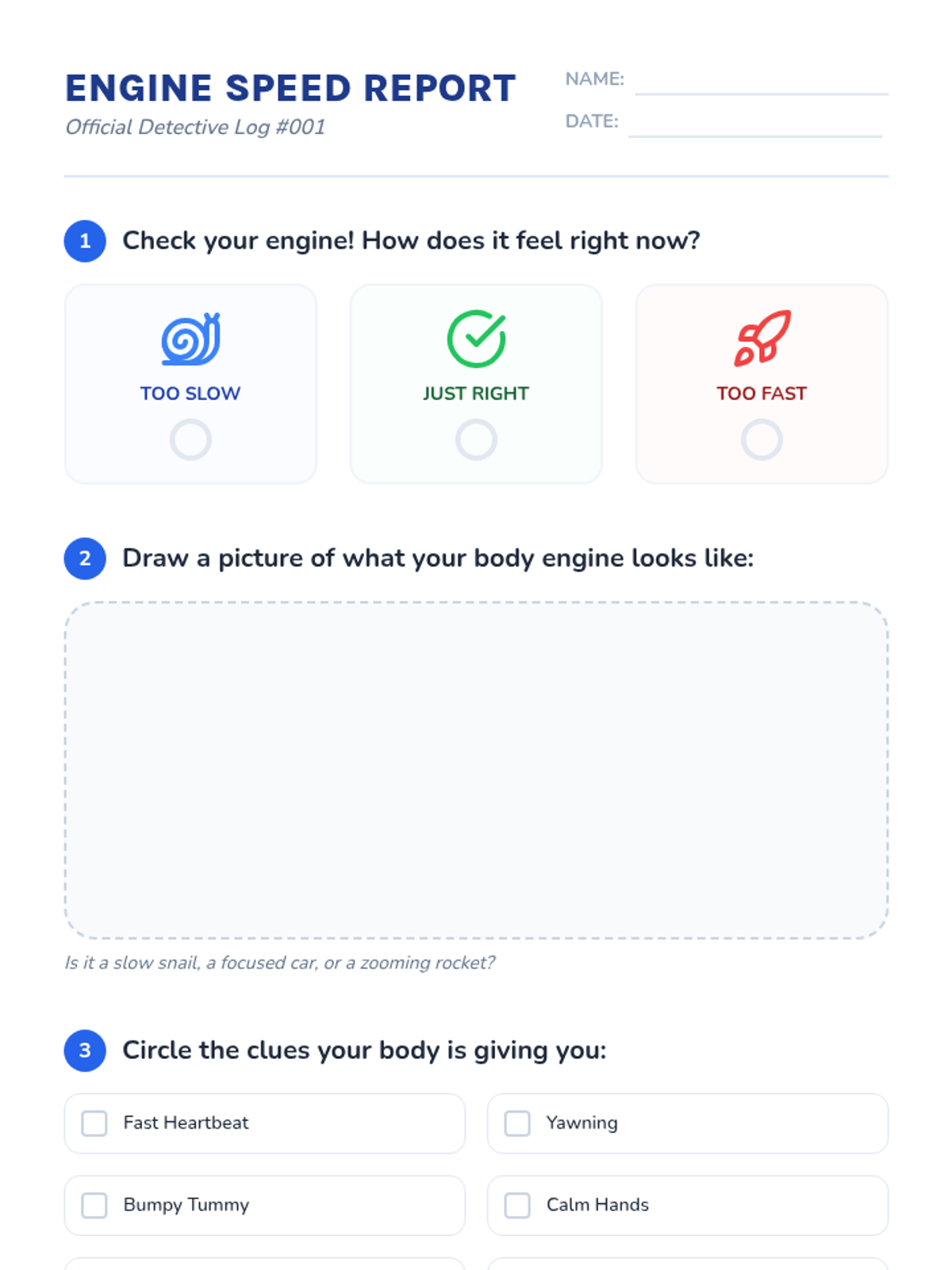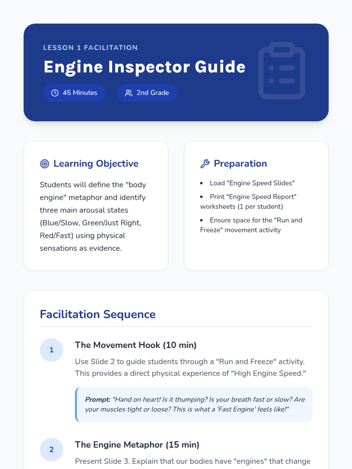 A 5-lesson sequence for 2nd-grade students focused on interoception and body awareness. Students use the 'body engine' metaphor to identify energy states, map physical sensations, recognize triggers, and develop self-monitoring routines.