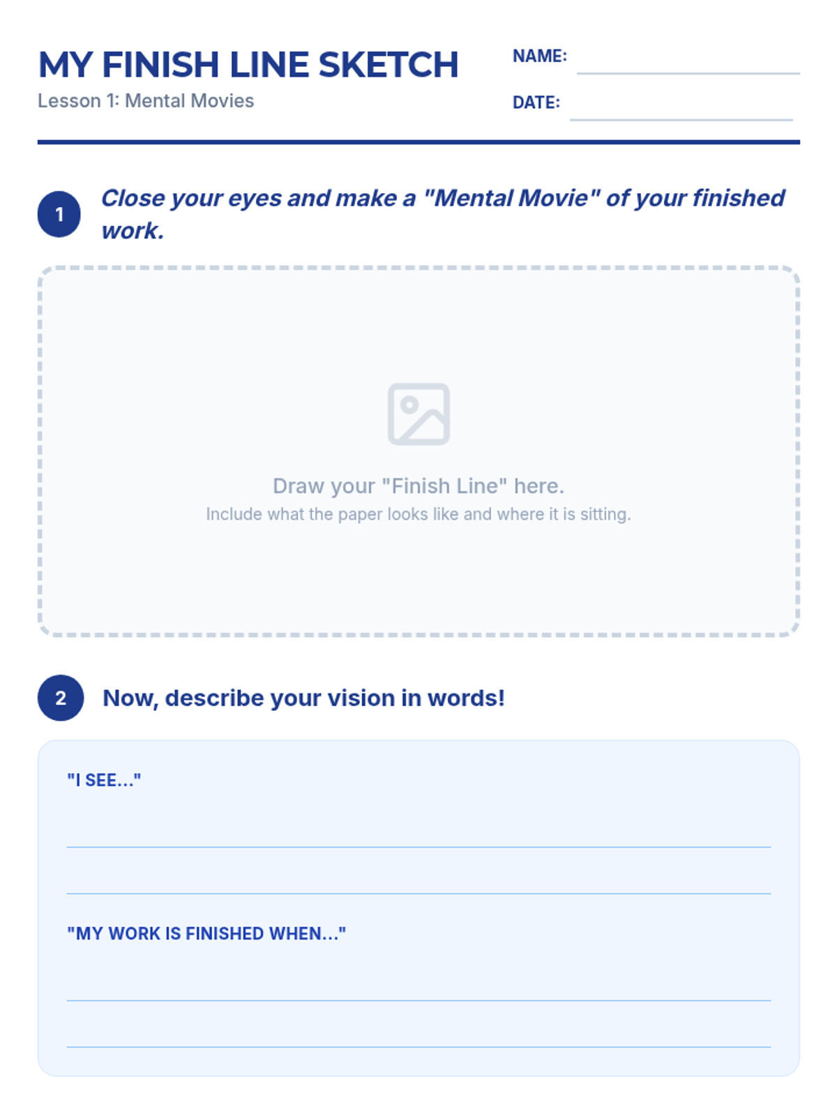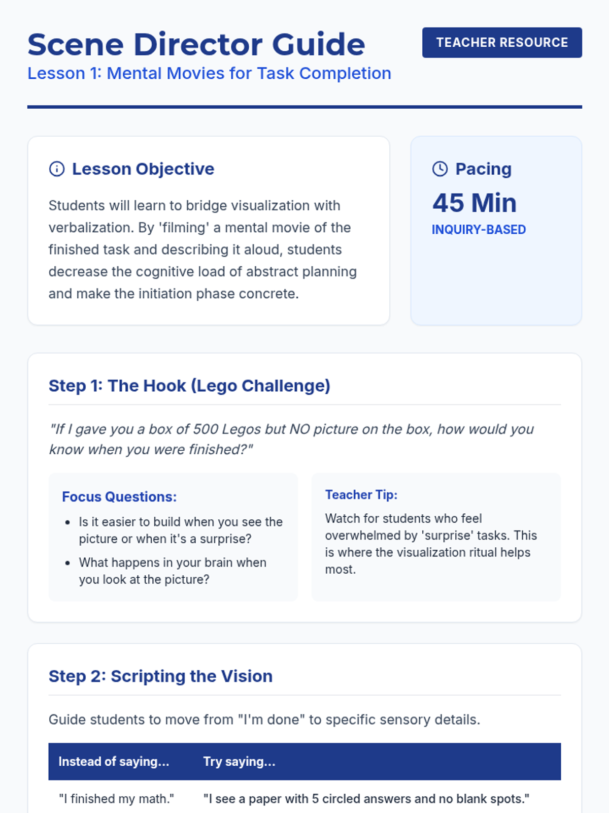 This sequence helps students overcome task initiation hurdles by combining visualization and verbal self-talk. Students learn to 'see' the finished product, reverse engineer the steps, estimate time accurately, and use micro-goals to take the first step.