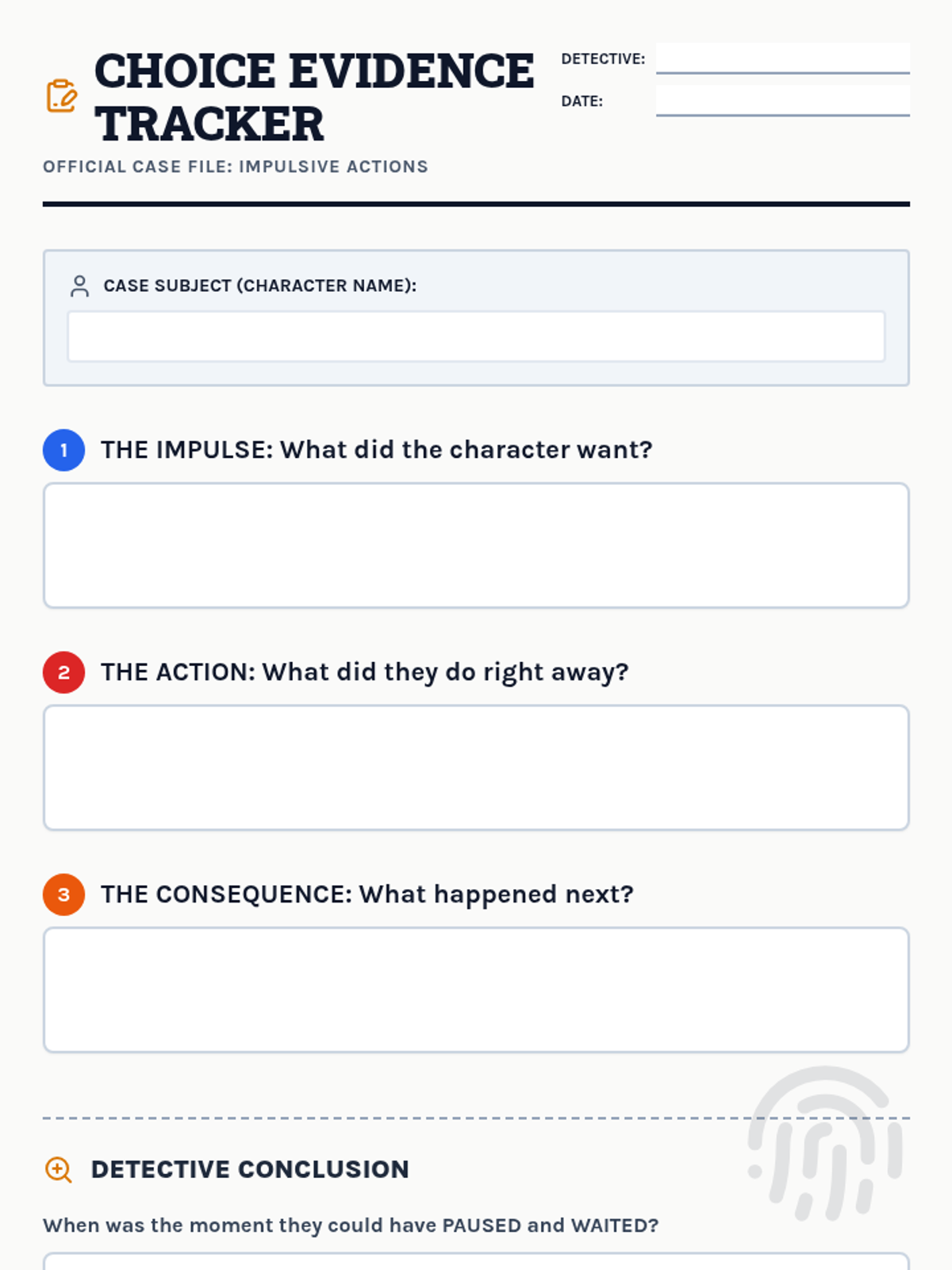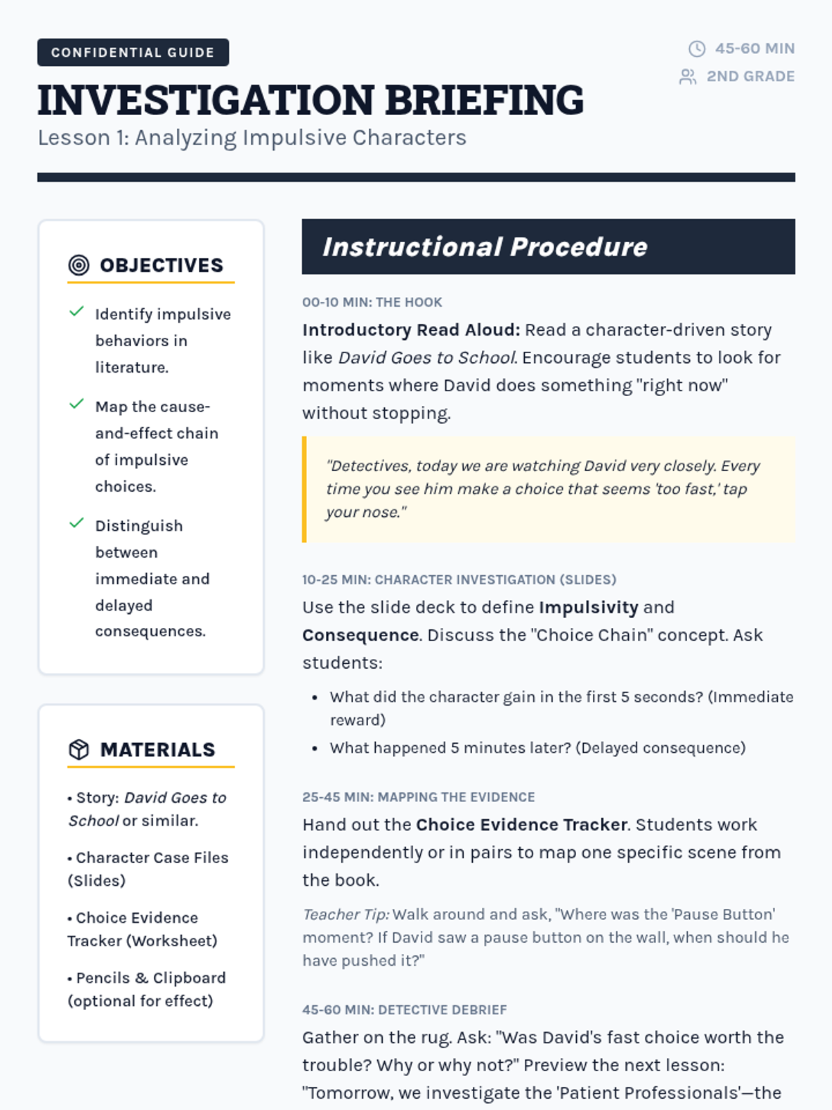 An inquiry-based sequence for 2nd graders to explore the relationship between choices, waiting, and consequences. Students act as 'Choice Detectives' to analyze characters, predict outcomes, and develop personal strategies for delaying gratification.