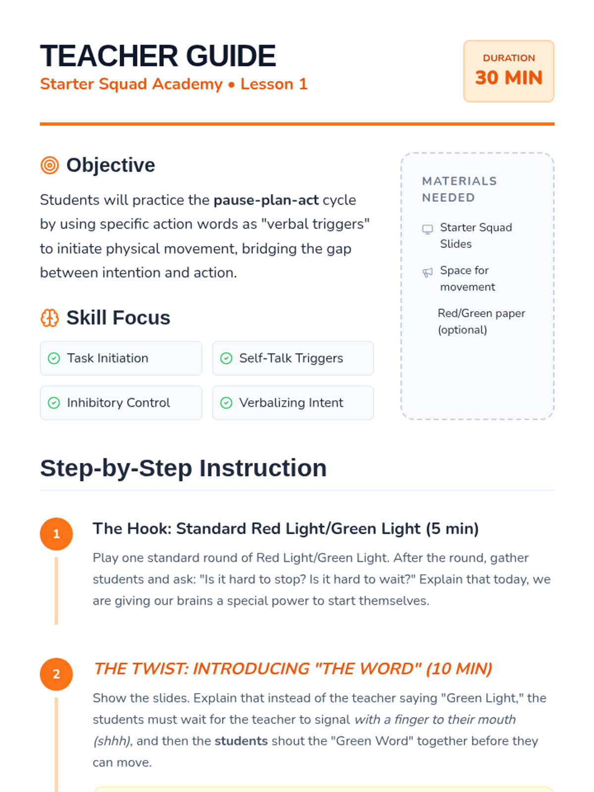 A gamified sequence for 1st graders to master task initiation through verbal self-talk triggers, using physical games and simulations to make executive functioning concrete.