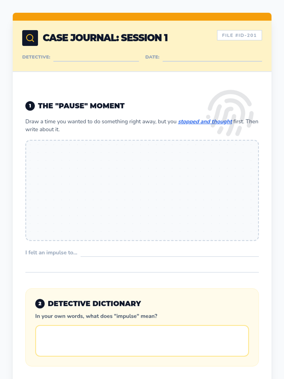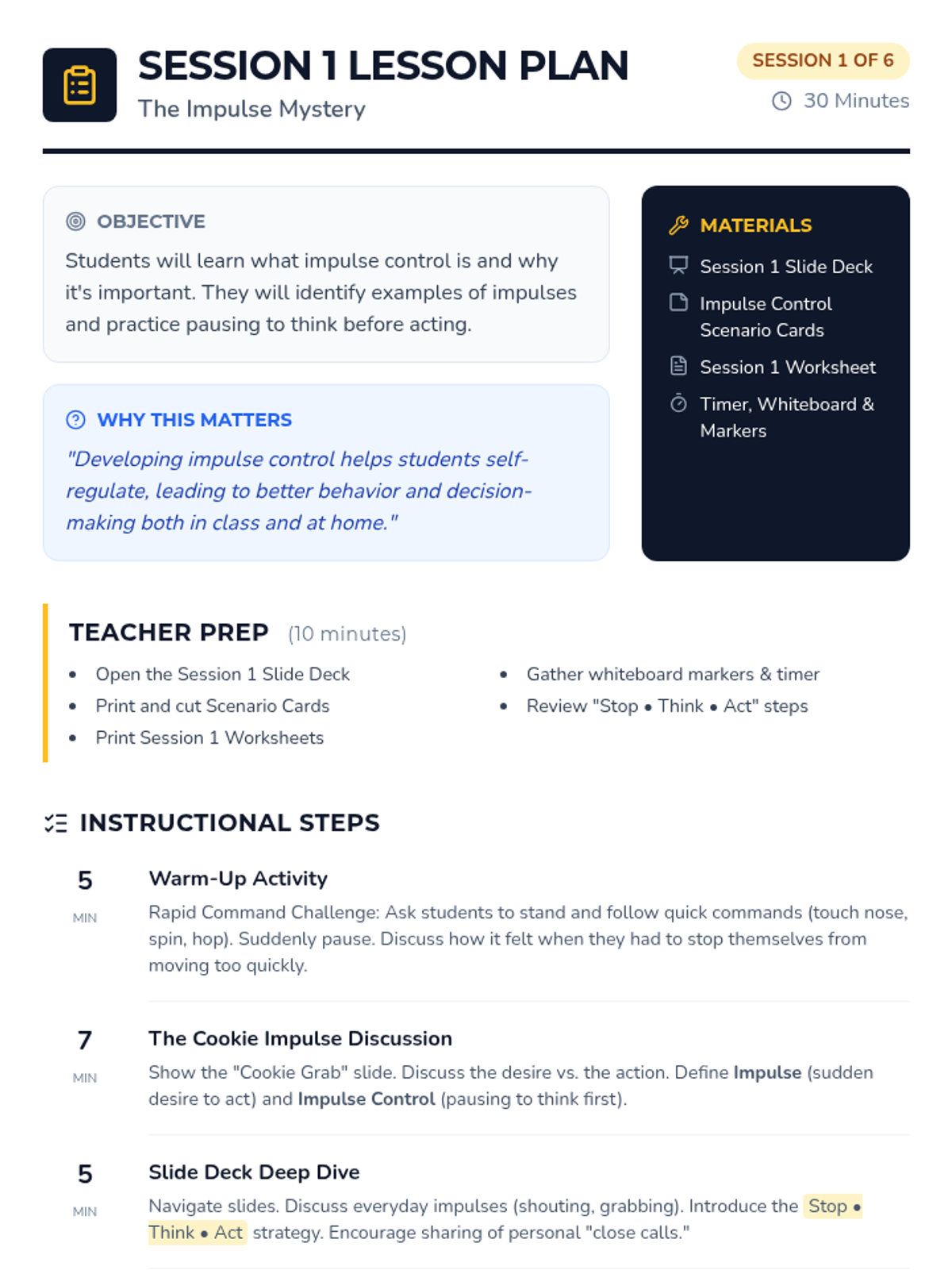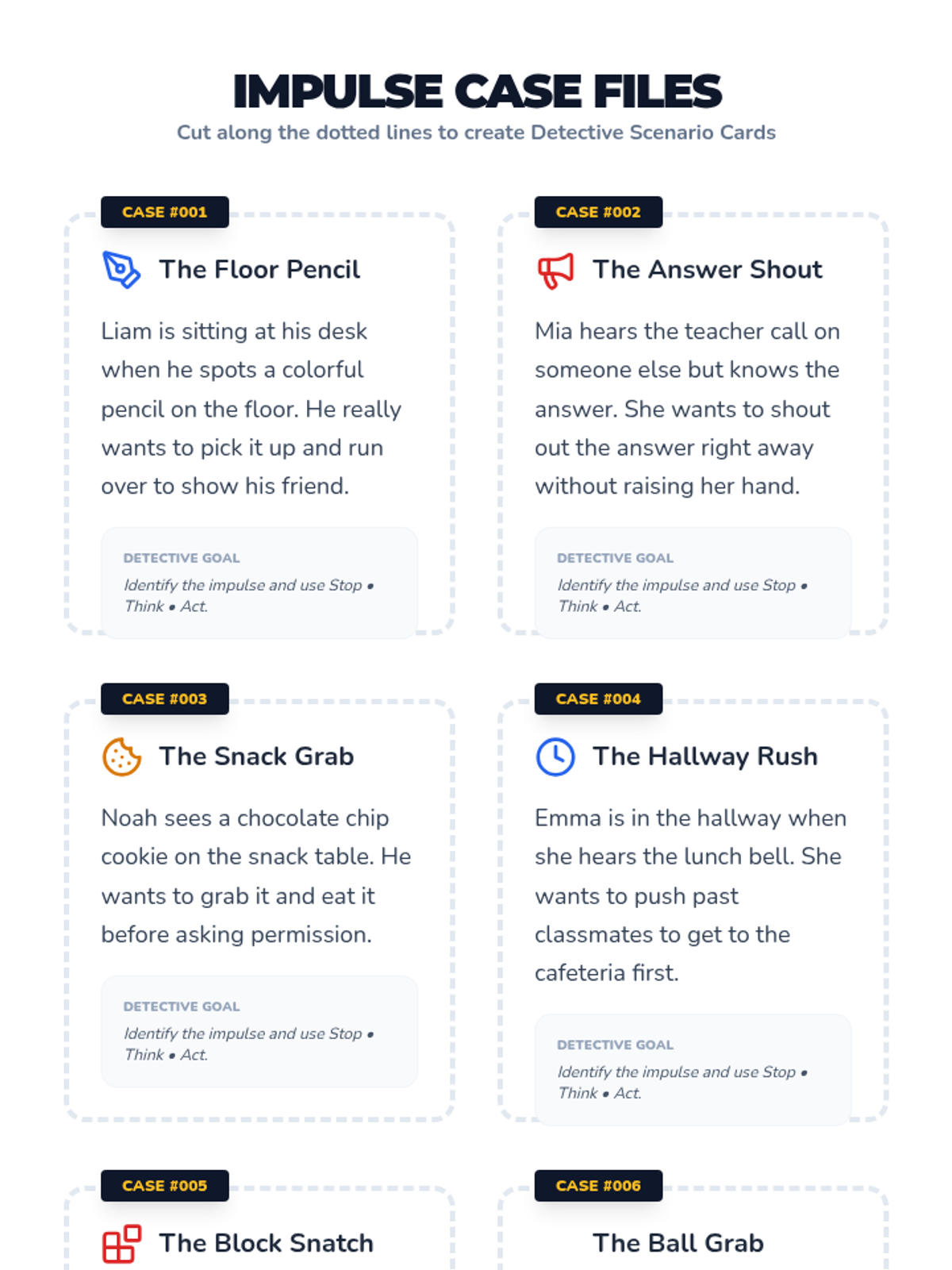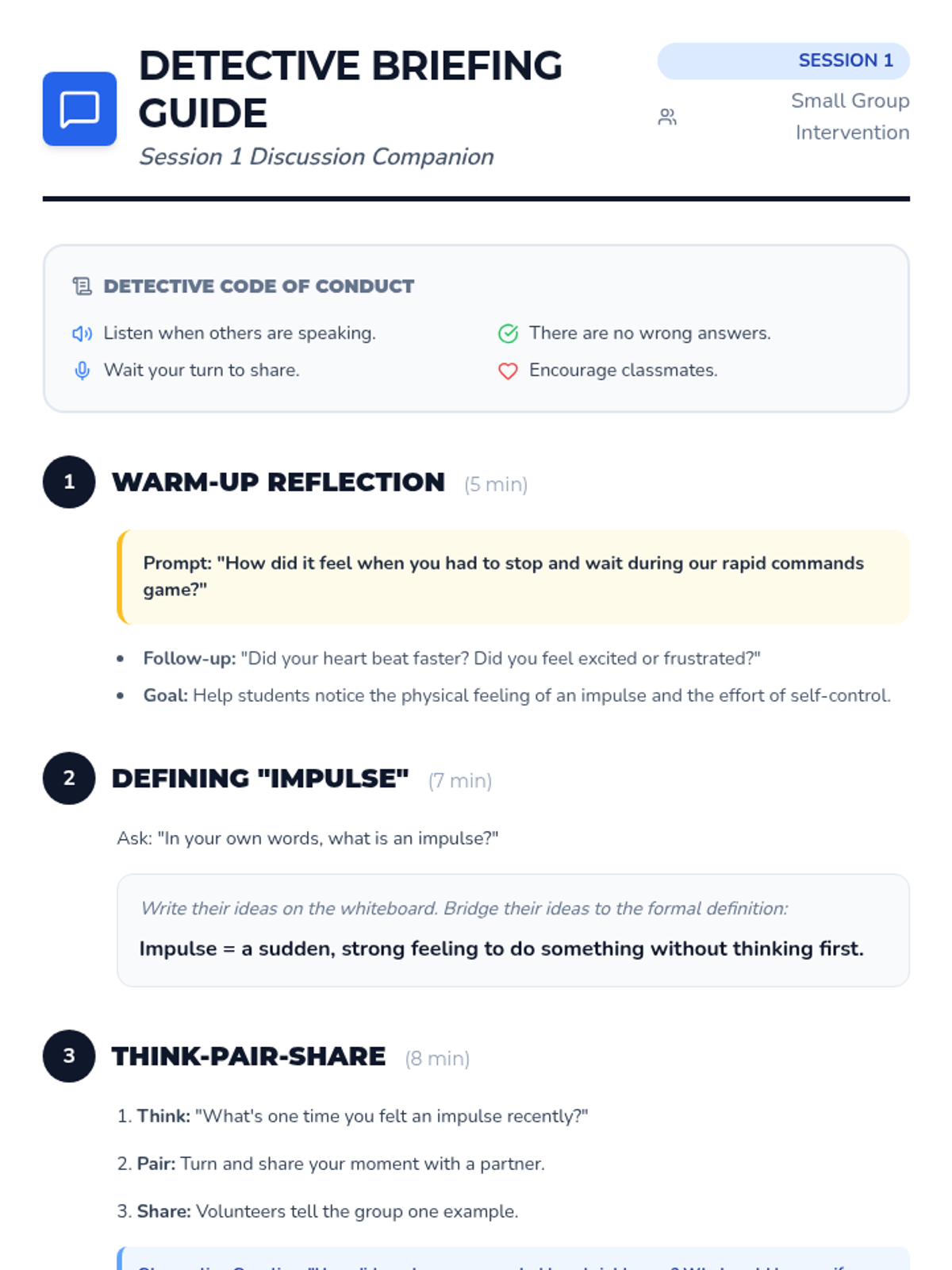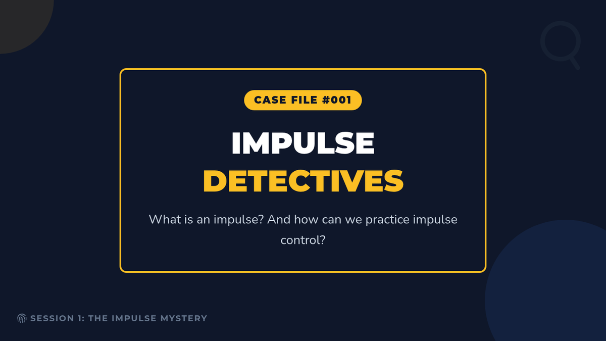 A 6-session small group intervention for 2nd graders focused on developing impulse control and self-regulation skills using a fun detective theme. Students learn to identify impulses, recognize body signals, and apply the Stop-Think-Act strategy to make better choices.
