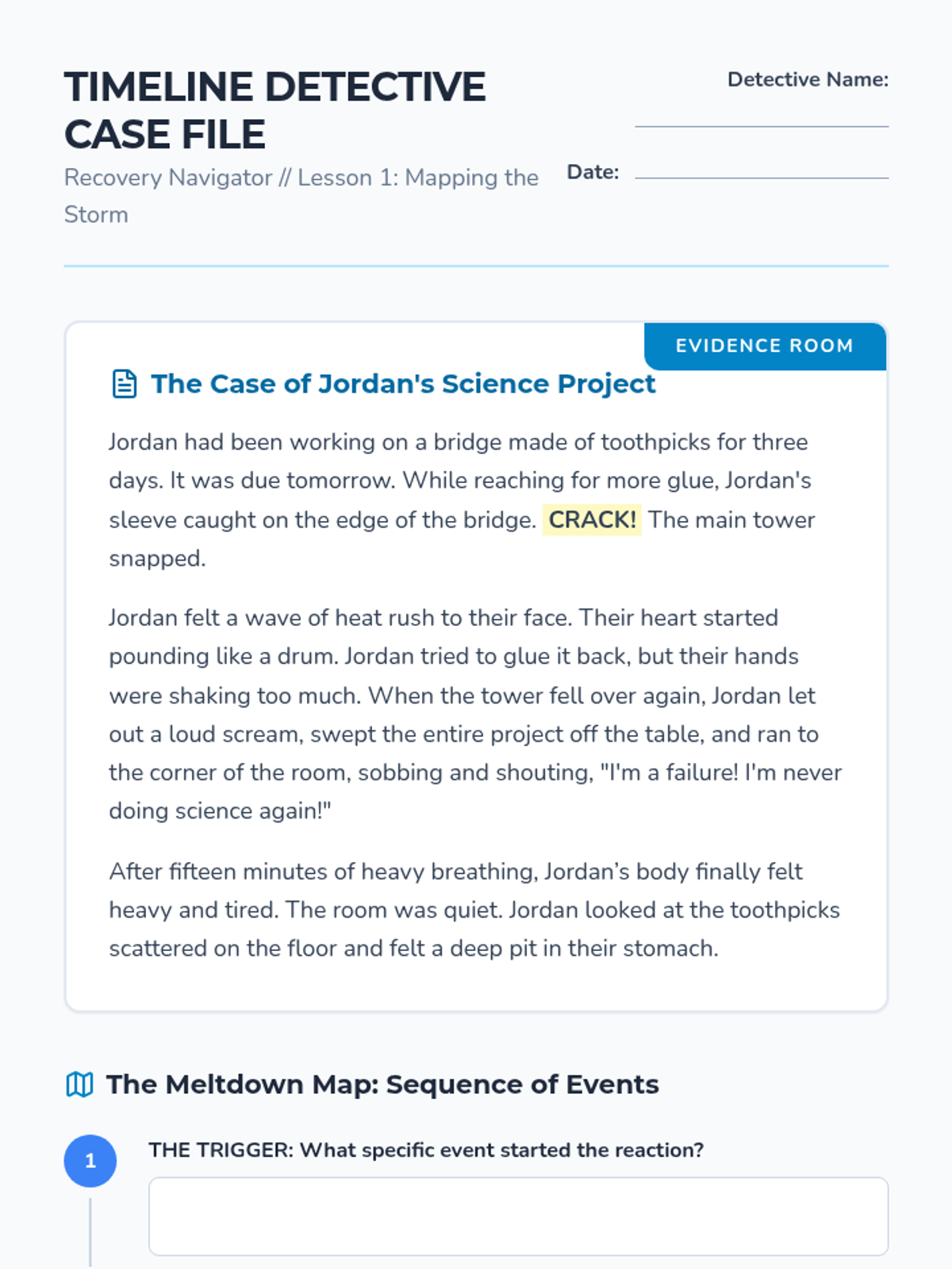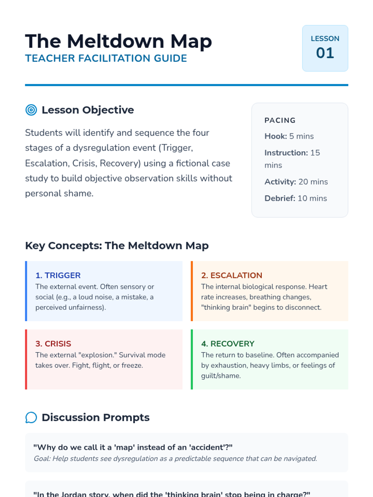 This sequence explores dysregulation recovery through a restorative lens. Students use case studies and fictional scenarios to analyze meltdowns, separate behavior from identity to reduce shame, and master the art of repair conversations. The unit culminates in creating personal debriefing habits and future planning for emotional resilience.