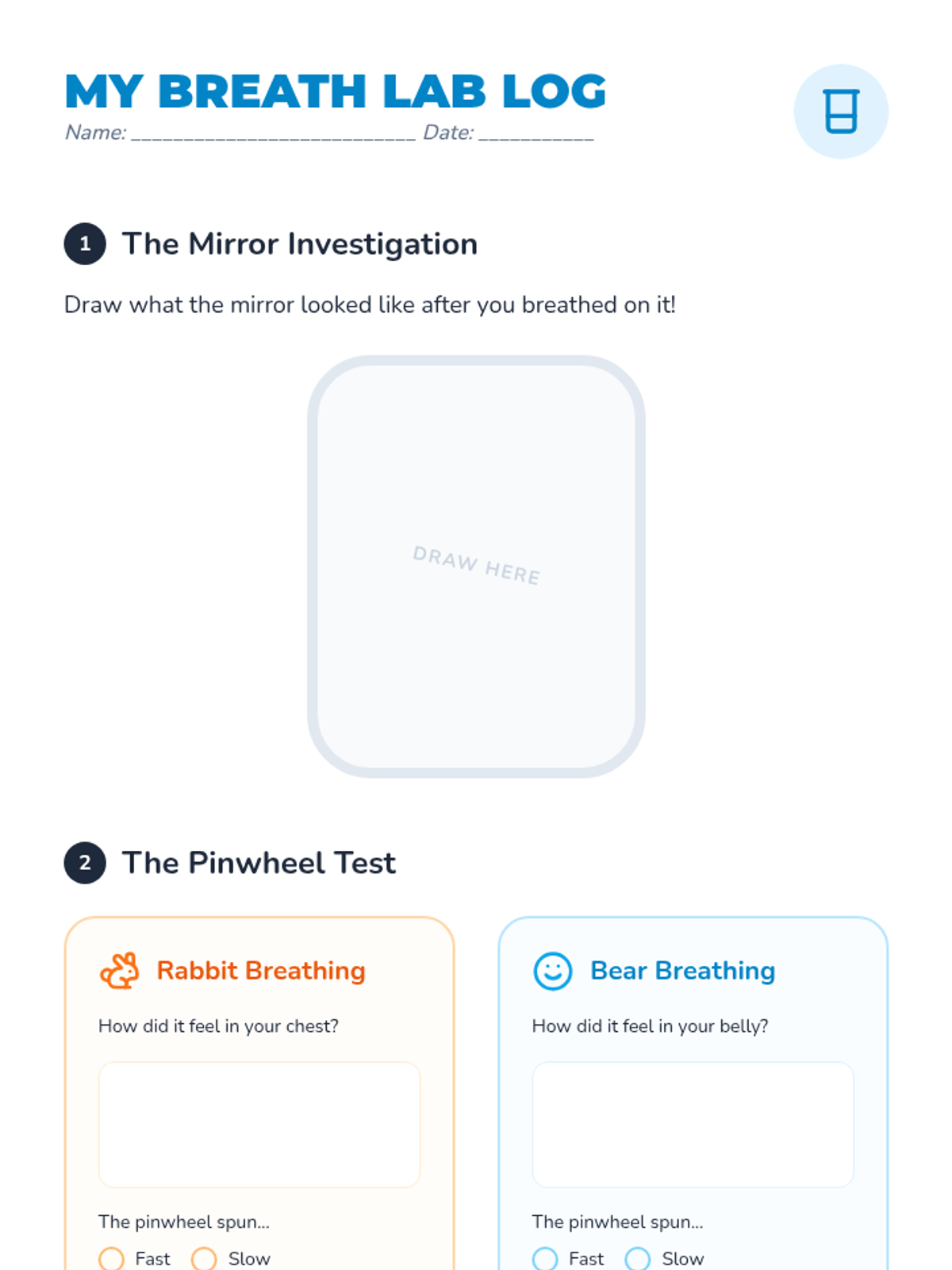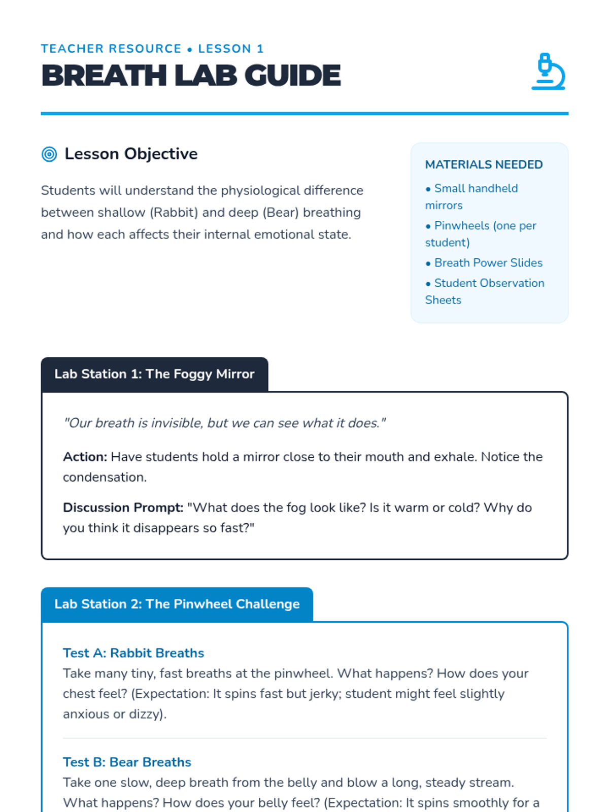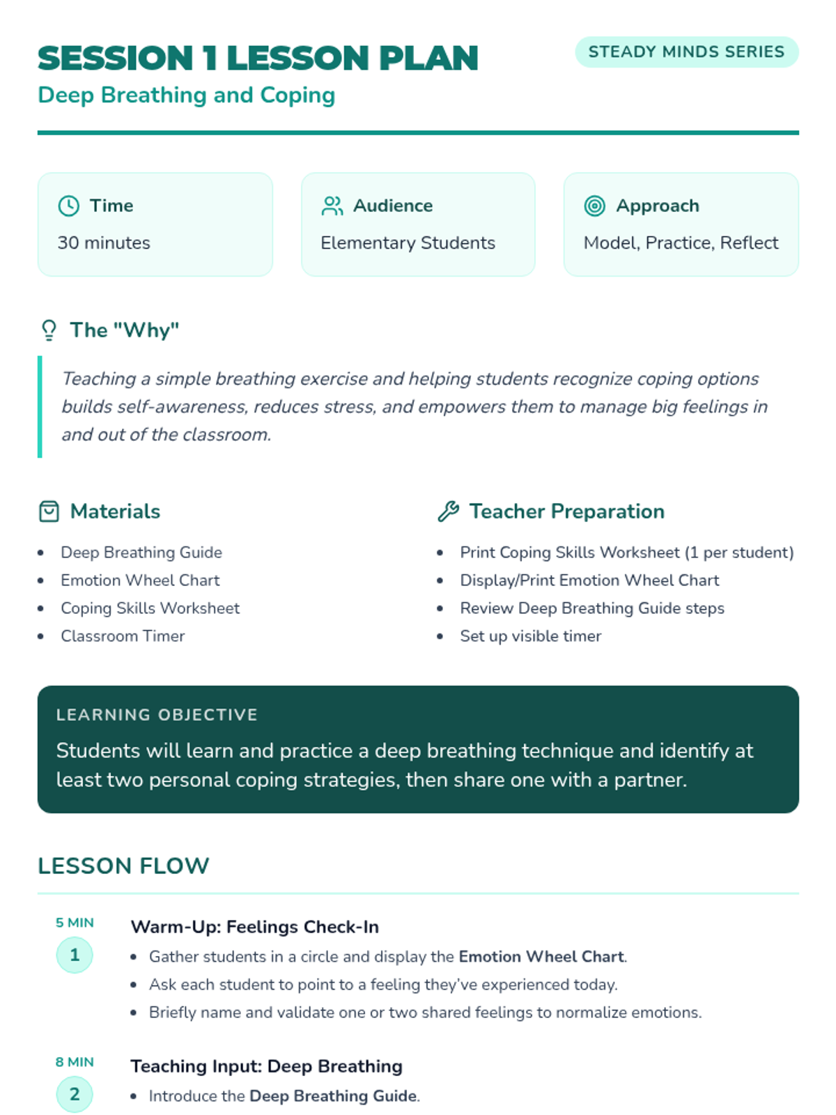 A sequence for 2nd graders to learn breath control and mental visualization as portable grounding strategies. Students progress from concrete breathing props to internal visualizations and self-talk.