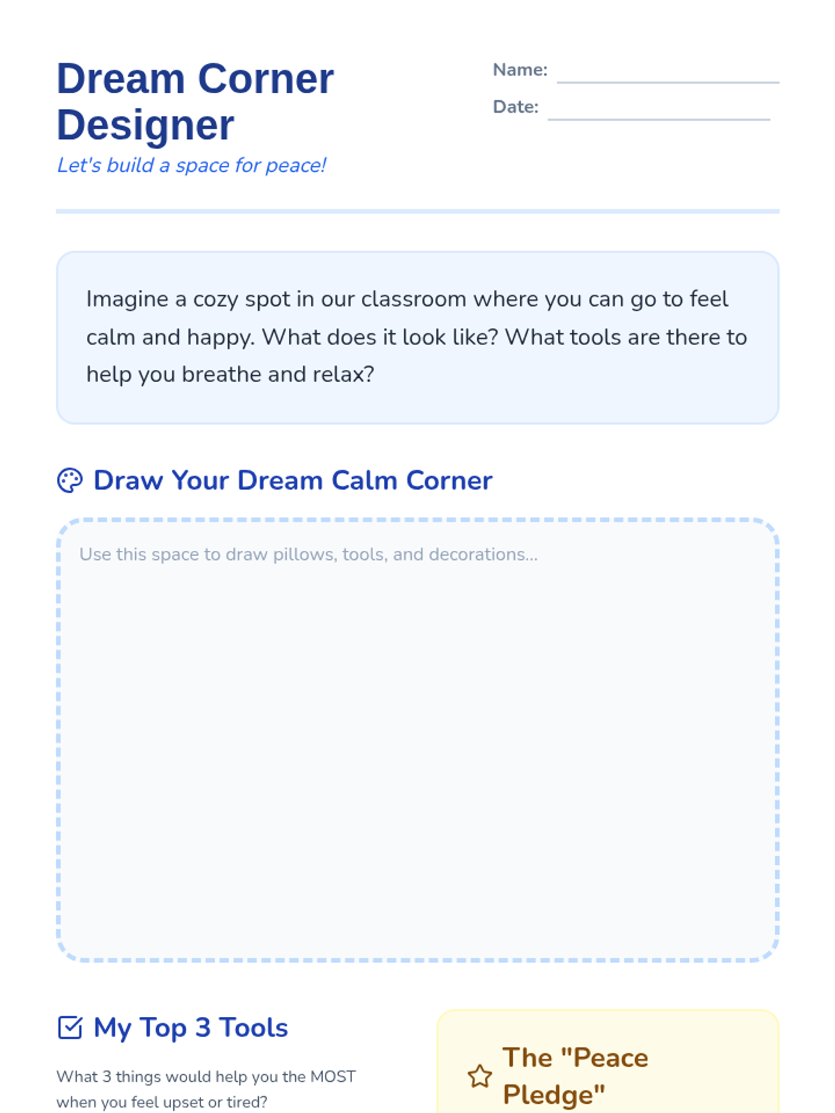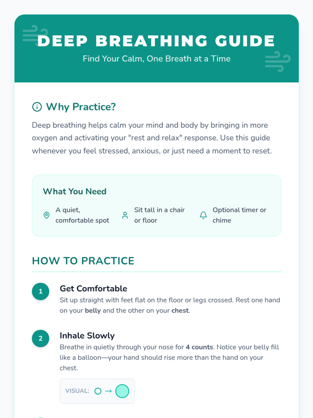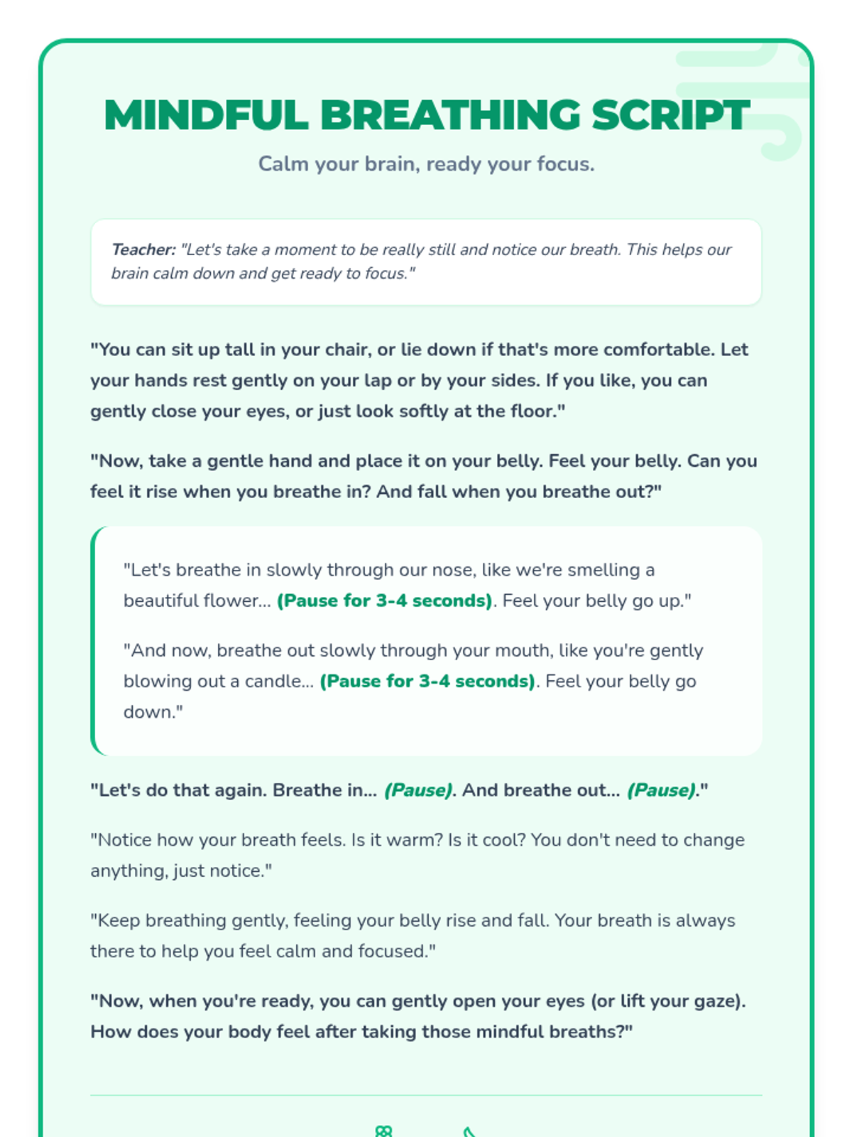 A sequence for 2nd graders to learn breath control and mental visualization as portable grounding strategies. Students progress from concrete breathing props to internal visualizations and self-talk.