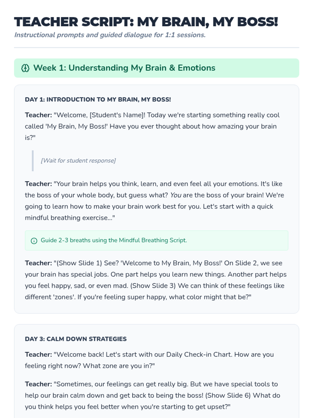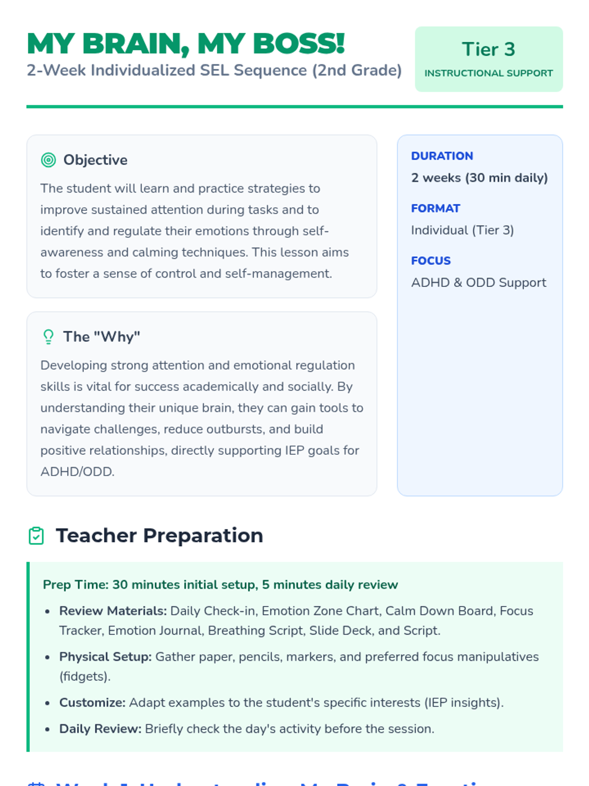 A comprehensive two-week social-emotional learning sequence for 2nd-grade students focusing on attention and emotional regulation. Students learn to understand their brain, identify emotional zones, use calming strategies, and build focus muscles.