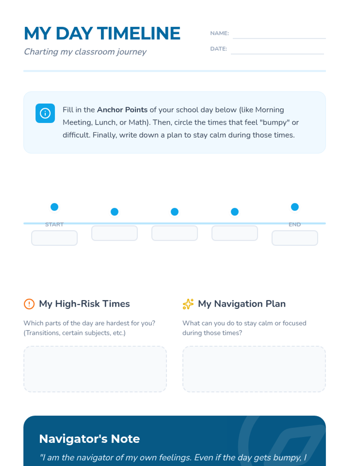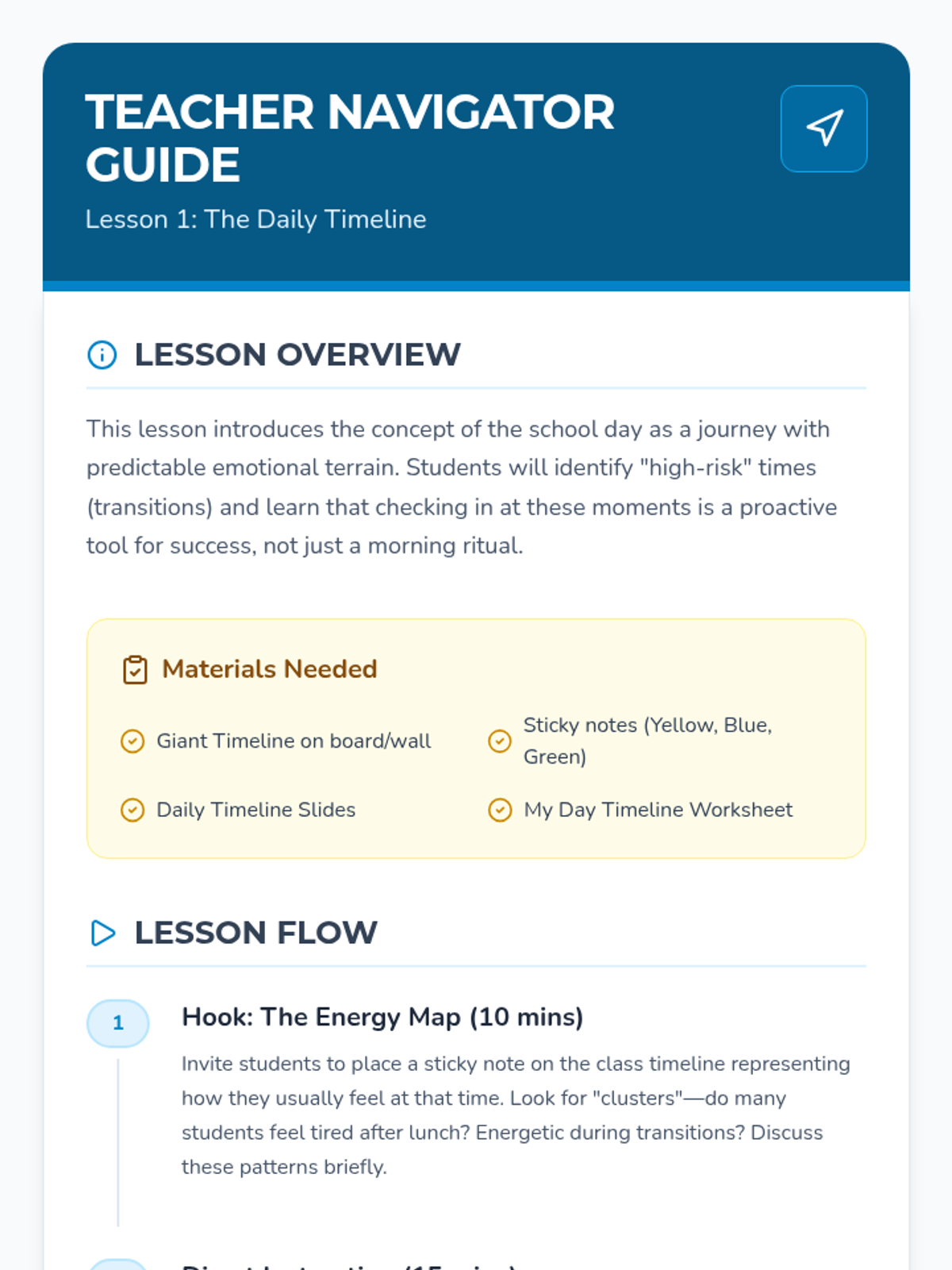 A 5-lesson project-based sequence where 2nd-grade students learn to create their own social narratives (Life Navigator Guides) to manage challenging school routines through self-awareness and positive self-talk.