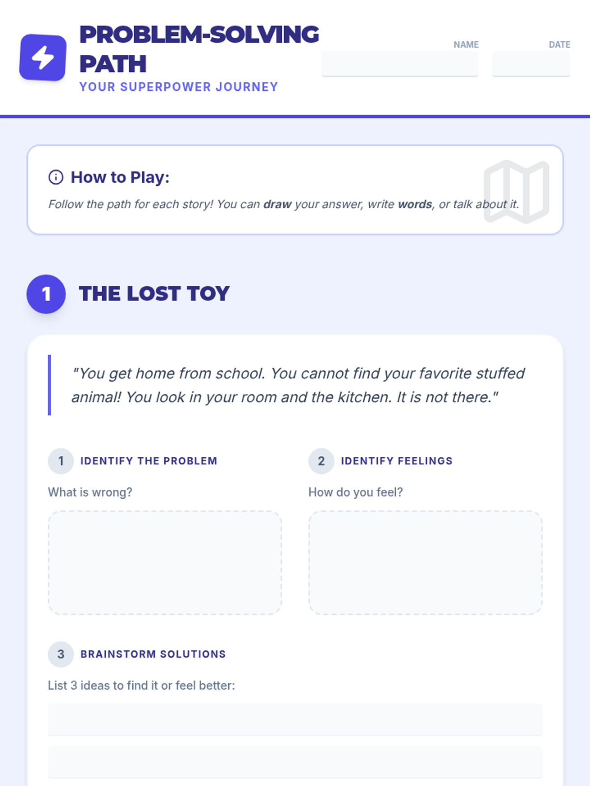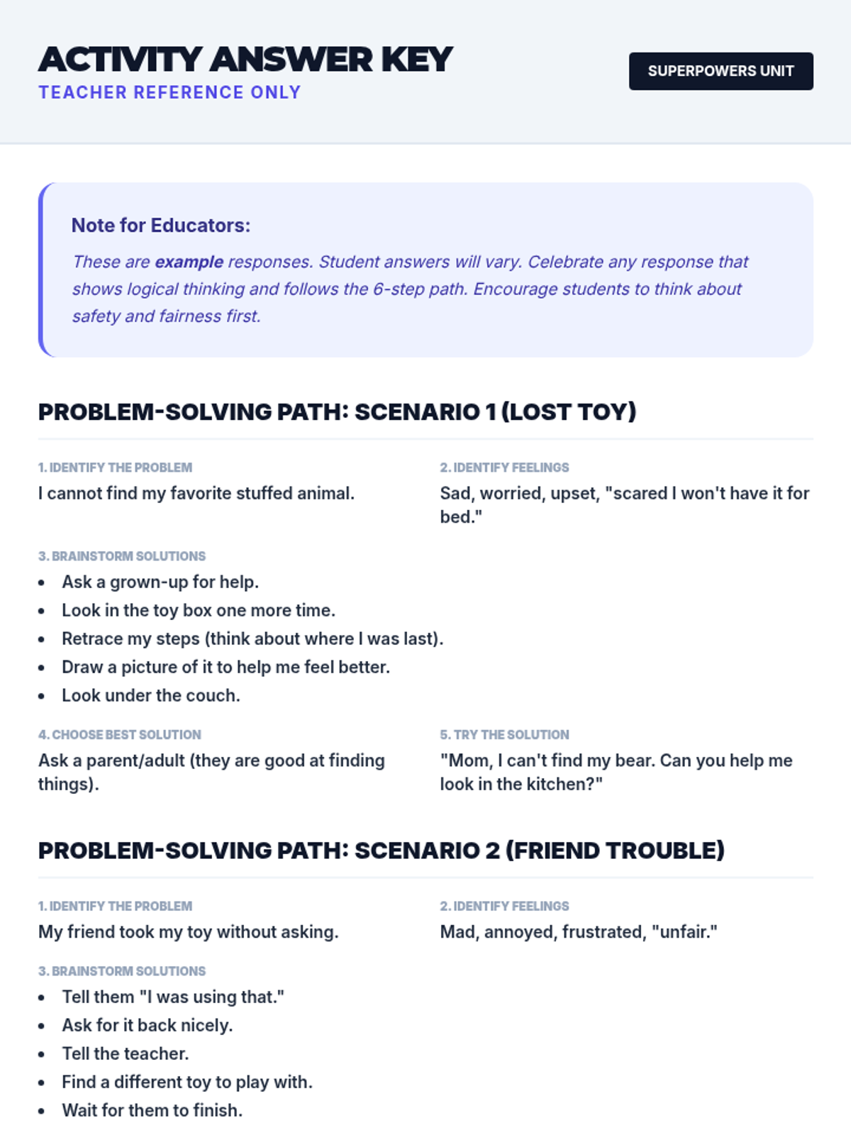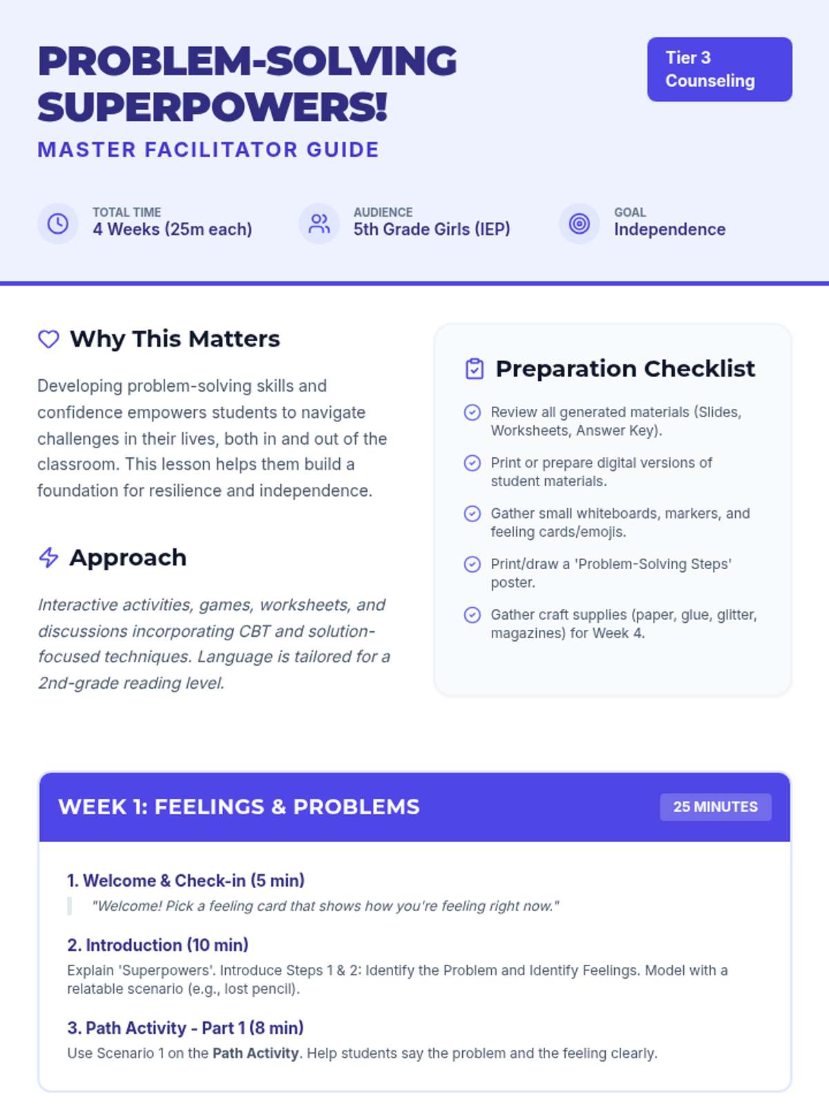 A 4-week, Tier 3 individual counseling sequence for 5th-grade students functioning at a 2nd-grade level. This unit uses a superhero theme to teach a 6-step problem-solving process through CBT and solution-focused strategies.