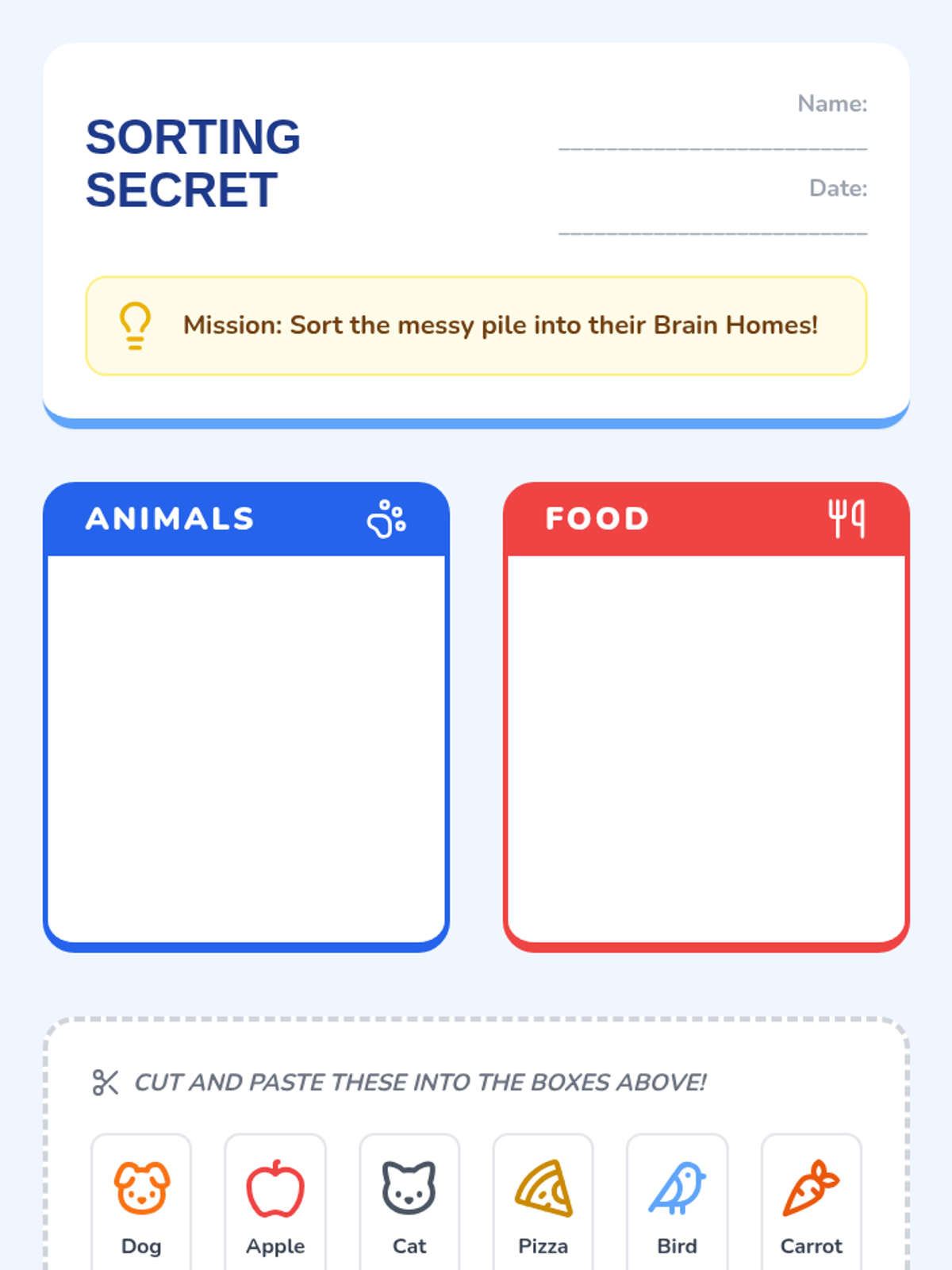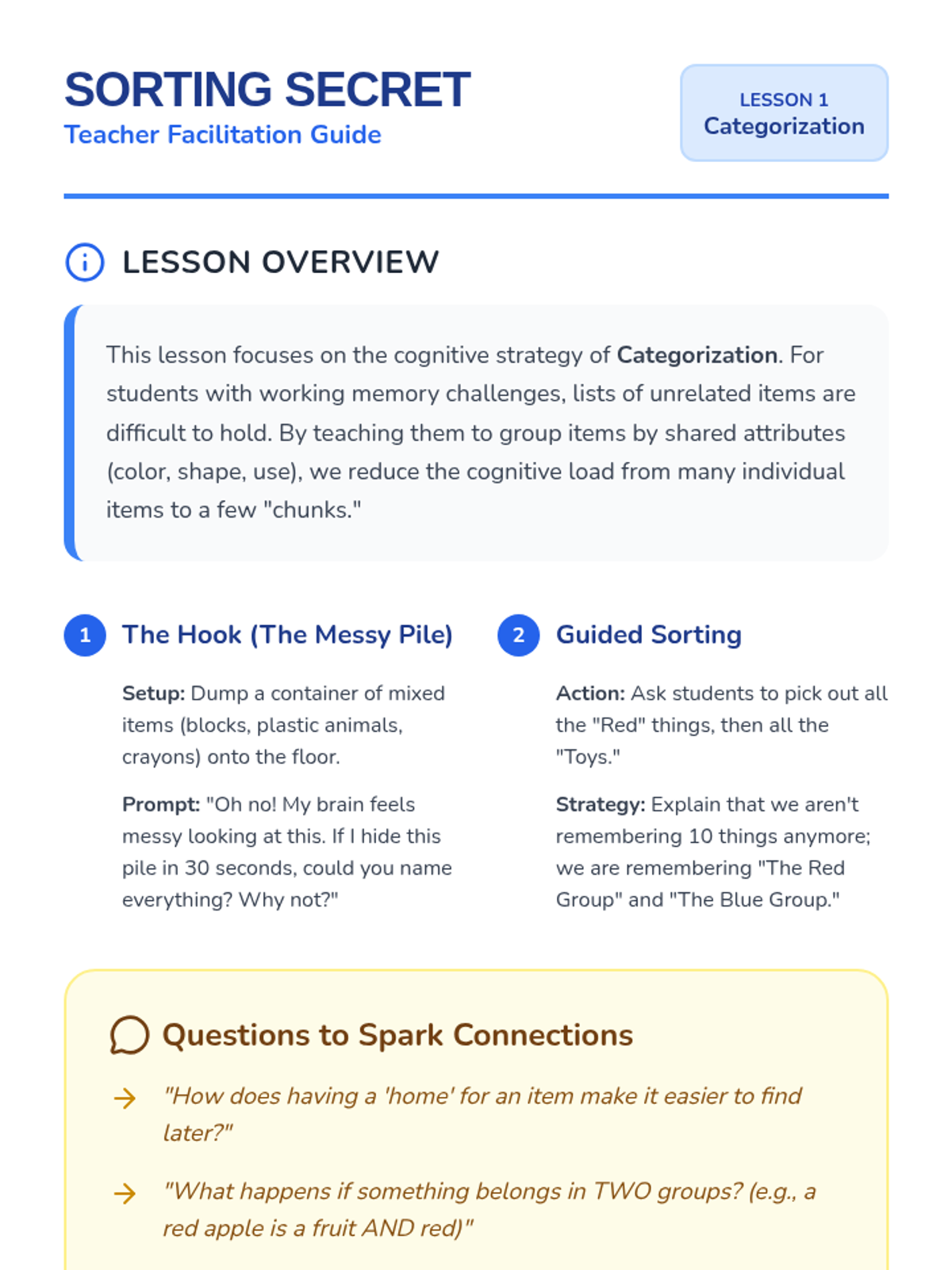 A foundational sequence for 1st-grade students to develop working memory strategies using association and grouping. Students progress from basic sorting to advanced mnemonic techniques like story chaining and initial letter cues to enhance information retention.