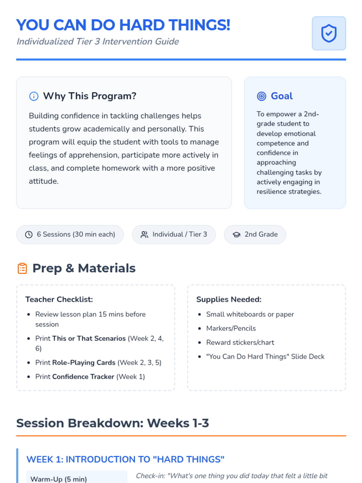 A 6-week individualized Tier 3 program designed to help 2nd-grade students build emotional competence and resilience when facing challenging tasks through role-playing and growth mindset strategies.