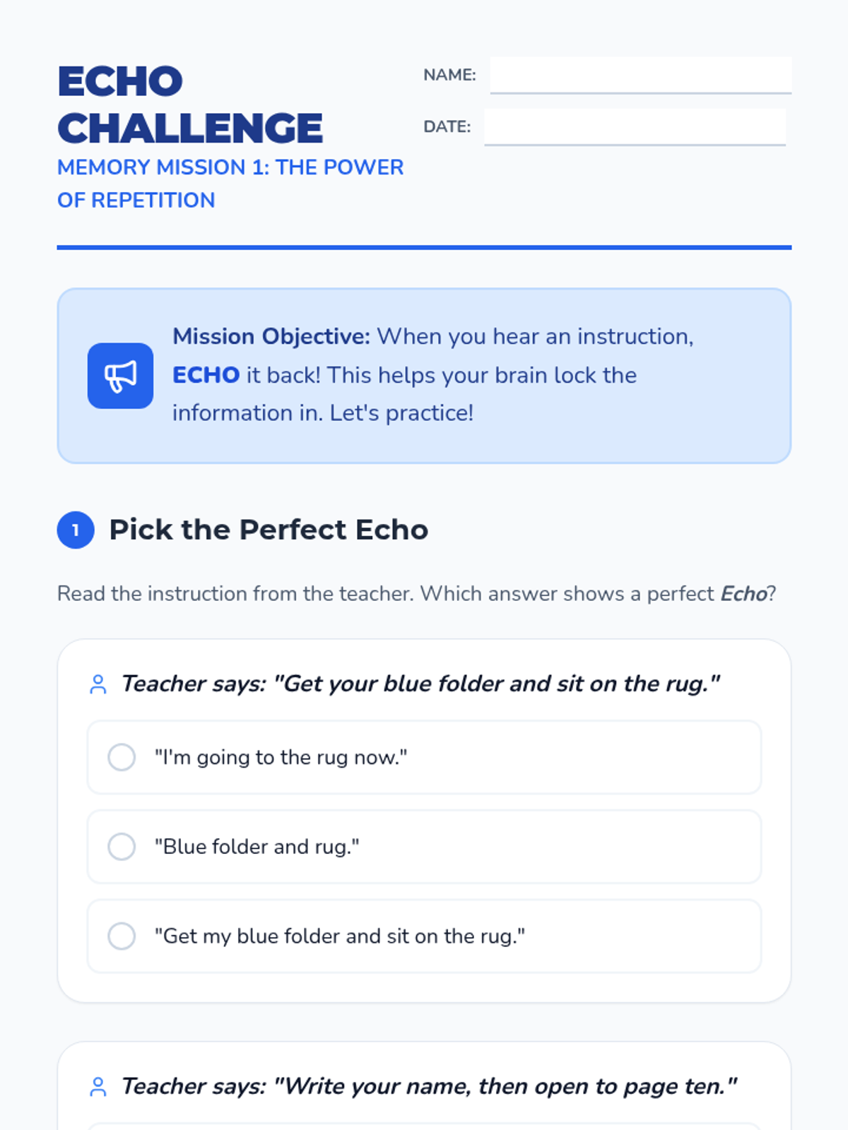 This sequence focuses on auditory processing and the cognitive strategy of verbal rehearsal (self-talk) to hold information in working memory. Students learn to 'catch' a verbal instruction, repeat it to themselves or a peer, and then execute it.
