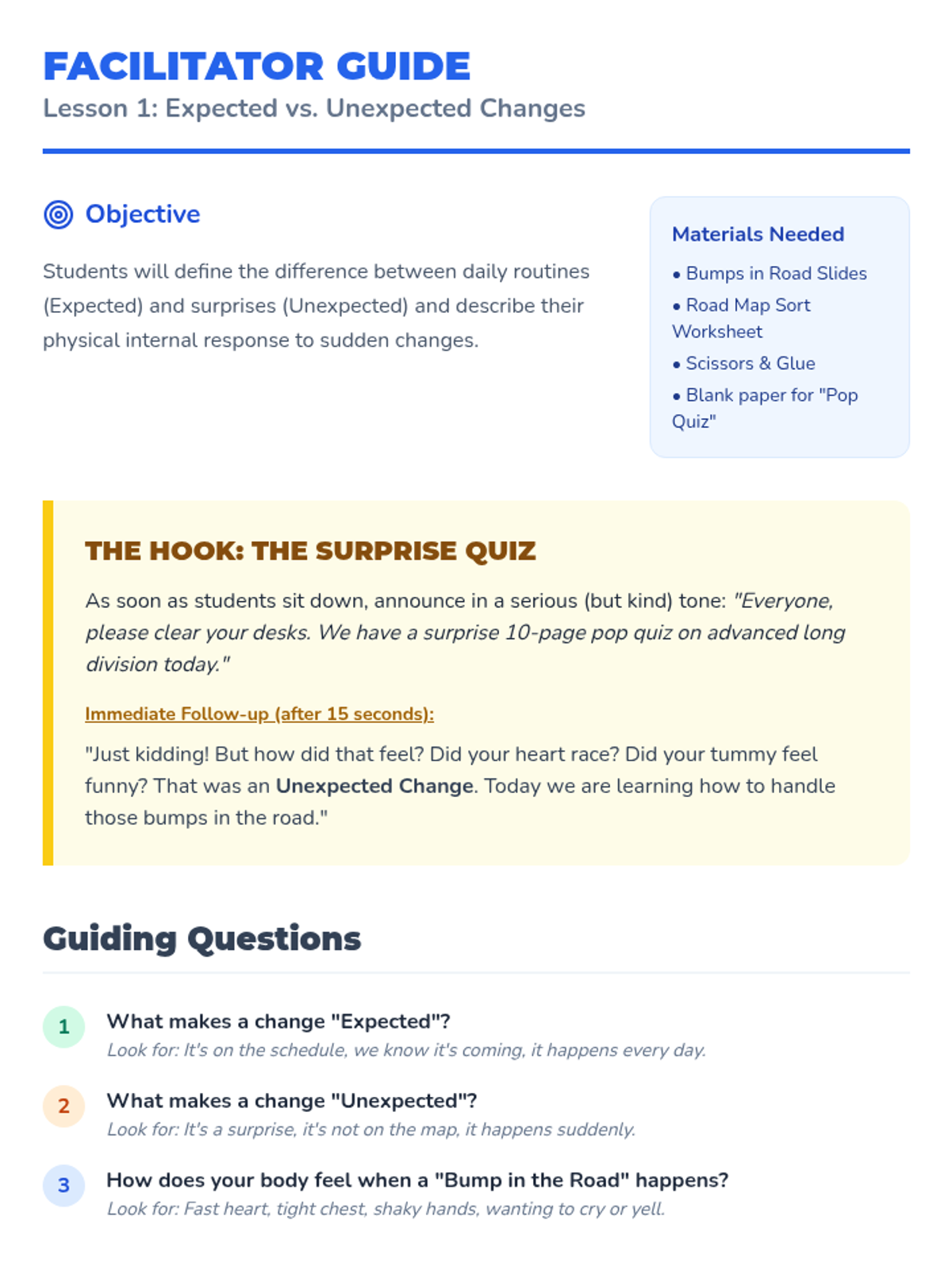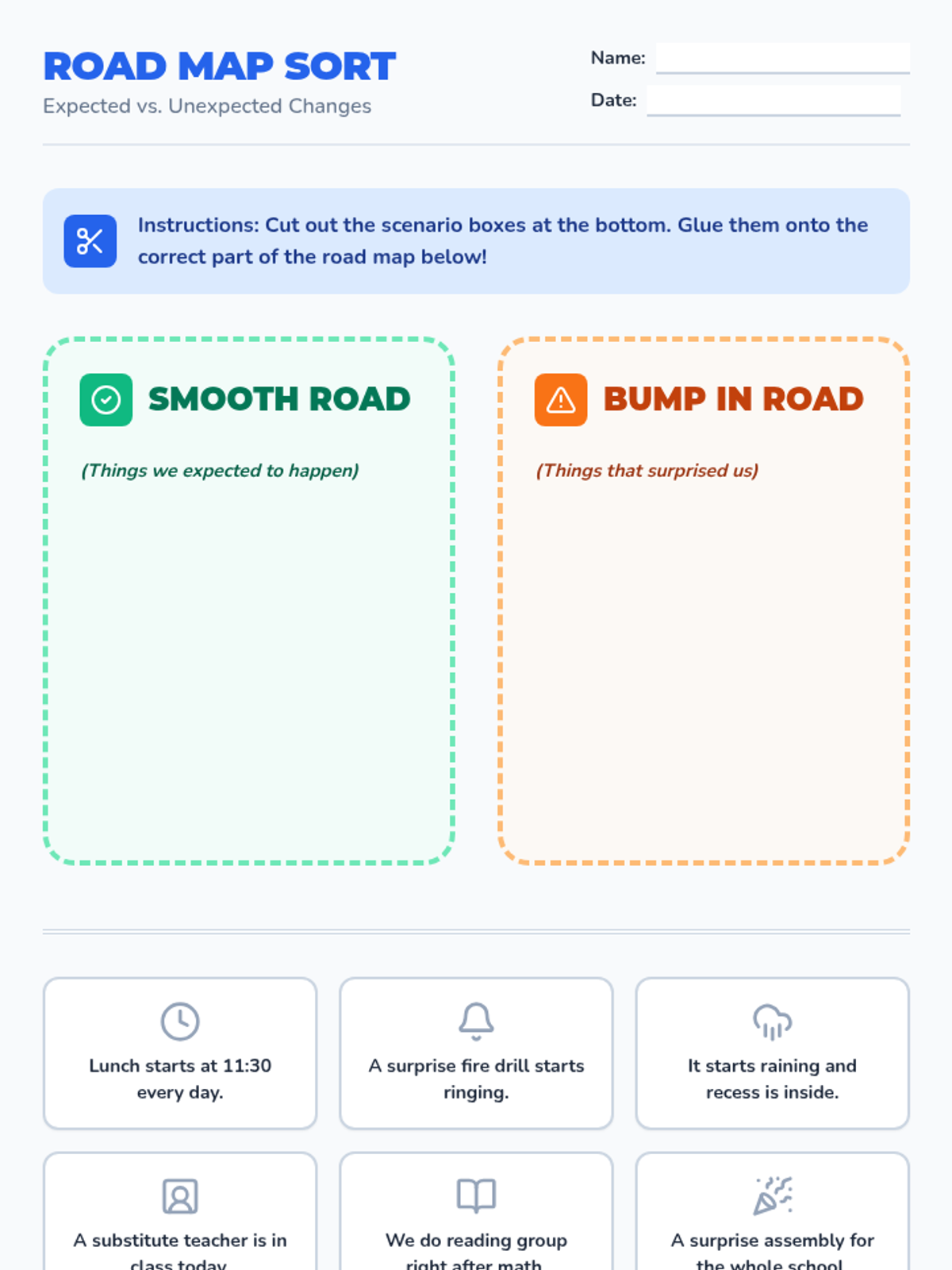 This sequence helps 2nd-grade students navigate unexpected changes and transitions. Using social stories and practical coping tools, students learn to identify their feelings, practice calming strategies, and develop flexible 'Plan B' thinking to handle life's 'bumps in the road'.