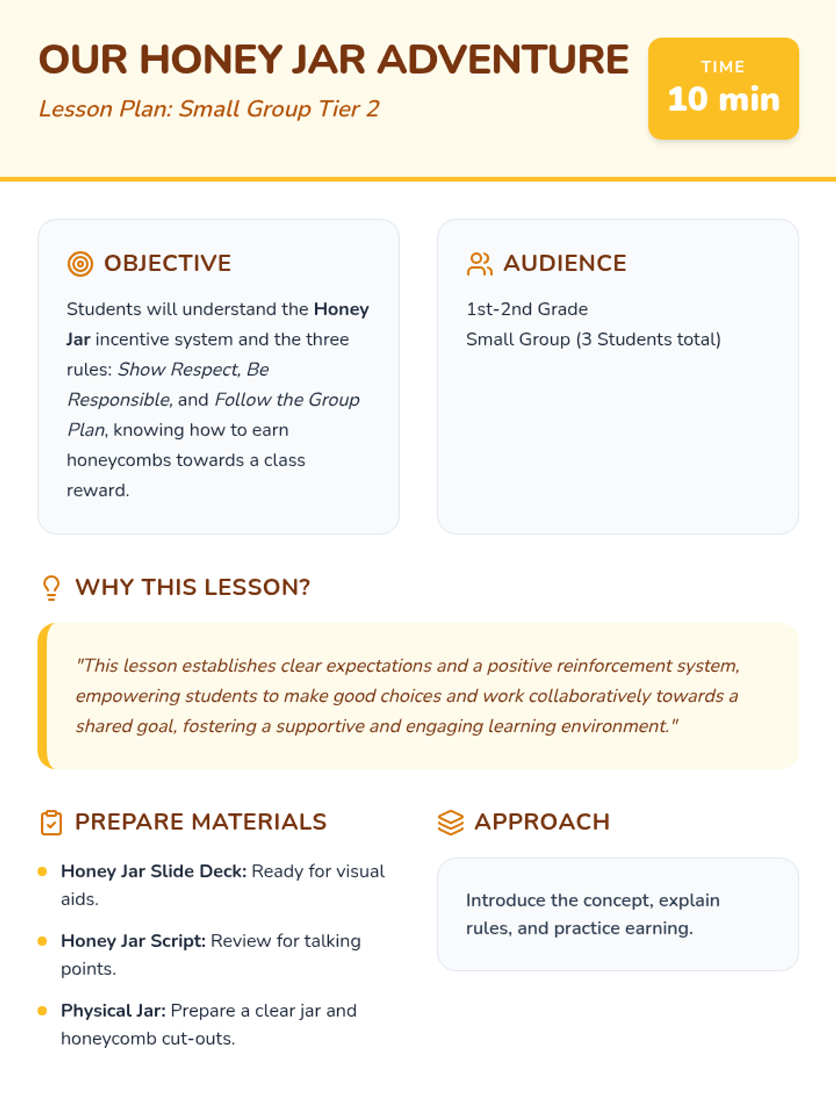 A short, engaging lesson to introduce the Honey Jar incentive system to small groups of 1st-2nd grade students, focusing on teamwork and positive behavior.
