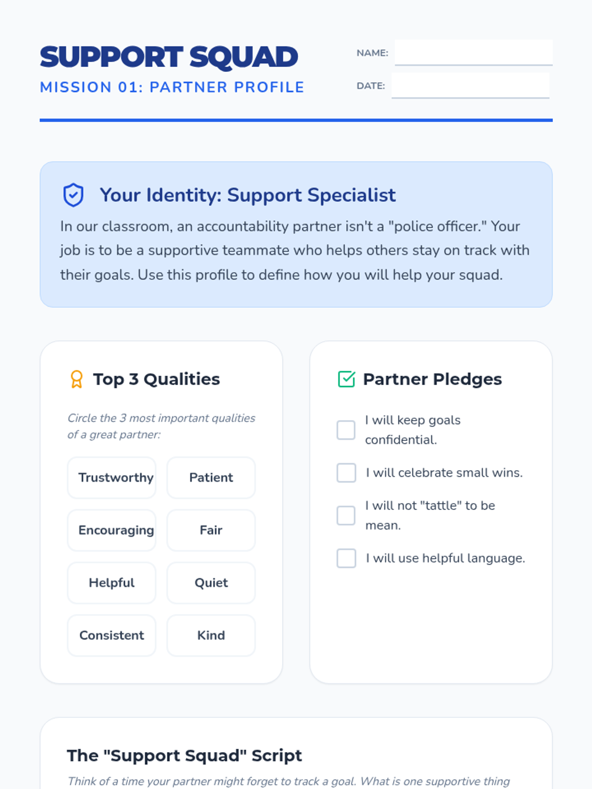 Focusing on the social aspect of behavioral growth, this sequence introduces peer accountability and collaborative goal setting. Students participate in simulations to learn how to be supportive accountability partners without being critical. The sequence builds social-emotional skills by teaching students that individual tracking contributes to the community environment.