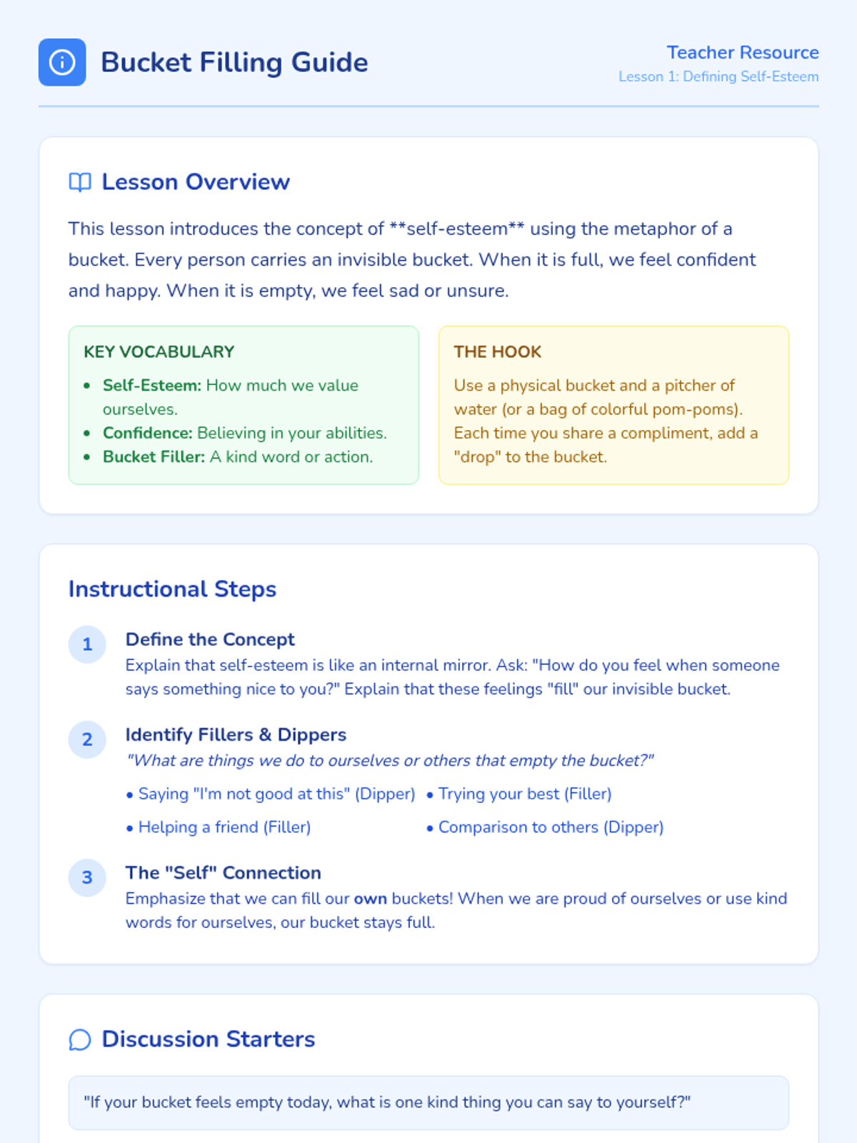 A 5-lesson sequence for 2nd graders focused on building self-esteem and a growth mindset. Students learn to navigate mistakes, use positive self-talk, and handle criticism through the metaphor of a garden that needs tending and a bucket that needs filling.