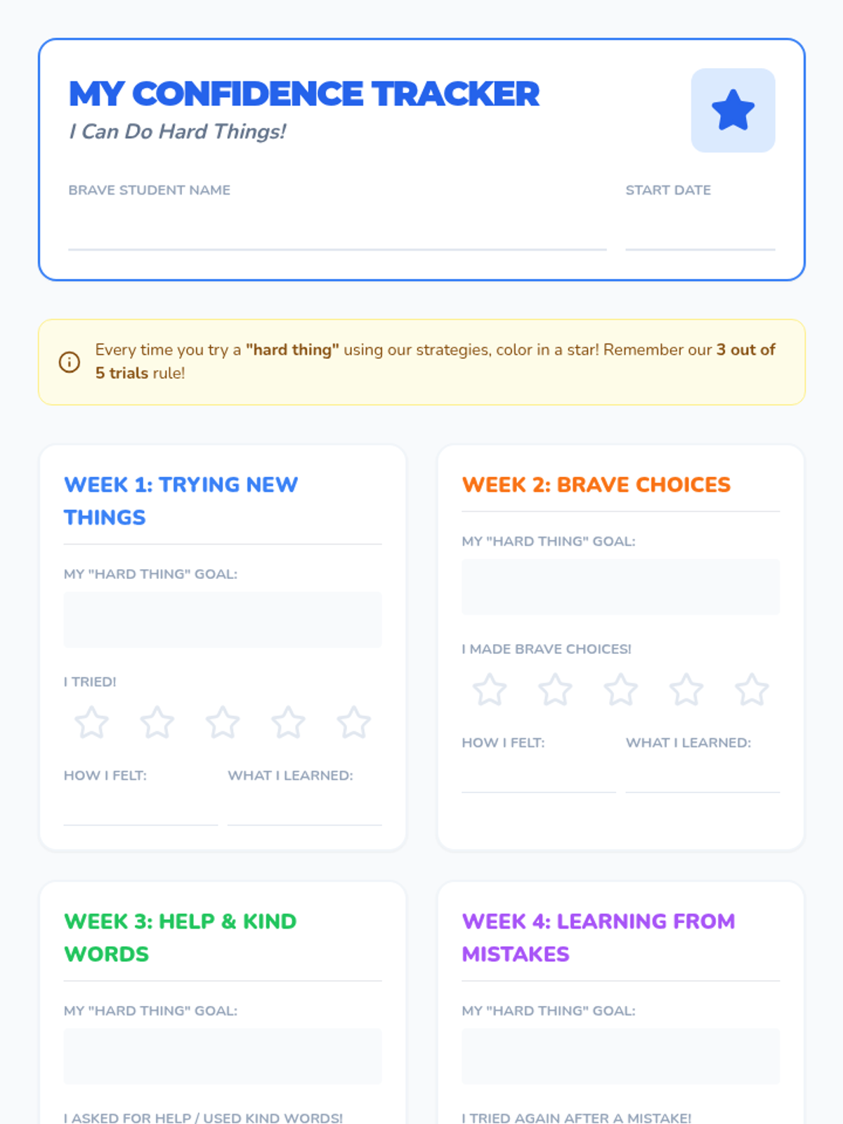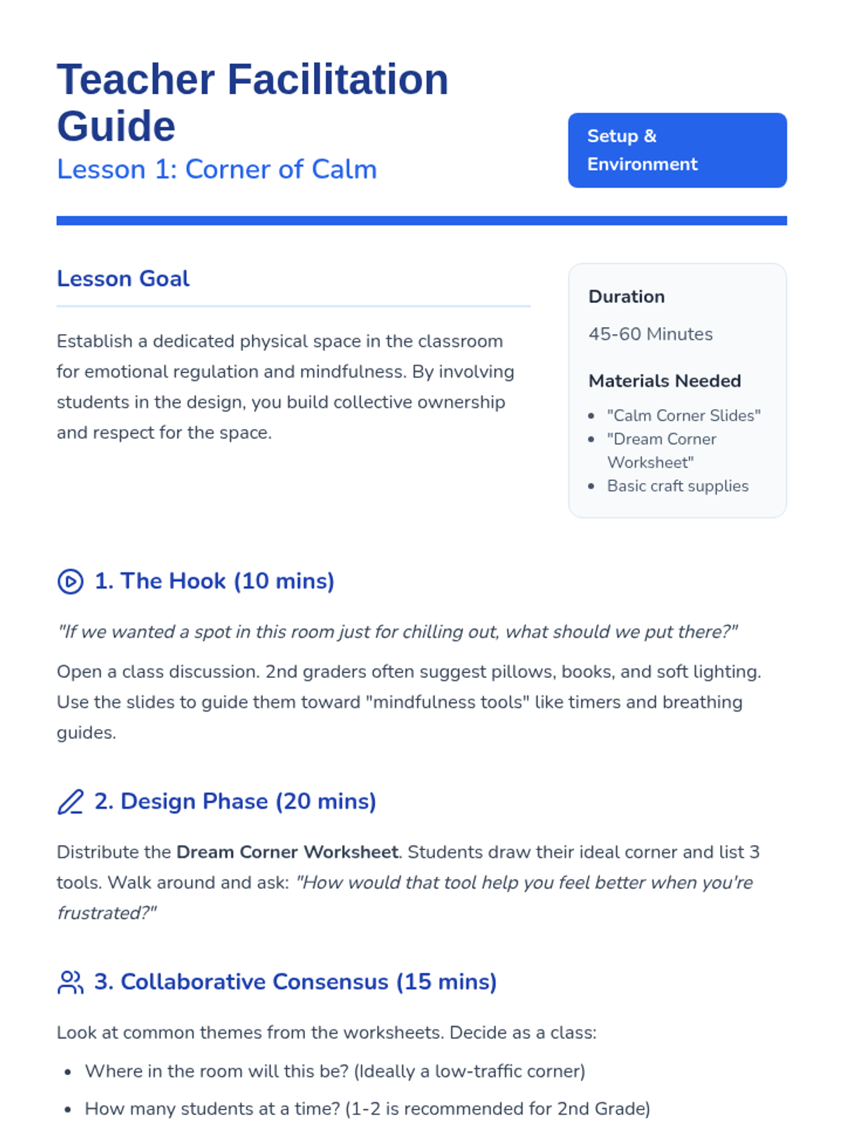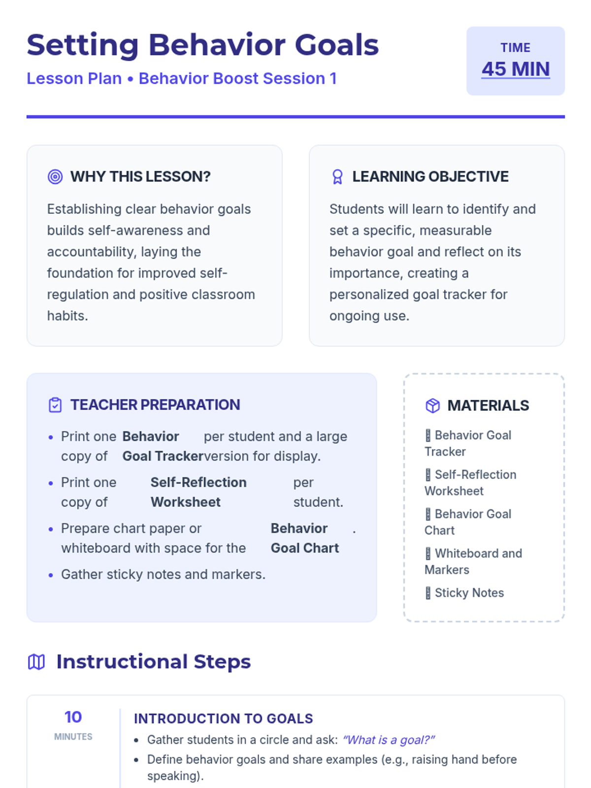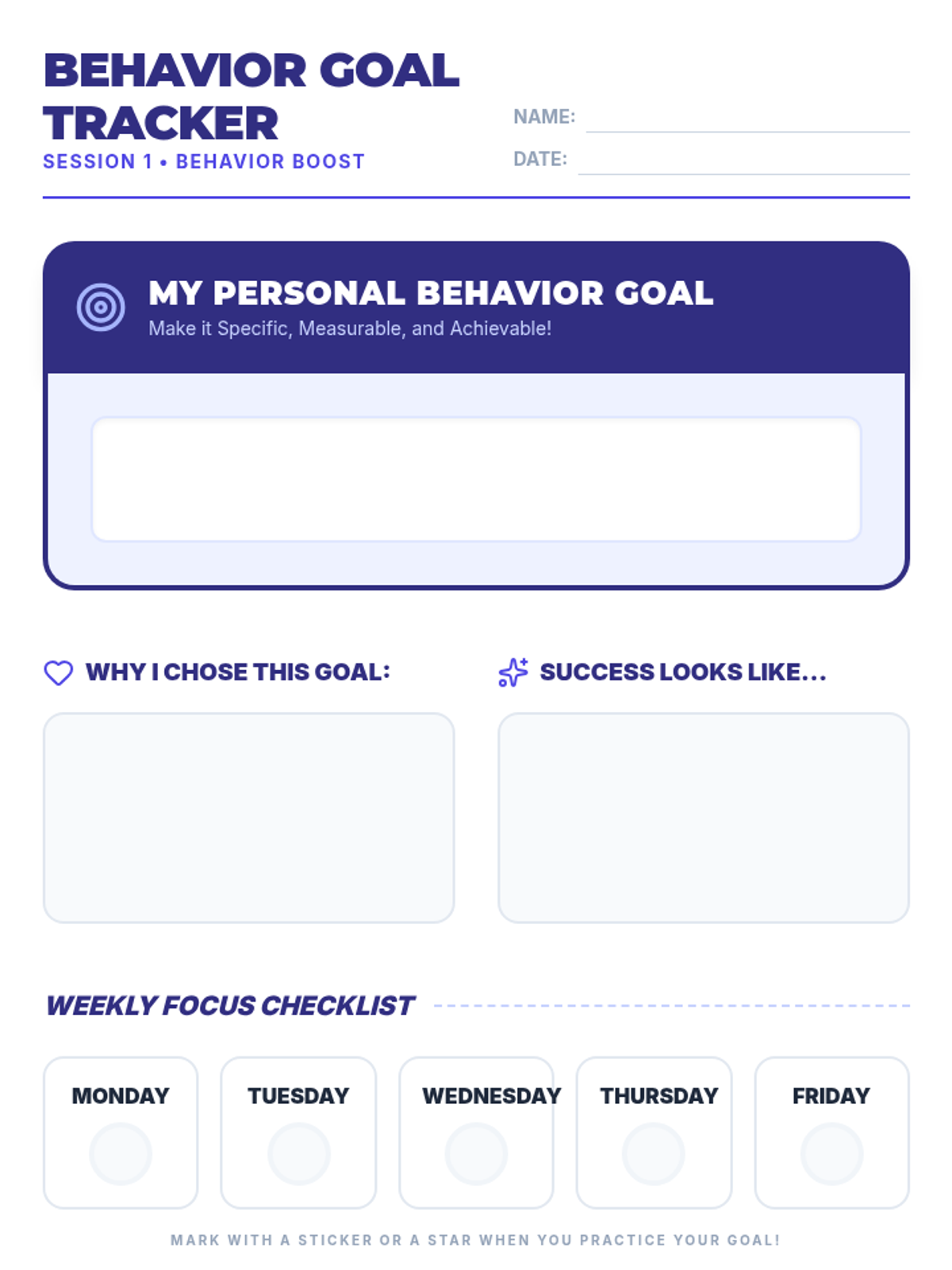 A comprehensive sequence for 2nd-grade students to transition from emotional check-ins to actionable behavioral goal setting. Students learn to set reachable goals, design personal tracking tools, and perform mid-day and end-of-day reflections to build autonomy and resilience.
