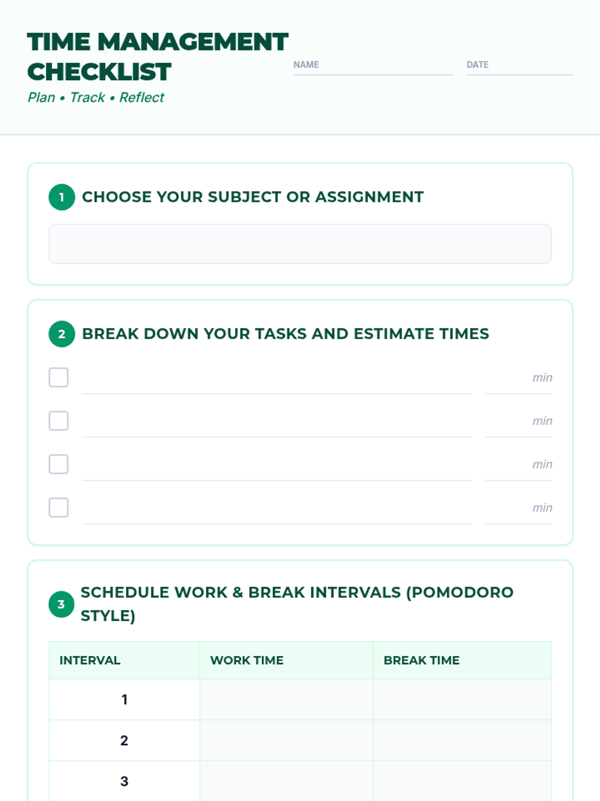 This sequence helps students overcome task initiation hurdles by combining visualization and verbal self-talk. Students learn to 'see' the finished product, reverse engineer the steps, estimate time accurately, and use micro-goals to take the first step.