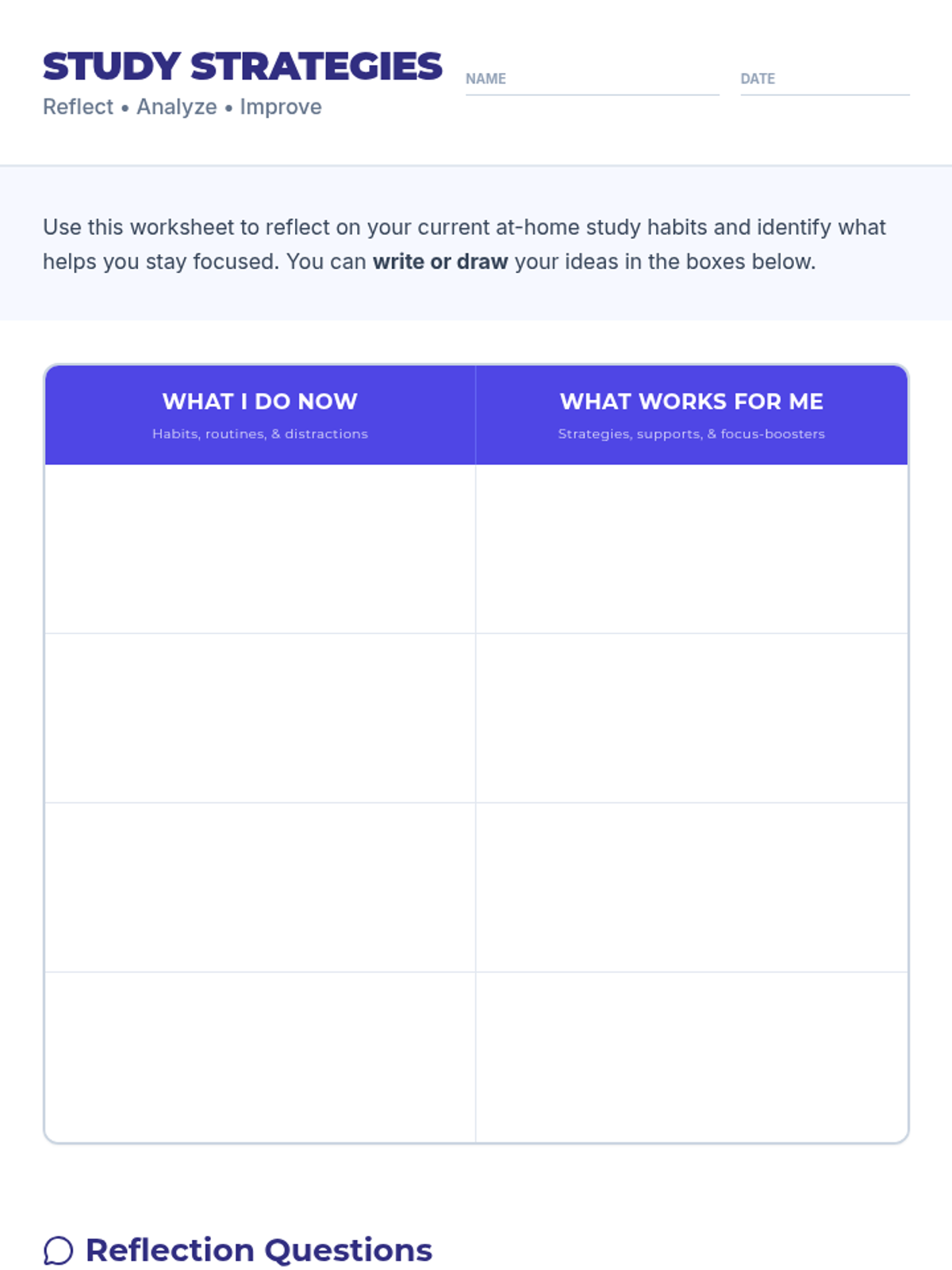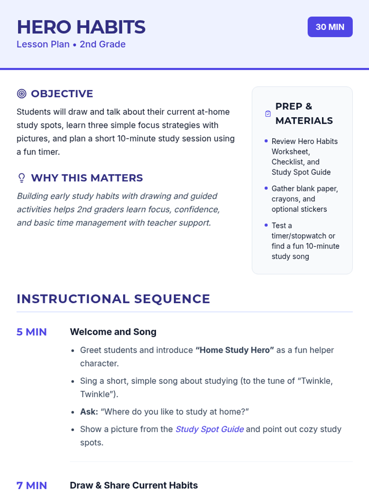 This sequence provides age-appropriate sessions for building effective at-home study routines, ranging from primary grade 'Home Study Hero' activities to middle school 'Homework Power-Up' collaborative planning. Students and parents learn to optimize their environment, manage time with the Pomodoro Technique, and reflect on their growth as learners.