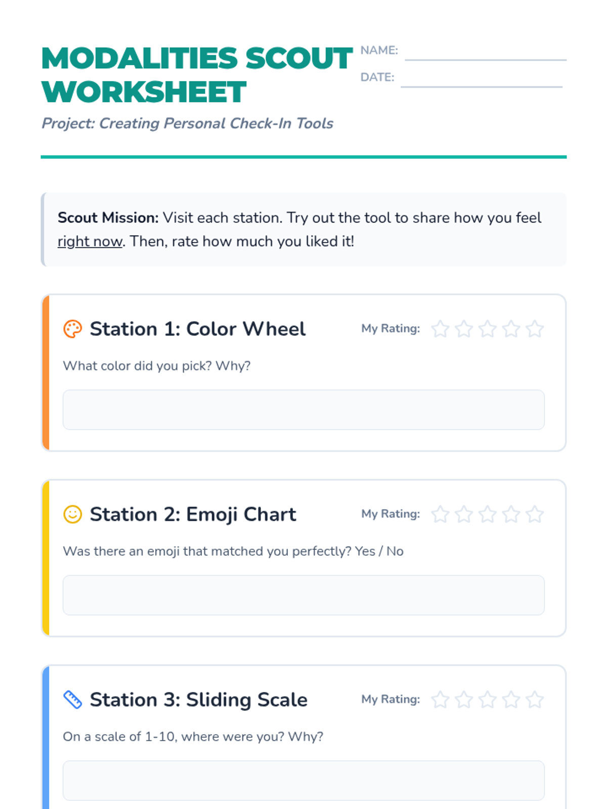 Students design and create their own personalized check-in tools to foster ownership over the behavioral check-in process. The sequence moves from exploration of different modalities to the design, construction, and implementation of a personal 'Check-In Toolkit'.