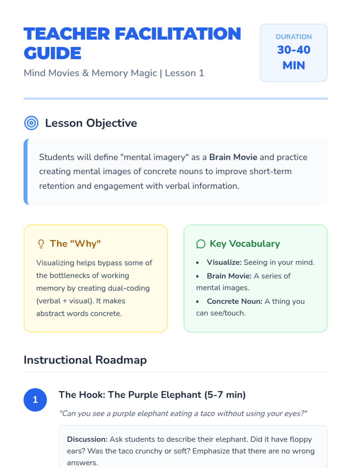 This sequence teaches 2nd grade students how to use visualization and mnemonic linking to improve working memory and information retention. Students move from visualizing simple objects to connecting complex ideas through 'brain movies' and narrative chaining.