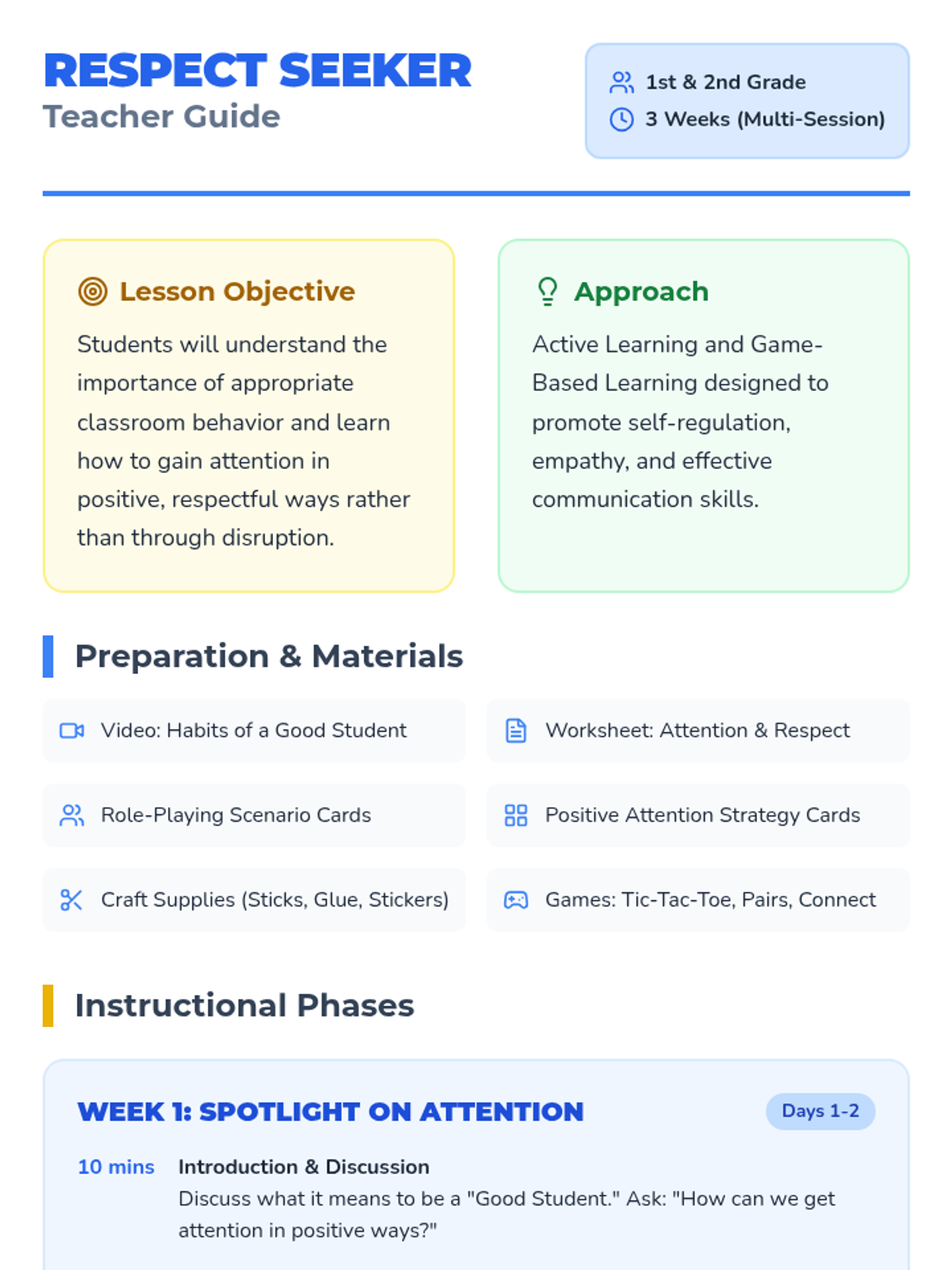 A three-week sequence for 1st and 2nd graders to learn appropriate classroom behavior, focusing on positive attention-seeking strategies, self-regulation, and respectful communication through games and role-play.
