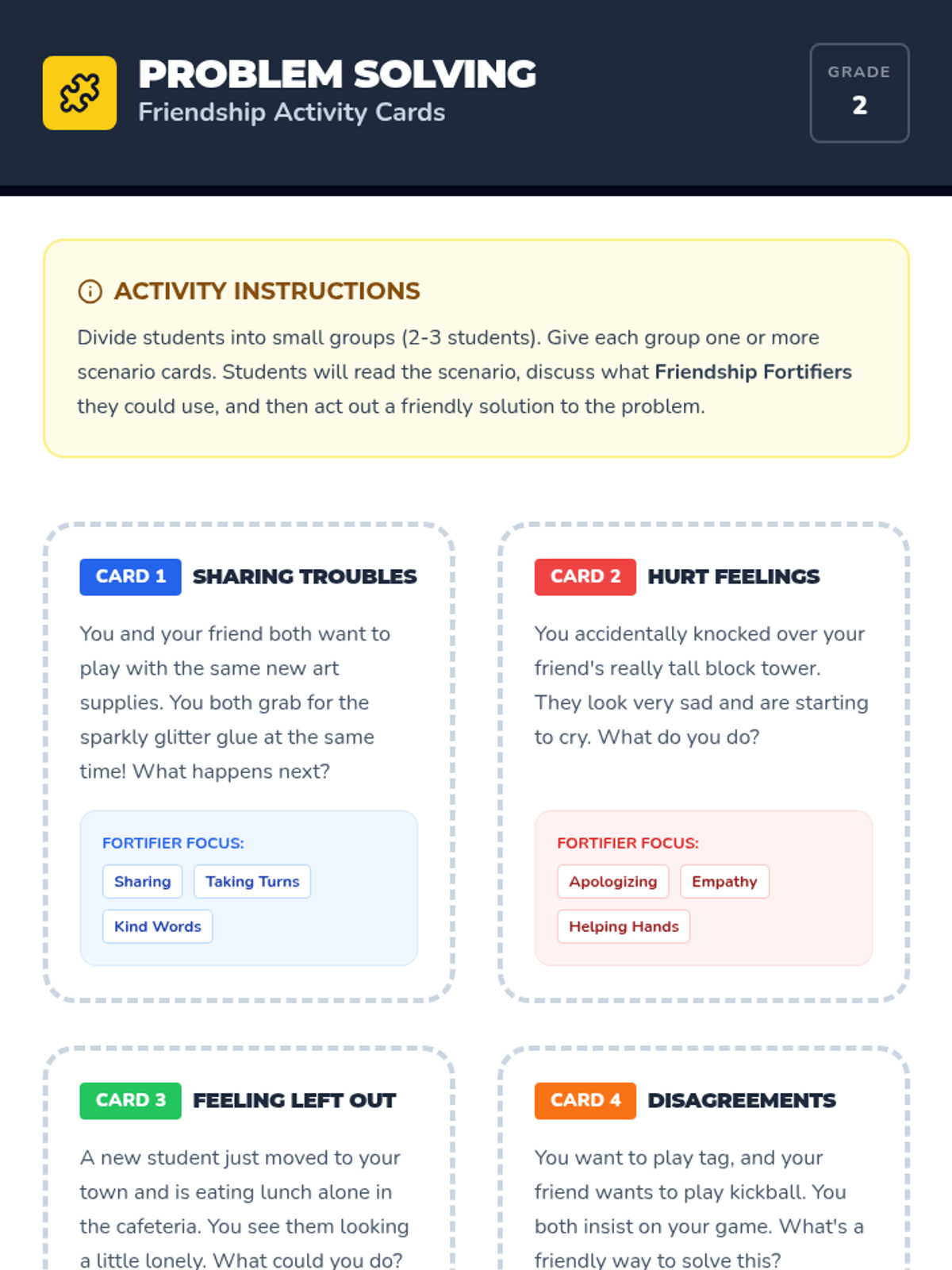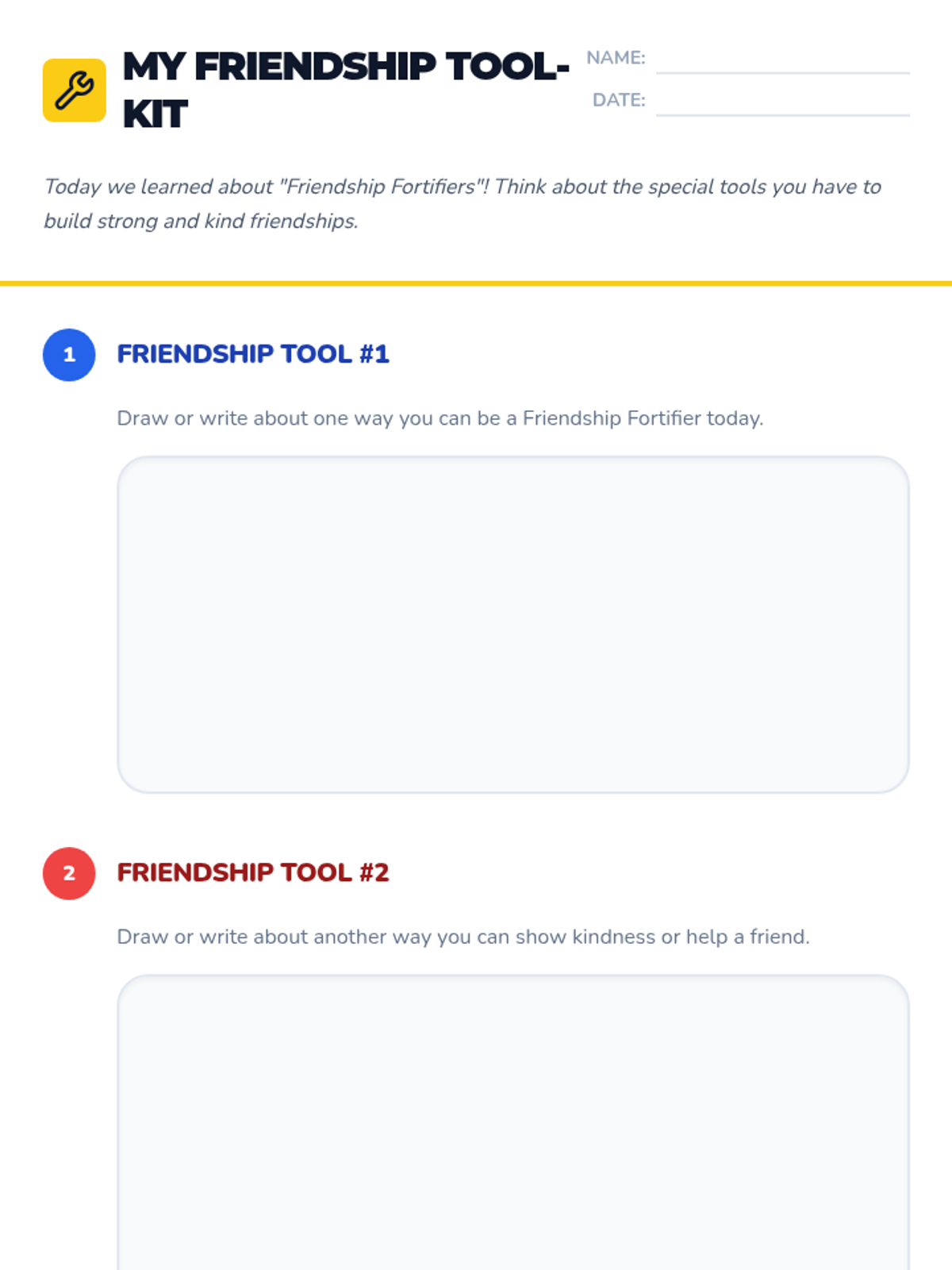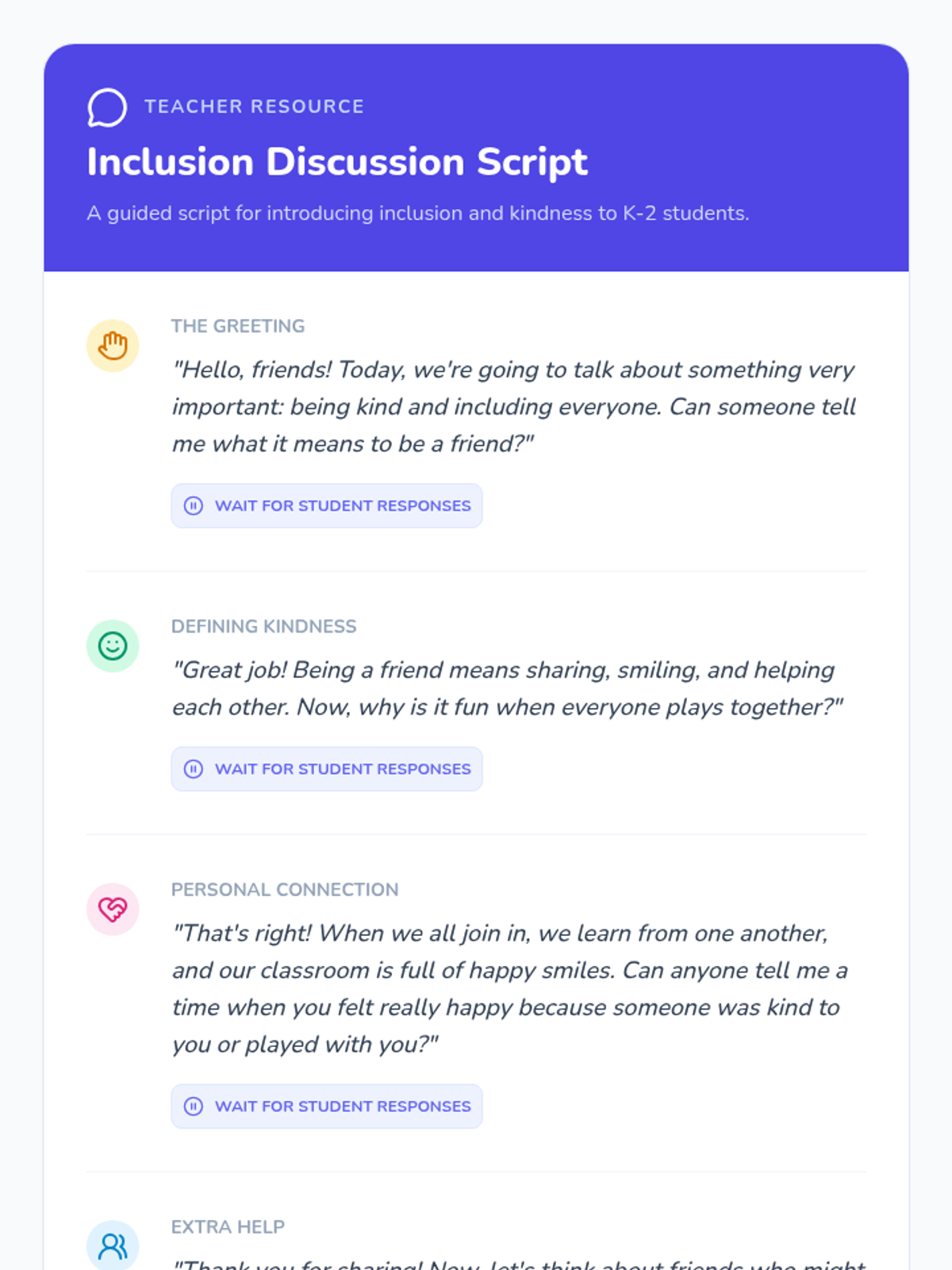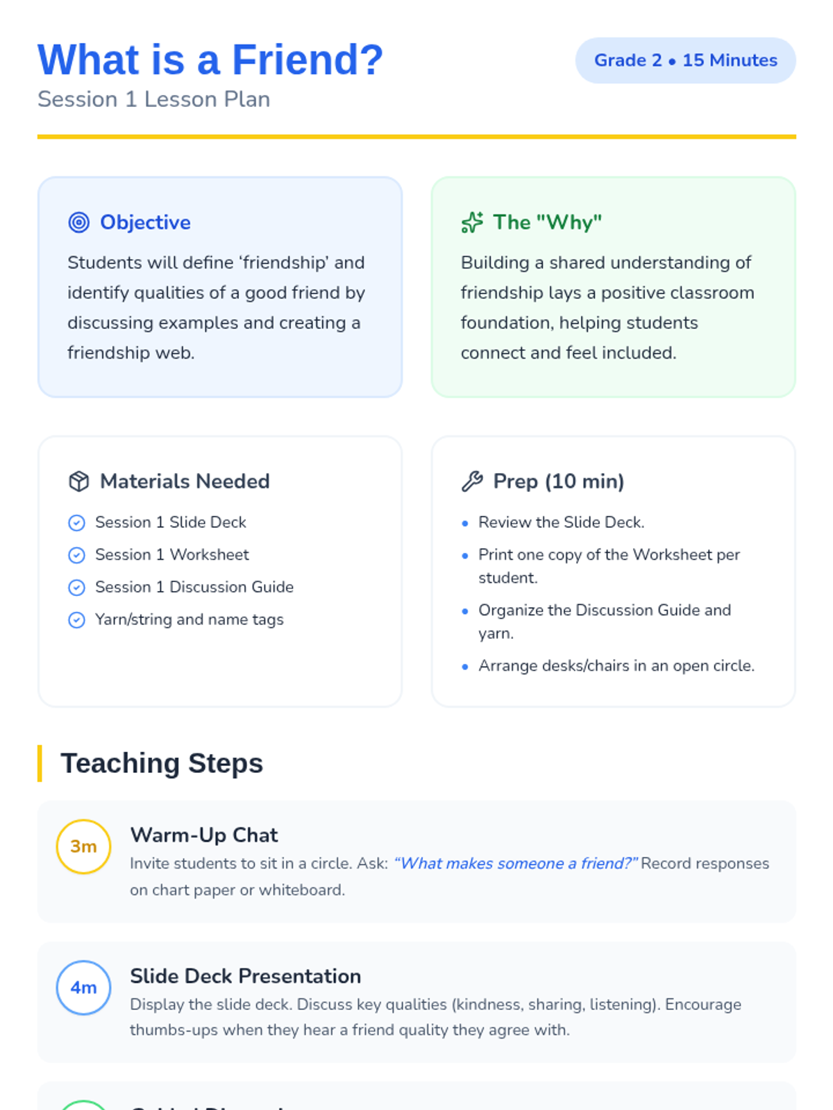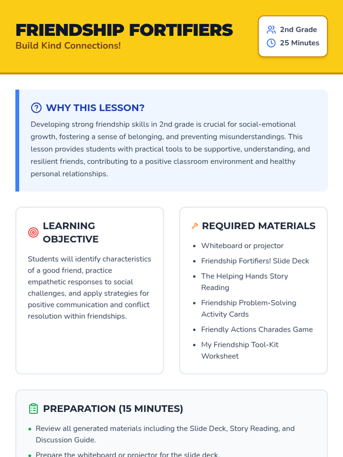 A sequence of lessons for elementary students focused on building foundational social skills. Students learn to use 'Friendship Fortifiers' in 2nd grade and join the 'Kindness Crew' in Kindergarten to foster a supportive and empathetic classroom community.
