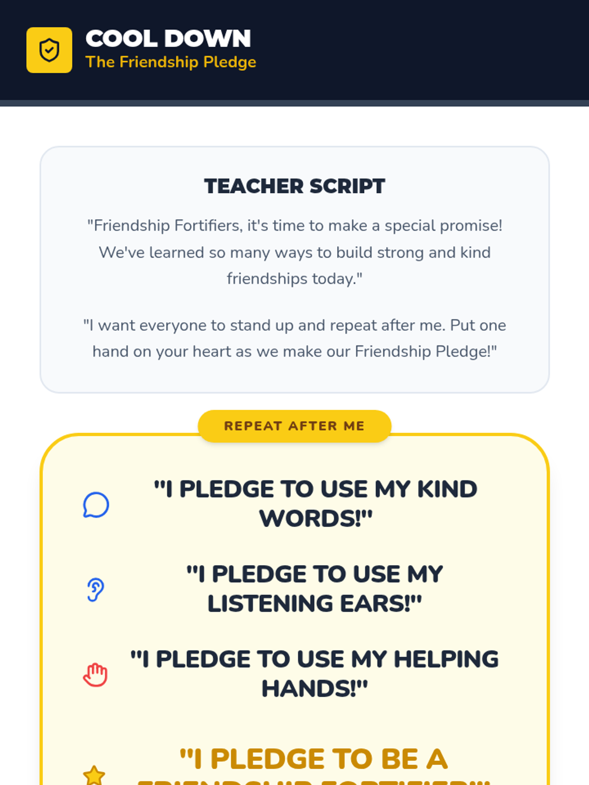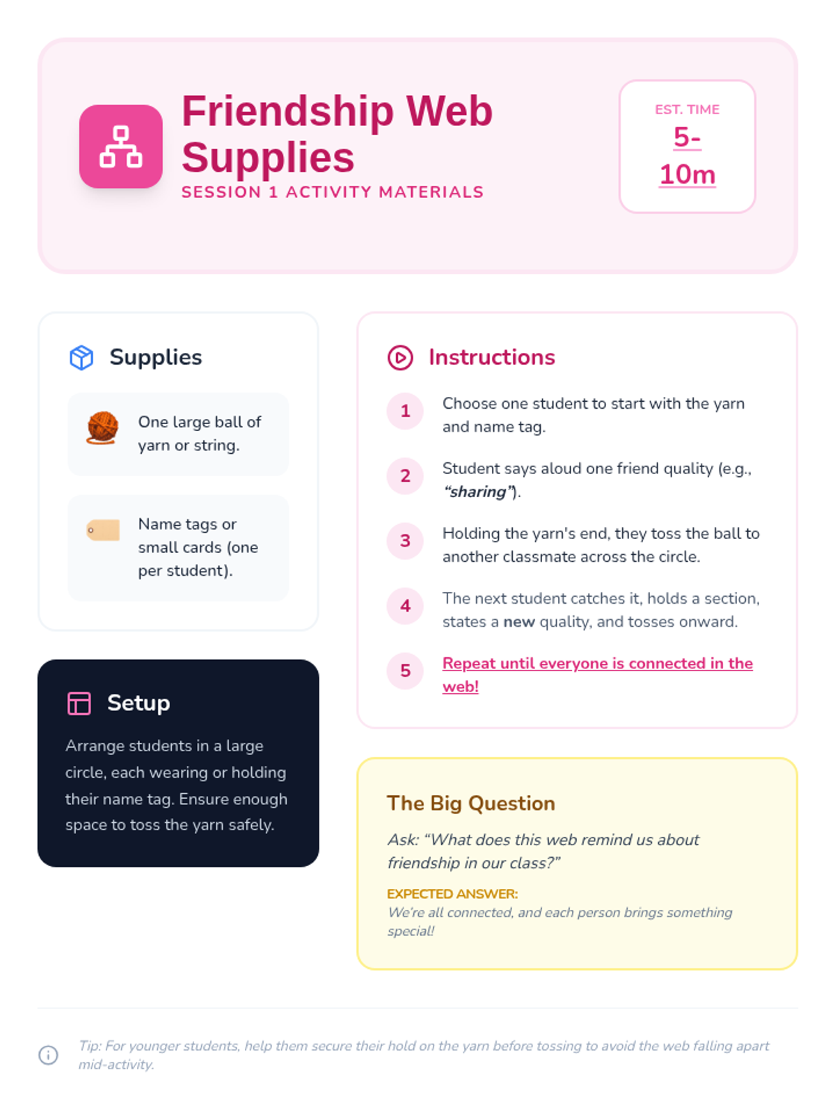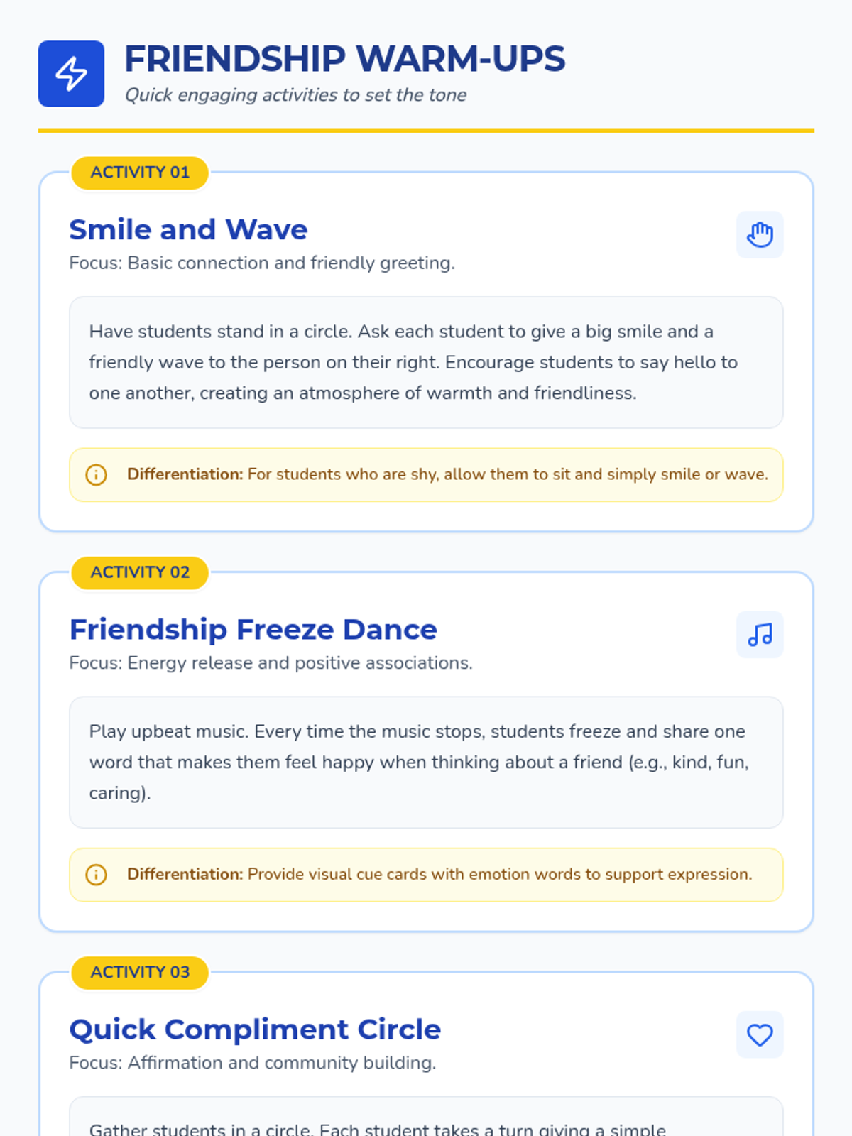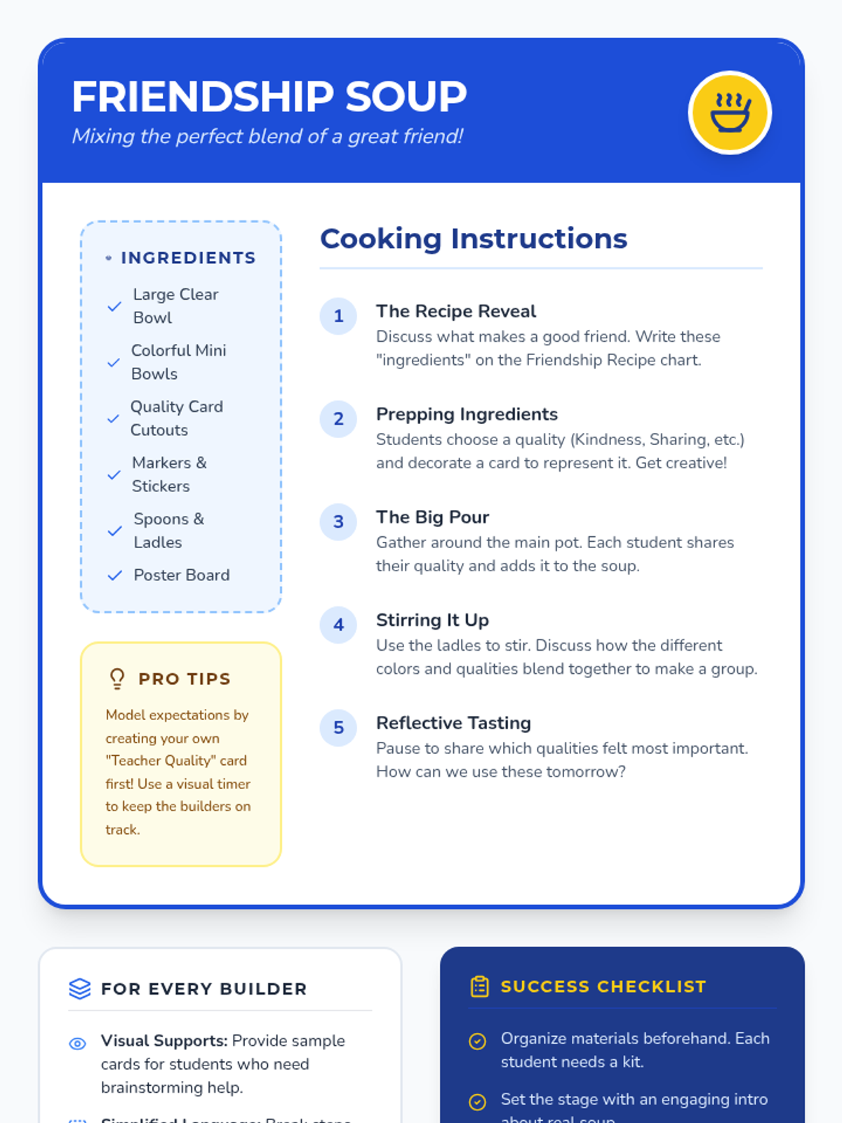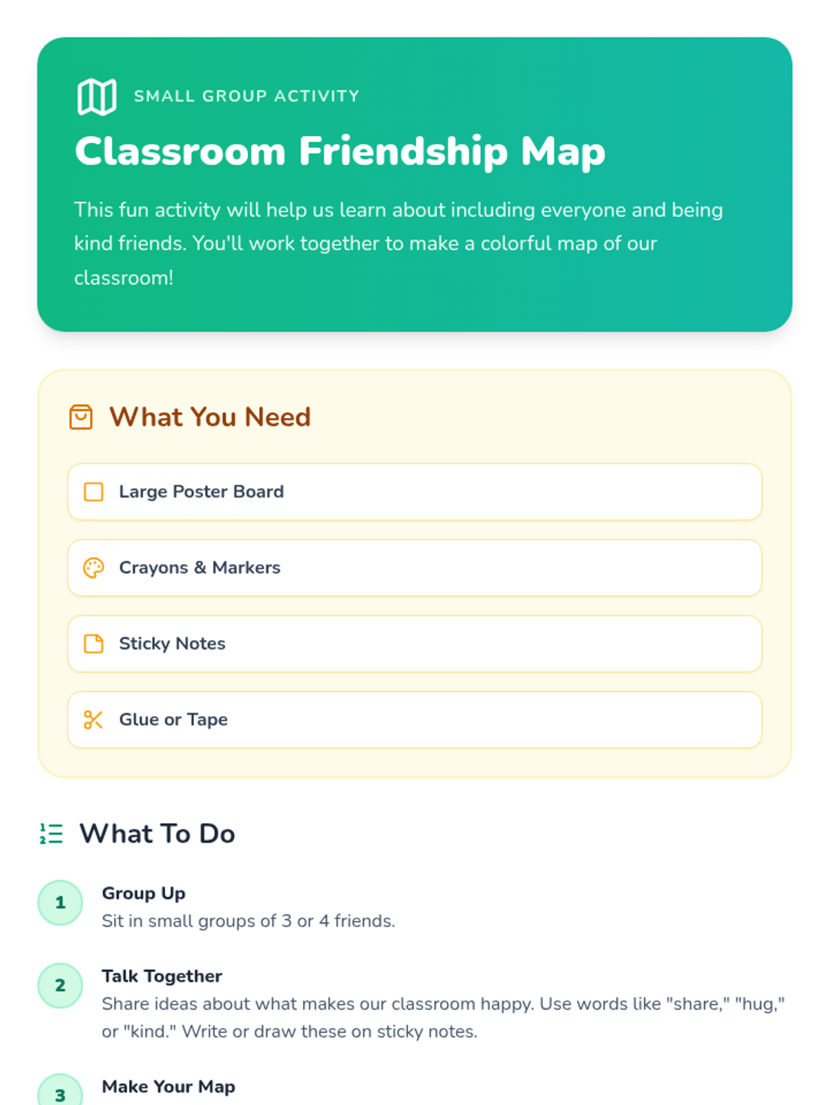 A sequence of lessons for elementary students focused on building foundational social skills. Students learn to use 'Friendship Fortifiers' in 2nd grade and join the 'Kindness Crew' in Kindergarten to foster a supportive and empathetic classroom community.