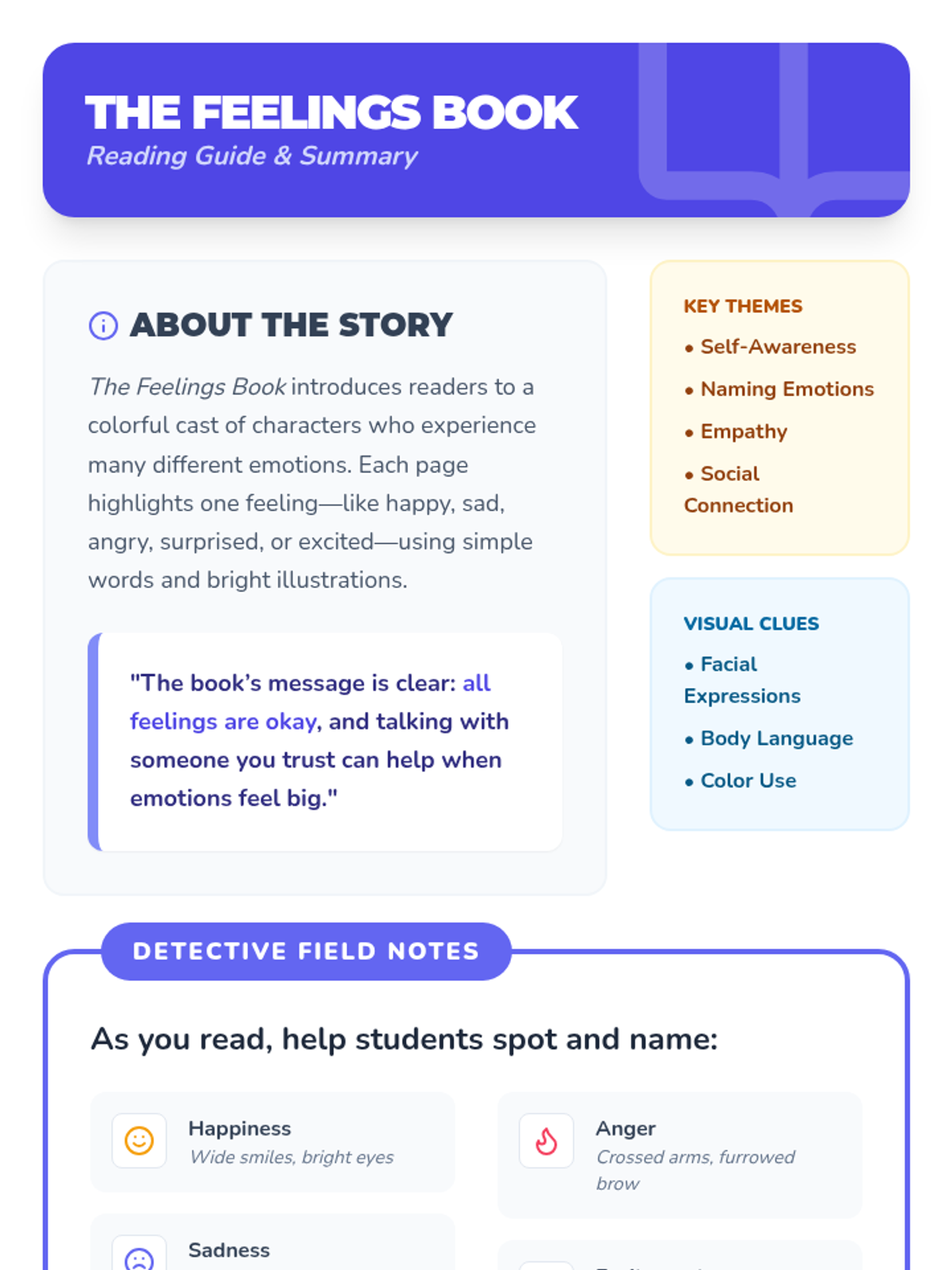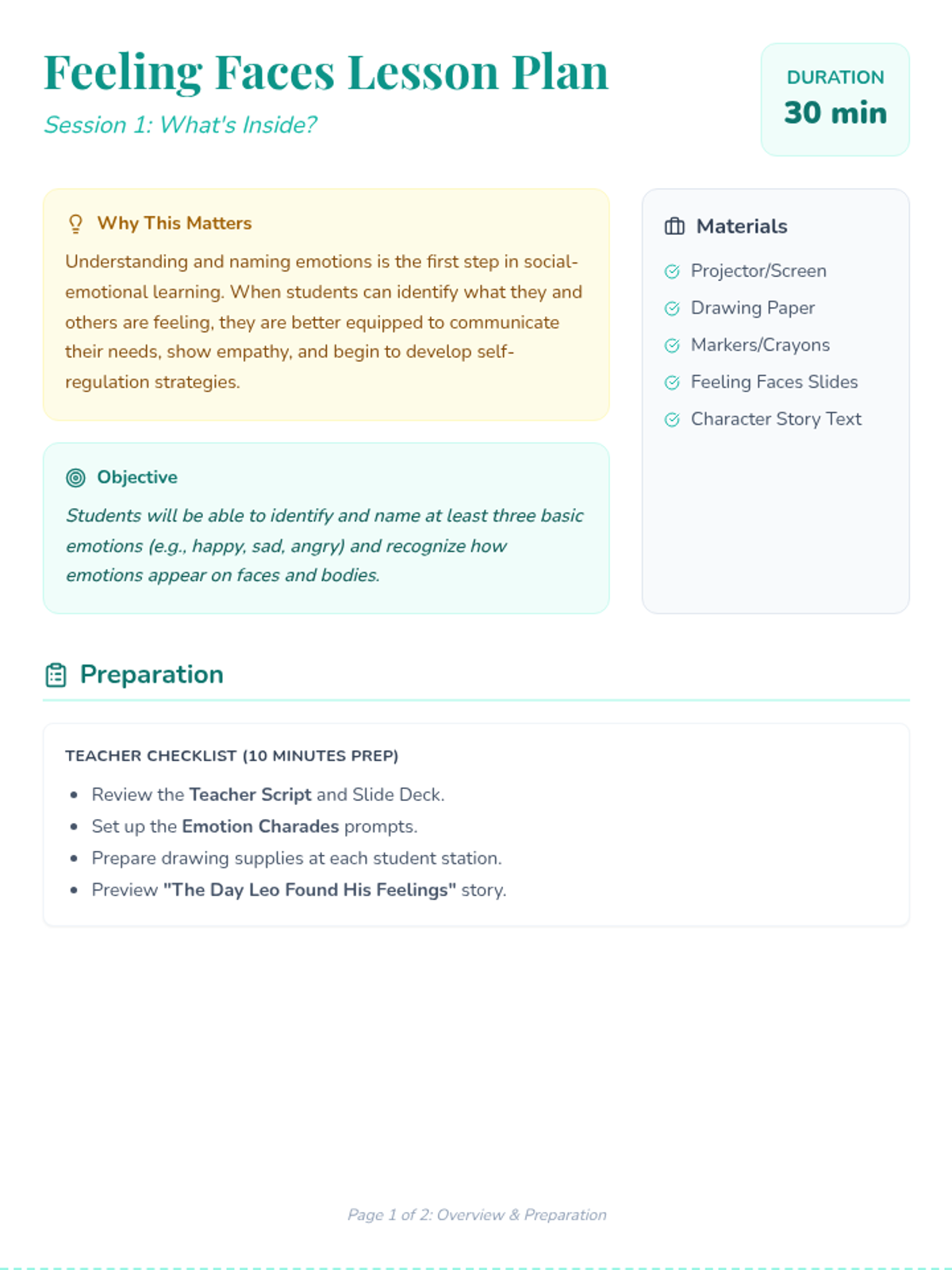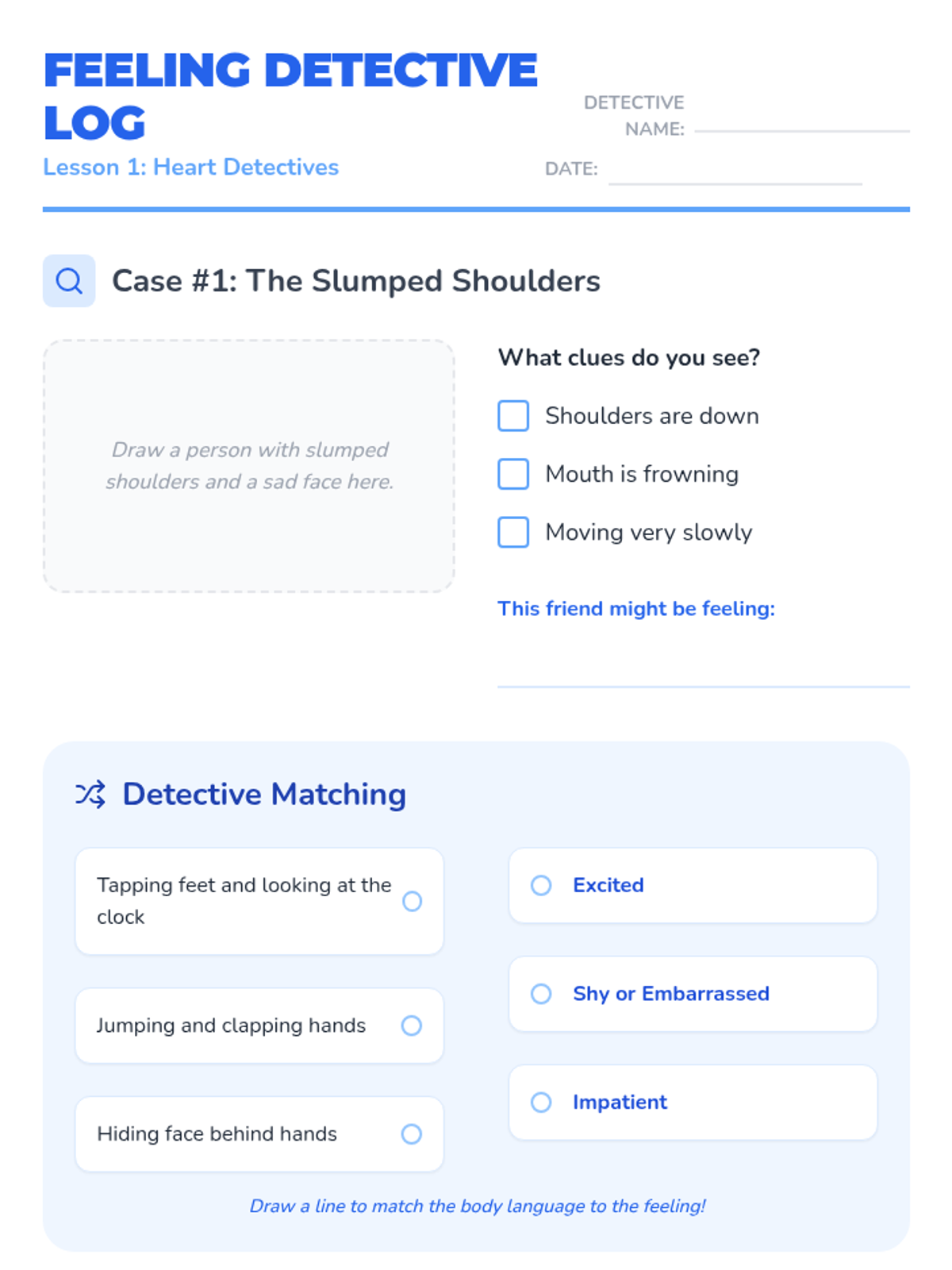 A six-session social-emotional learning program for 2nd and 3rd-grade boys focused on identifying emotions, understanding body clues, using calming strategies, and mastering conflict resolution. Students act as 'Feelings Detectives' on a mission to understand themselves and others.