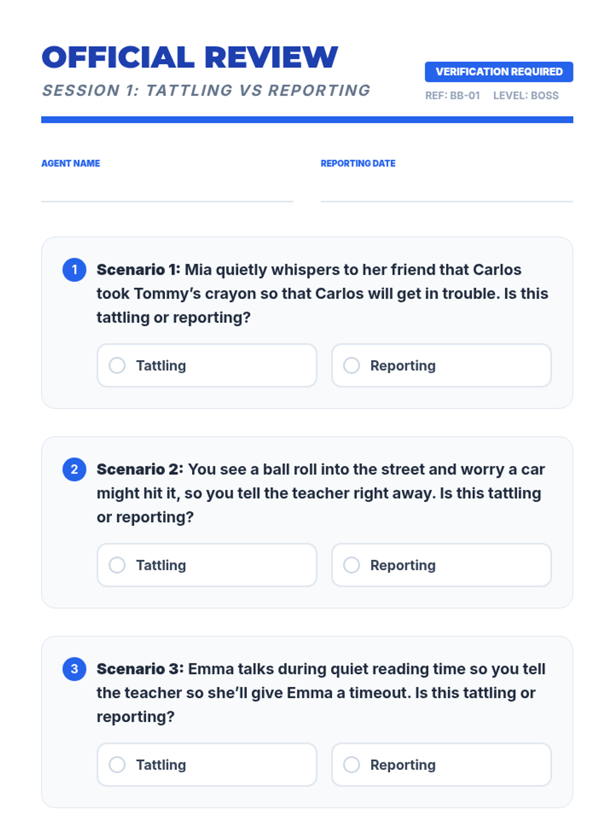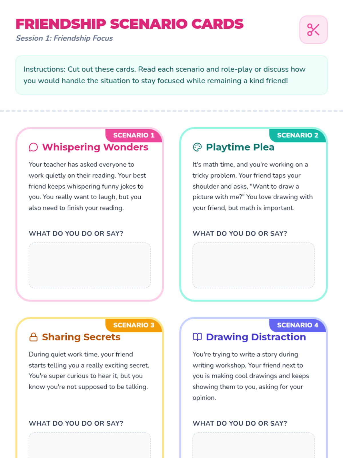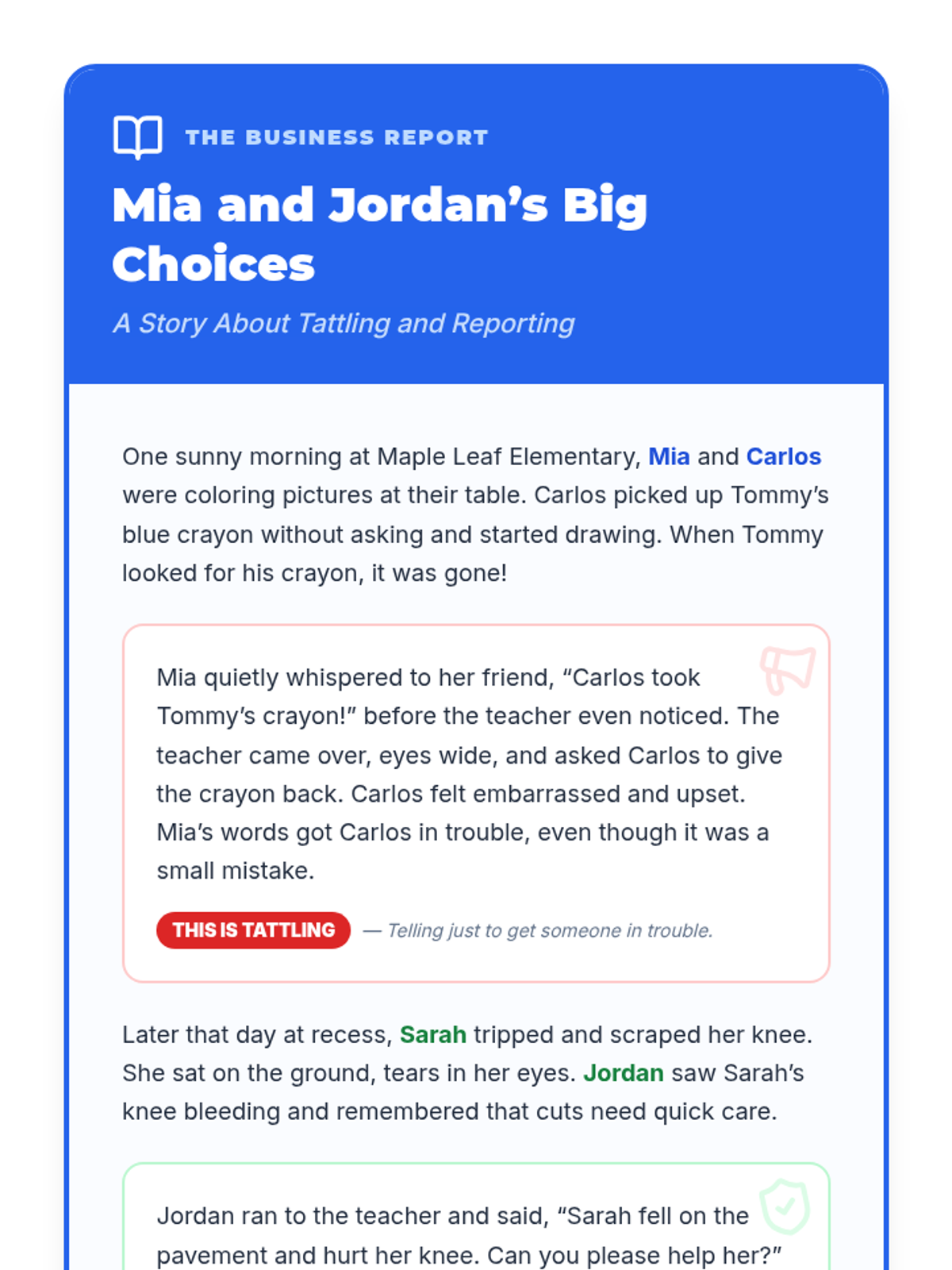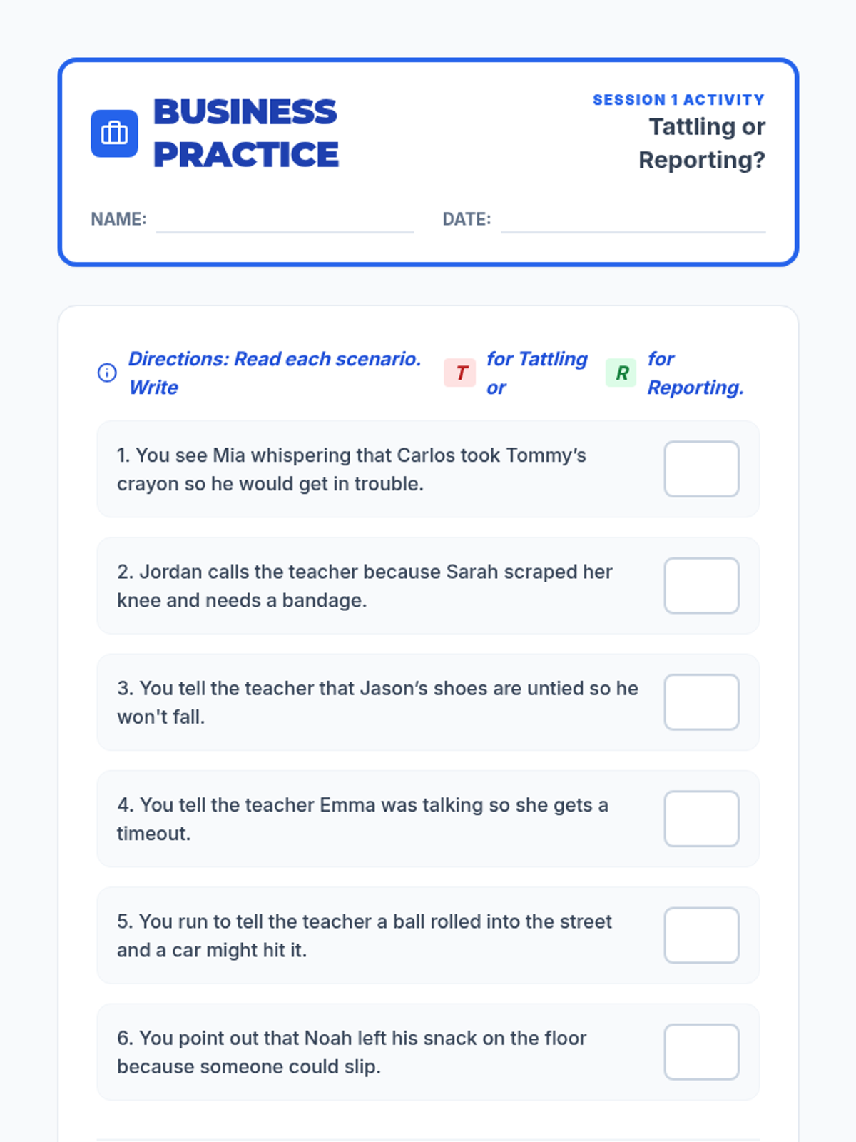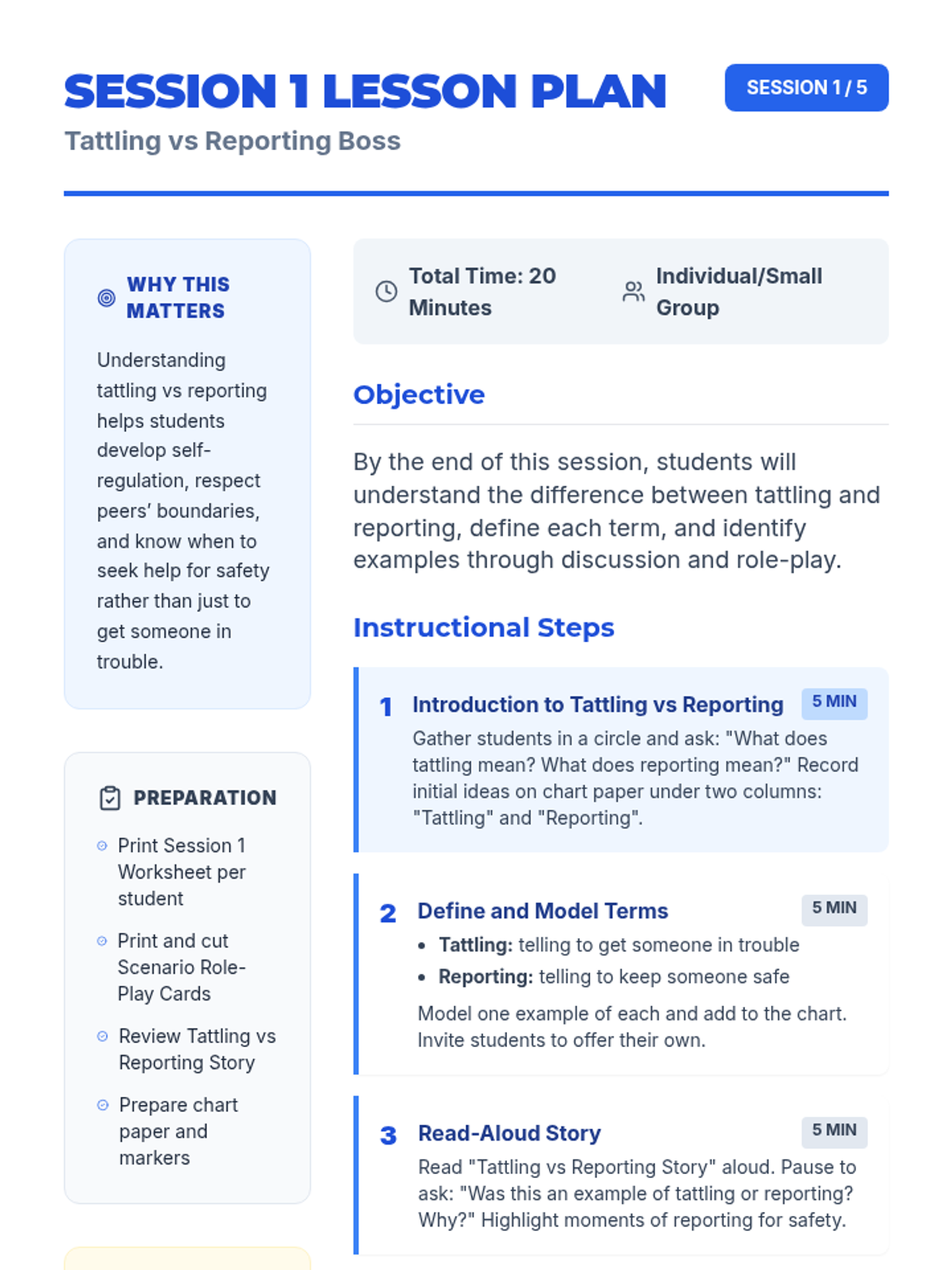 A 5-session individual intervention designed for students to develop self-regulation, distinguish between tattling and reporting, and respect peer boundaries. Students learn to 'mind their own business' through interactive stories, role-plays, and self-regulation tools.