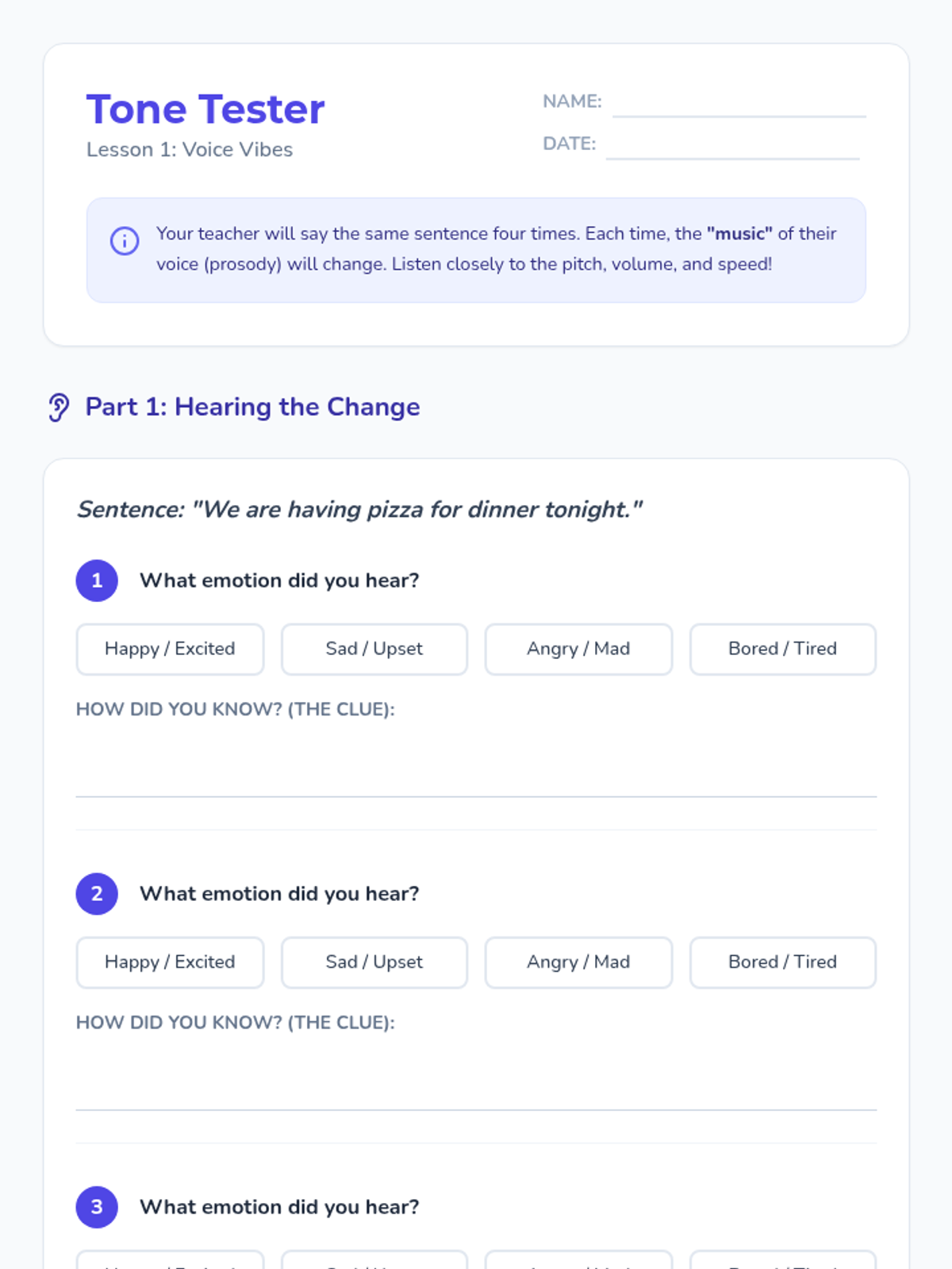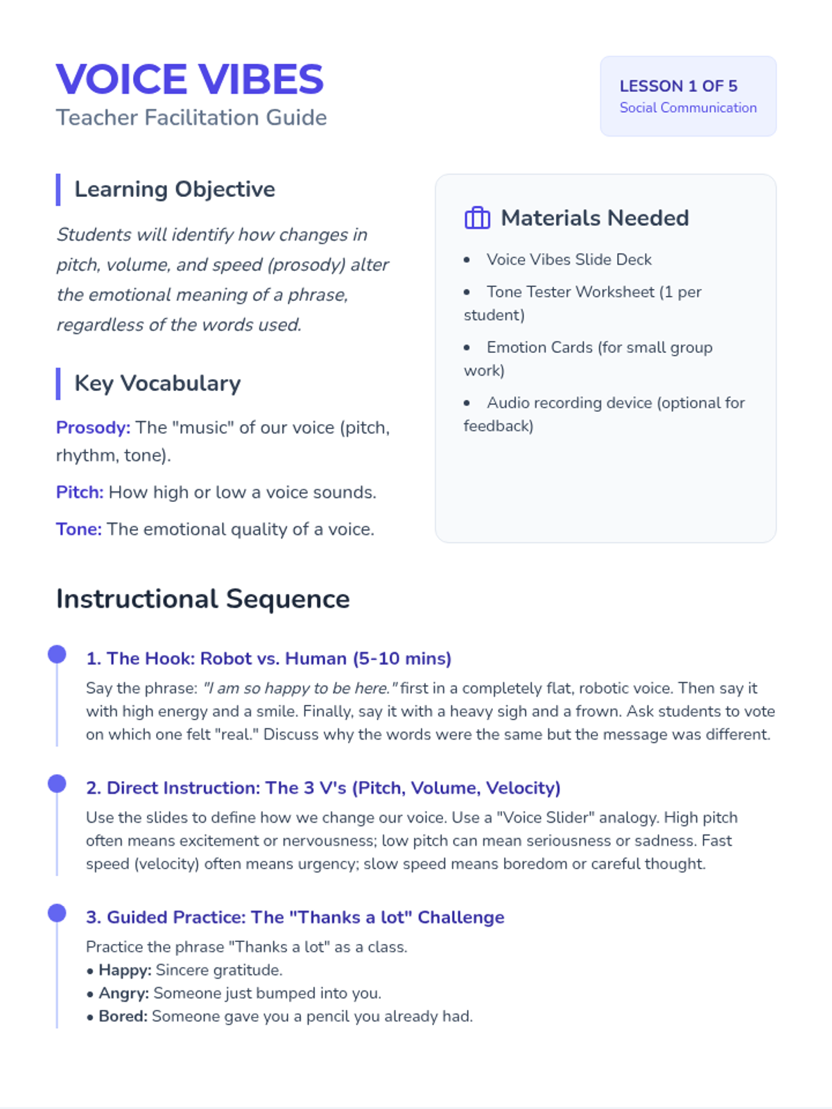 This sequence explores how tone of voice, body language, and context change the meaning of words. Students move from auditory analysis of tone to complex social role-playing, focusing on sarcasm, hyperbole, and social inferencing.