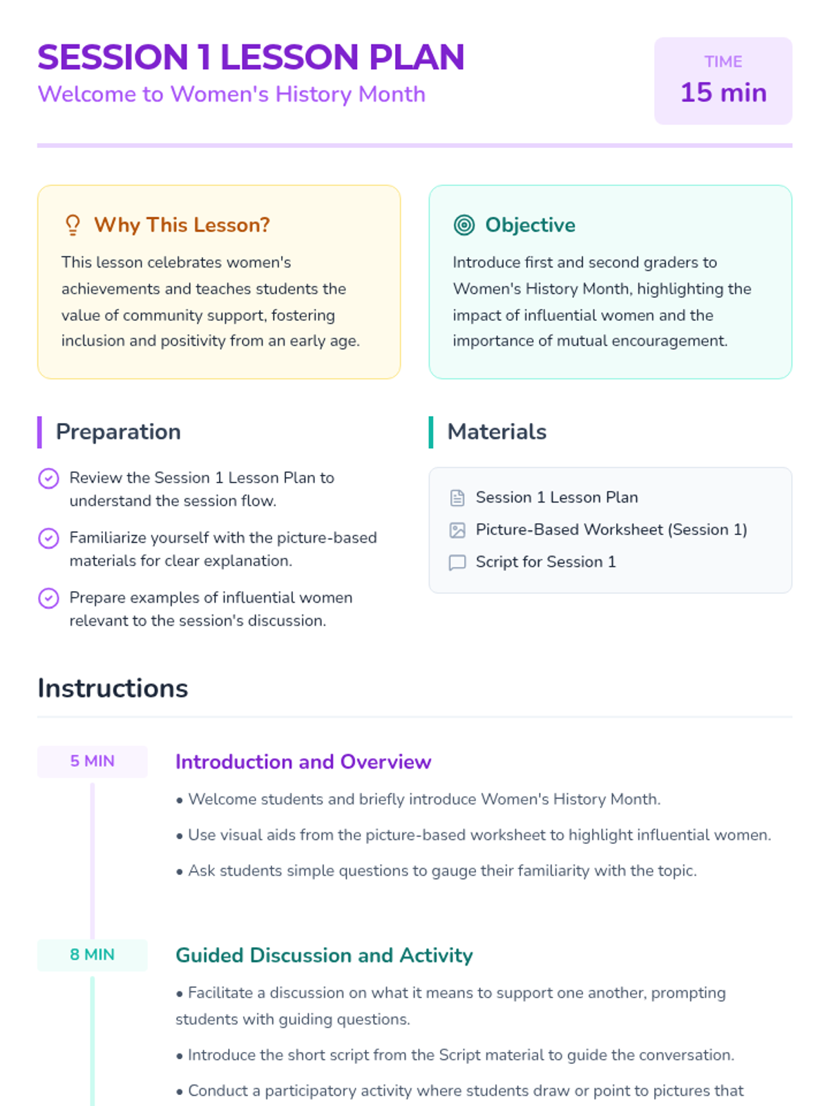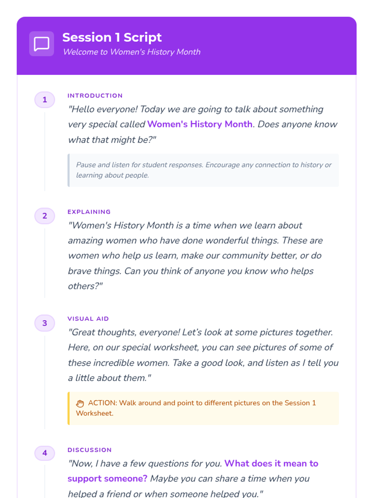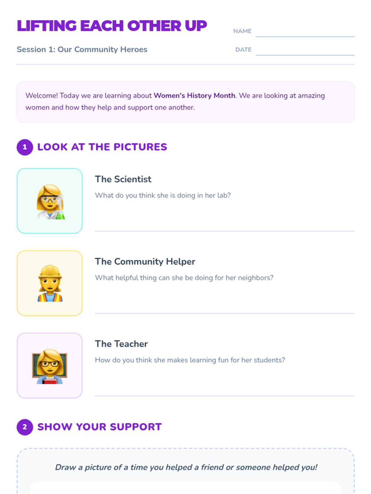 A 4-session sequence for first and second graders exploring Women's History Month through the lens of mutual support, influential women, and community building. Students engage with stories, role-play, and creative activities to understand how lifting others up creates a stronger community.