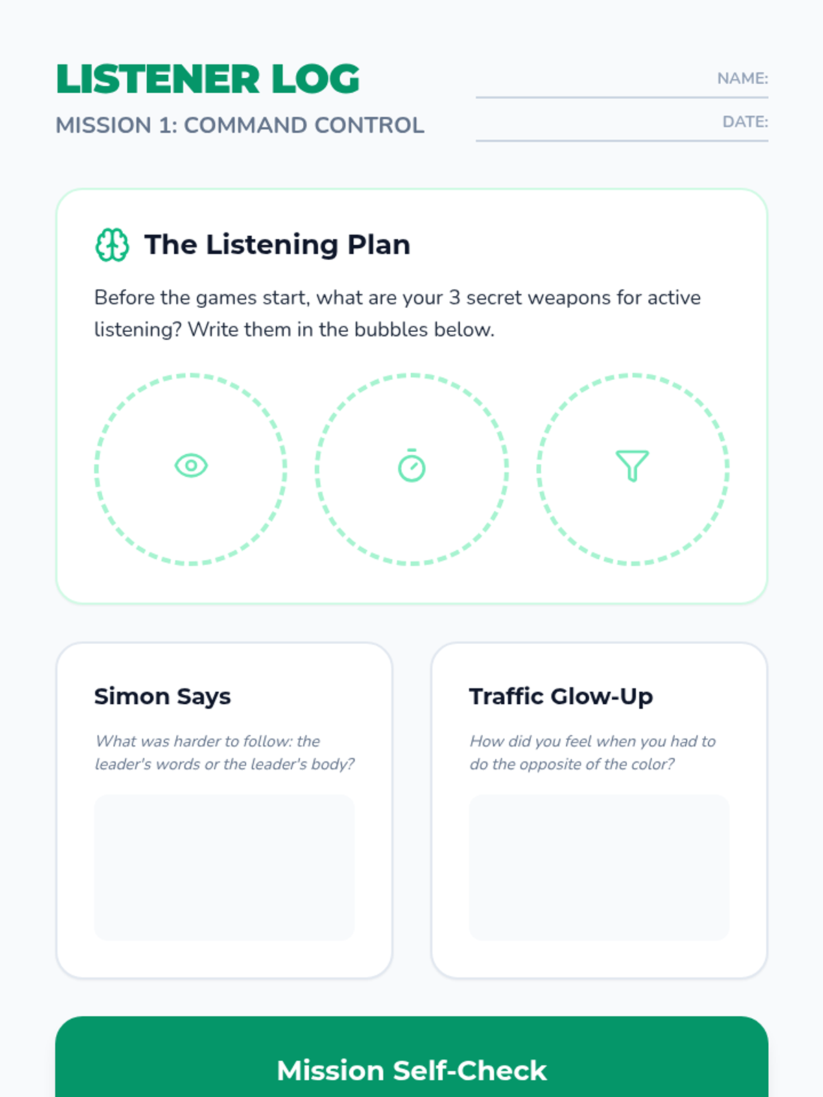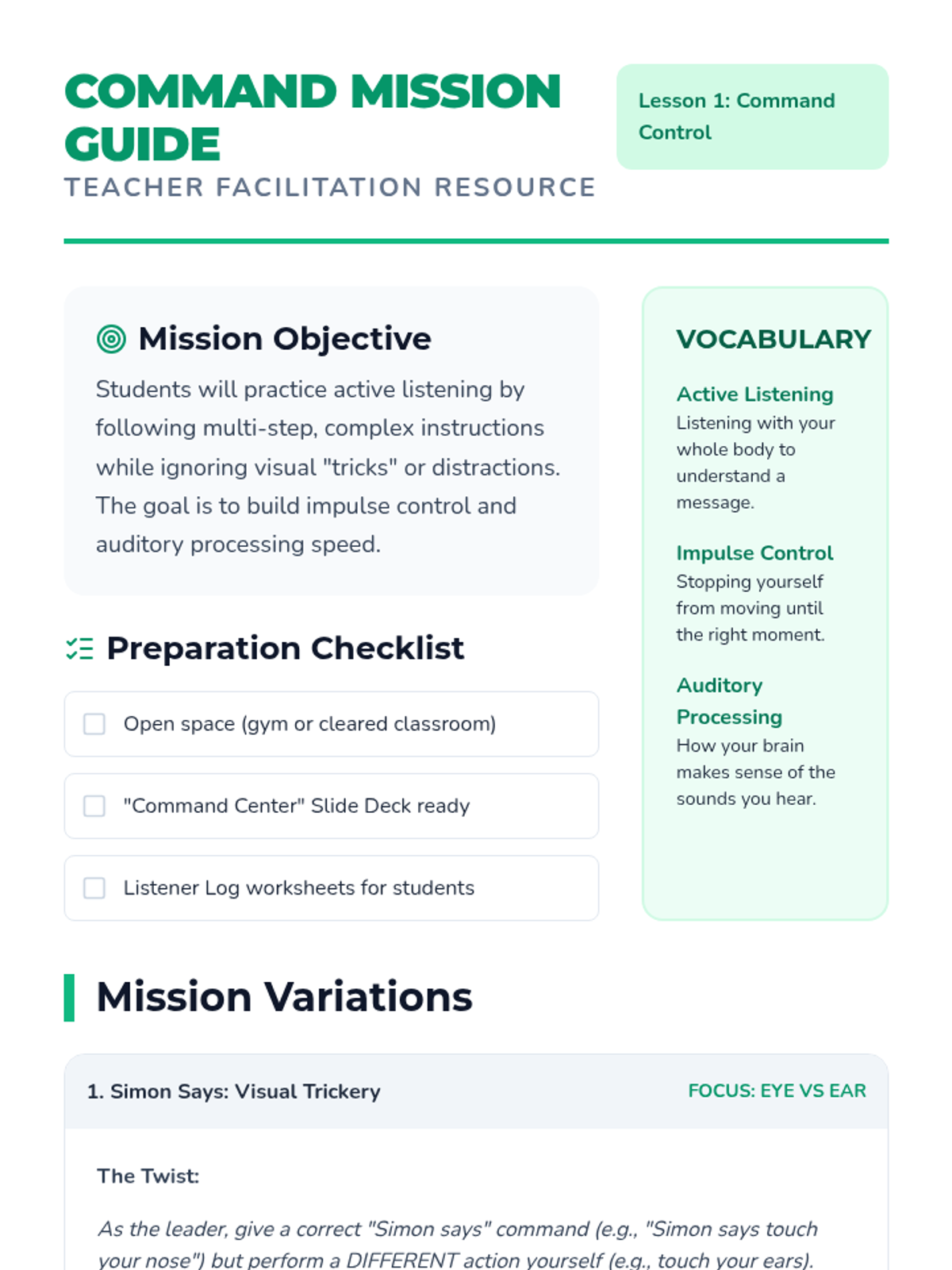 This sequence focuses on auditory processing and the cognitive strategy of verbal rehearsal (self-talk) to hold information in working memory. Students learn to 'catch' a verbal instruction, repeat it to themselves or a peer, and then execute it.