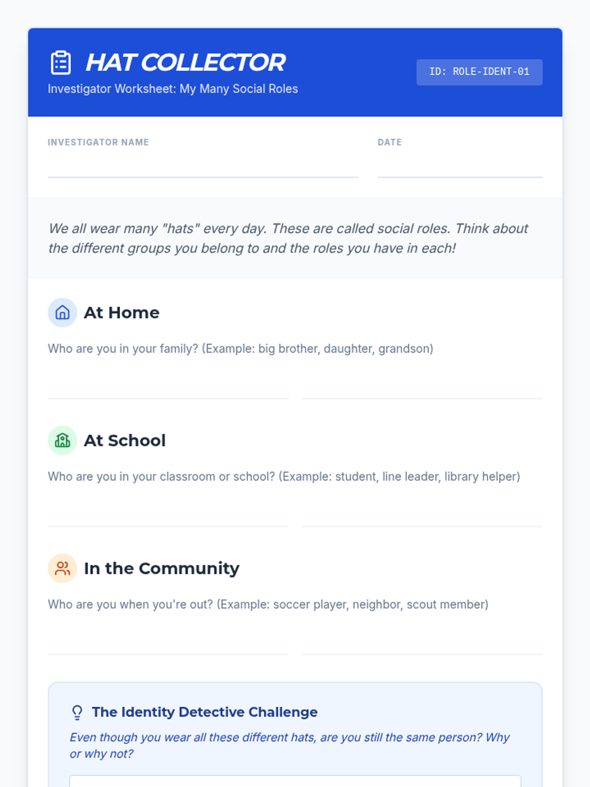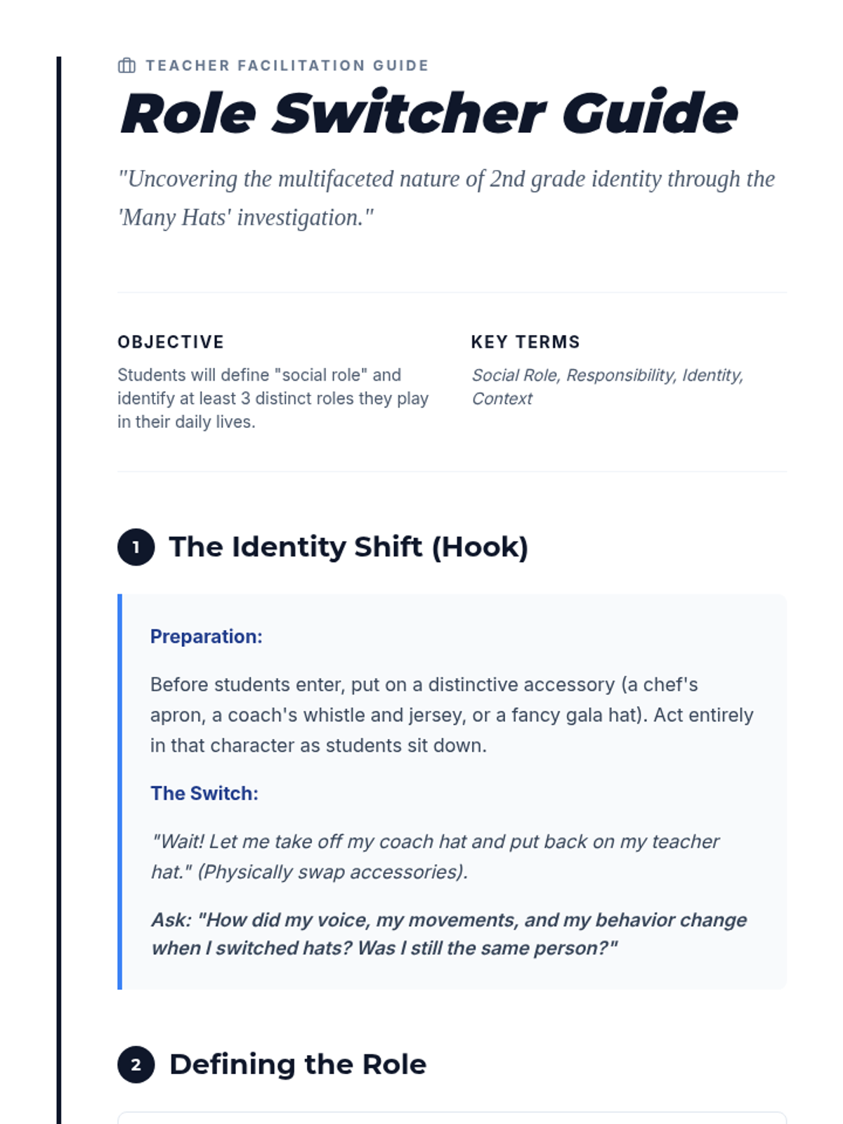 This sequence explores the fluidity of identity across different social contexts, introducing the concept of social roles. Students use inquiry and discussion to understand that they act differently as a student, a sibling, or a friend, yet remain the same person, building towards social responsibility.