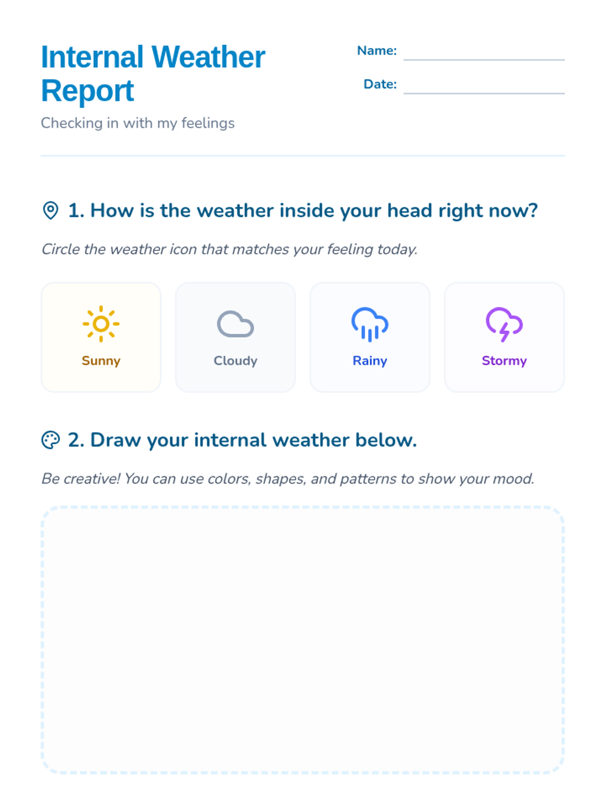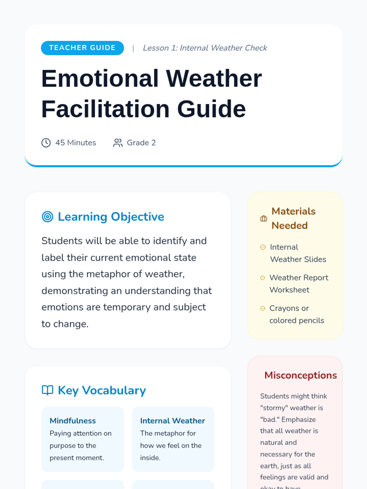 A 5-lesson unit for 2nd graders that connects emotional intelligence to self-identity. Students explore nuanced emotions, personal triggers, artistic expression, self-regulation, and the concept of emotions as a shifting 'weather' that reflects their unique identity.
