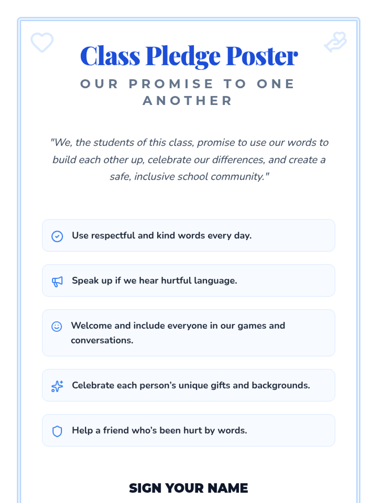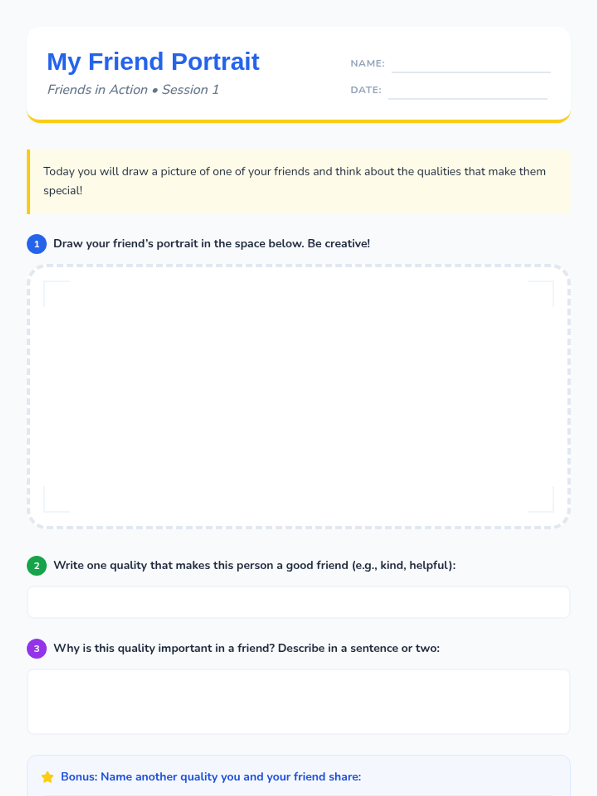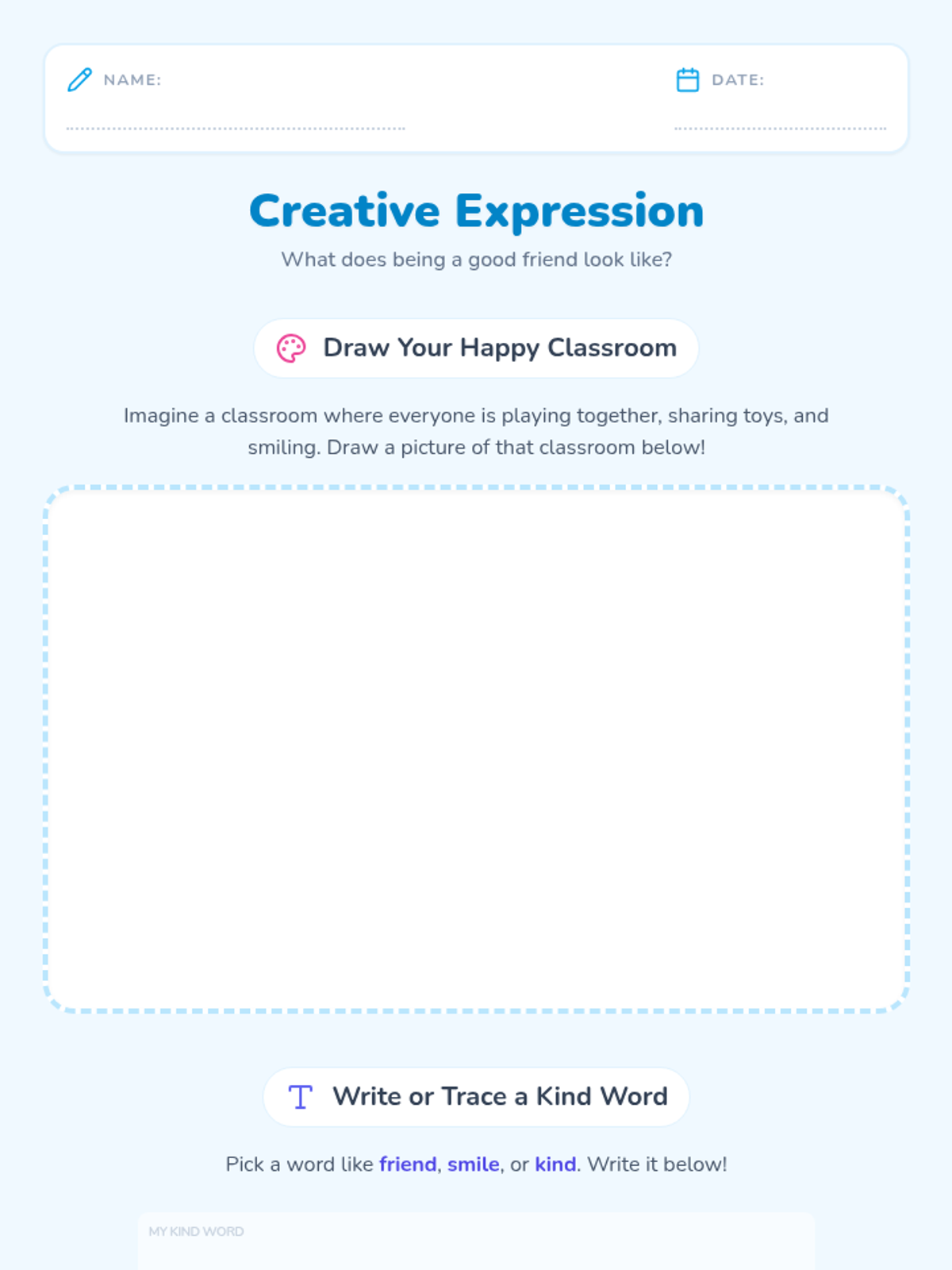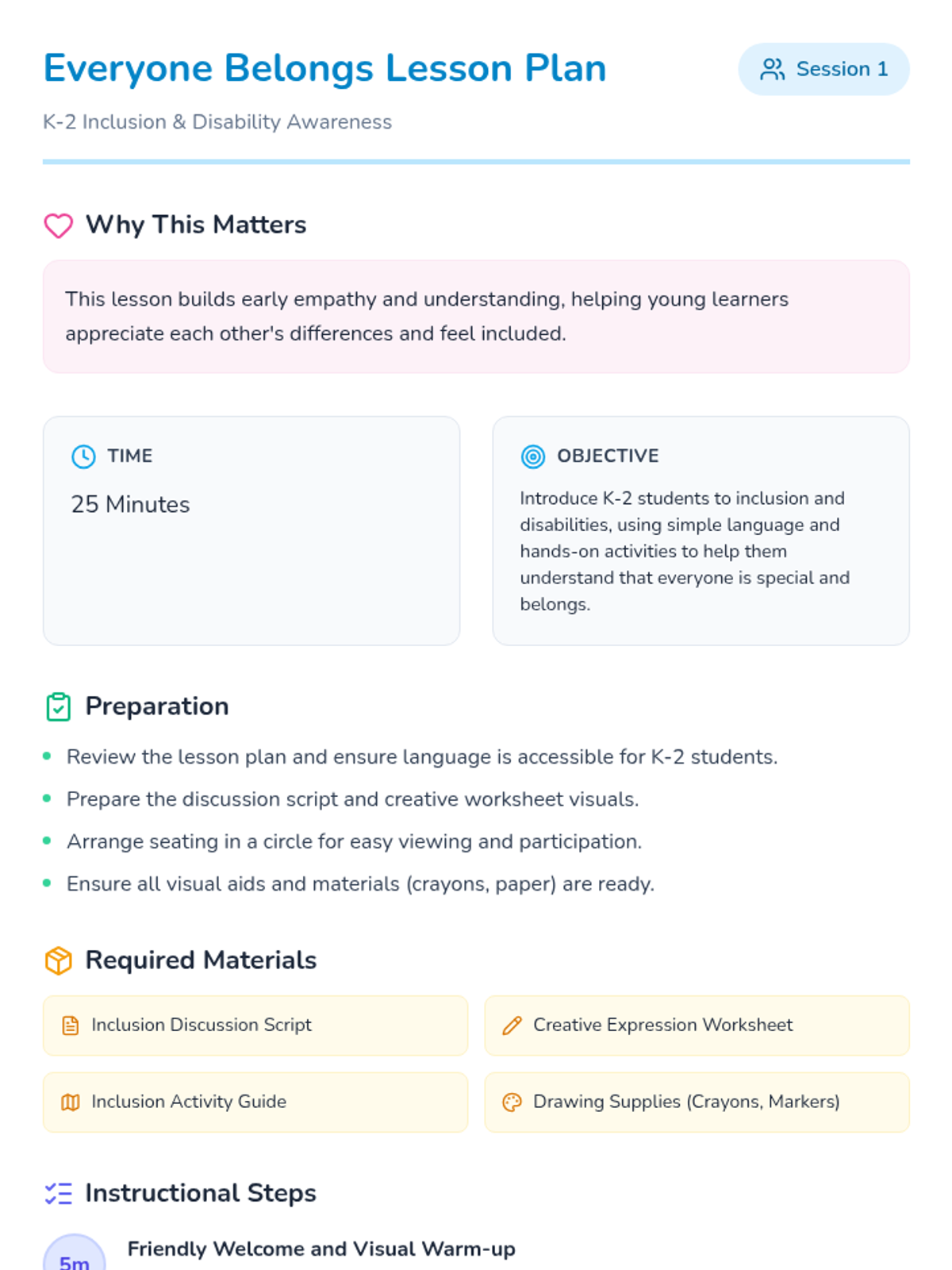 A two-session sequence for K-2 students focused on understanding inclusion, celebrating differences, and building a supportive classroom community. Students explore what it means to be a friend and commit to inclusive actions through discussion, drawing, and a collaborative class pledge.