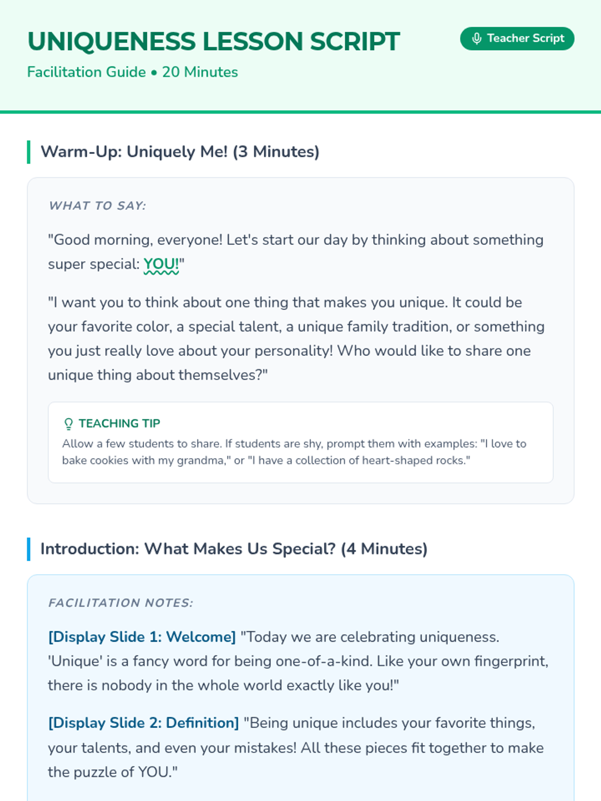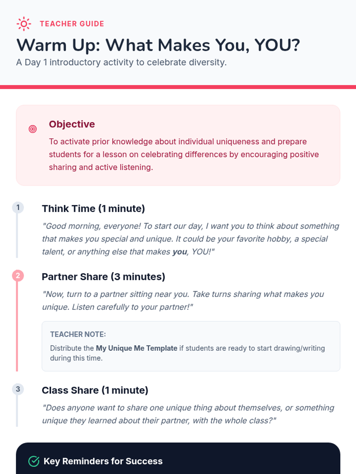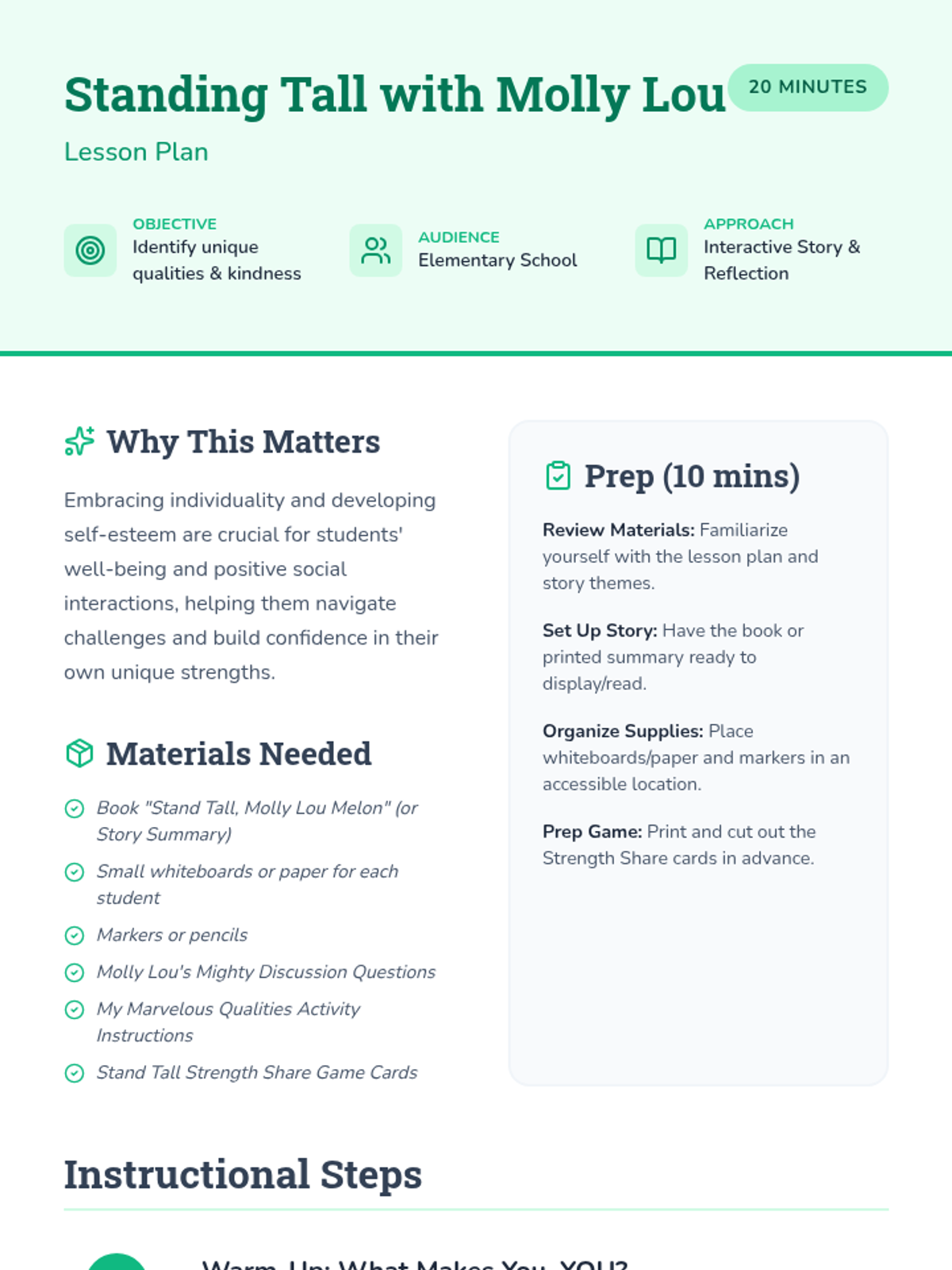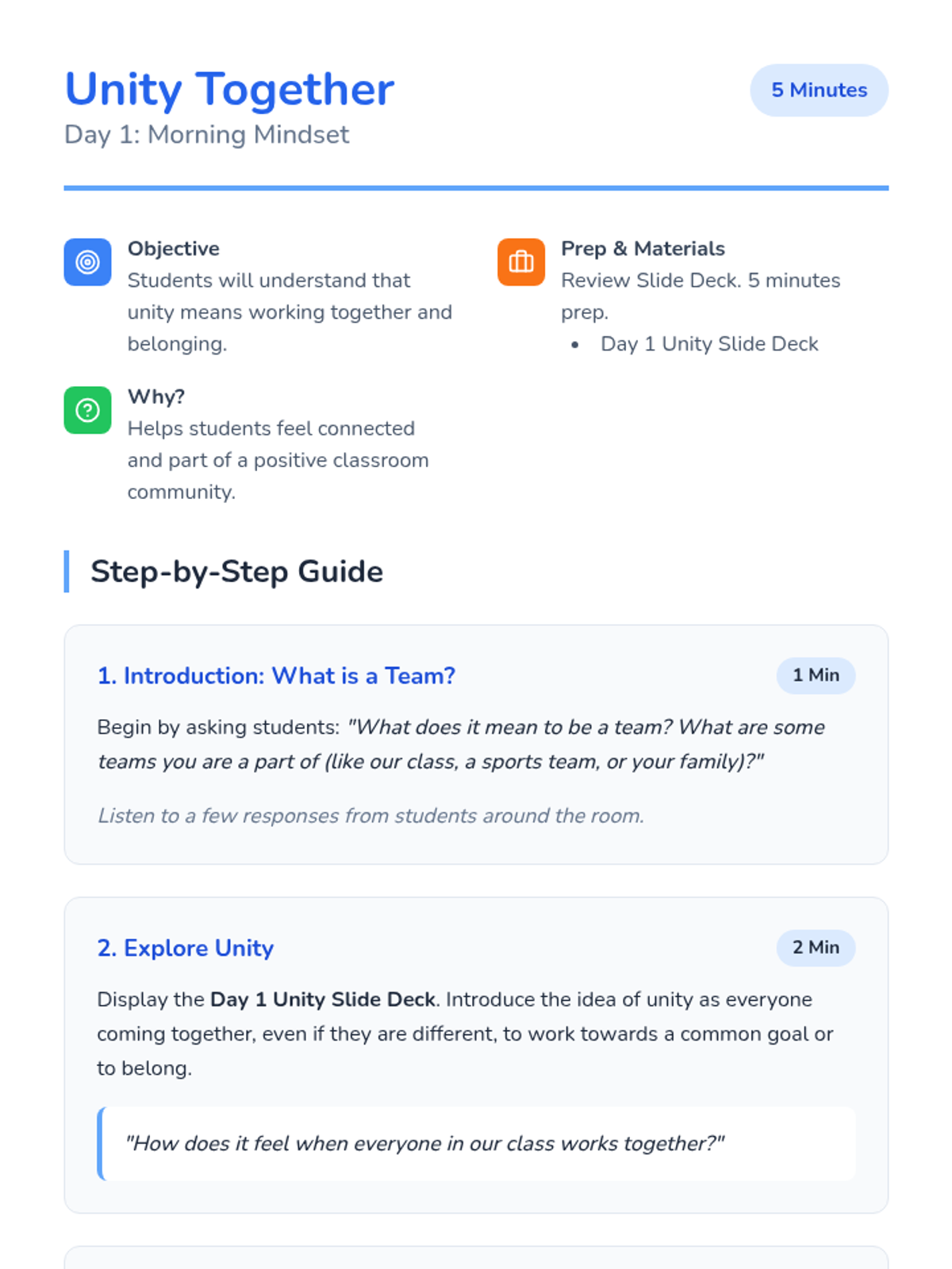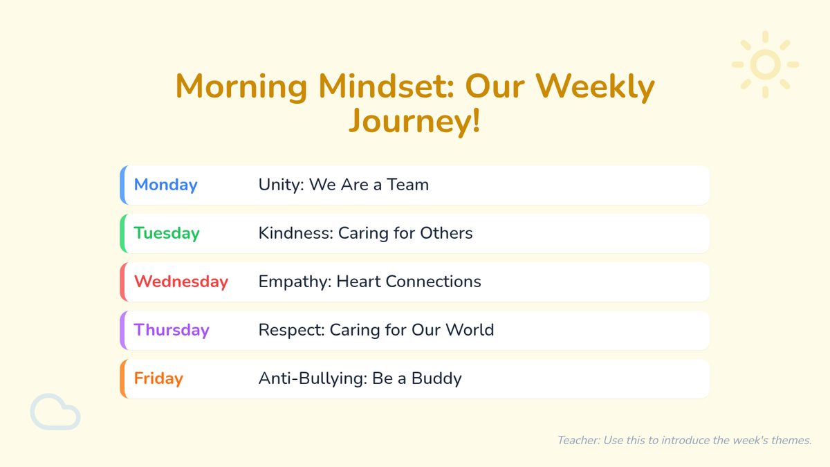 A 5-day series of quick, 5-minute morning lessons for grades 1-3 focusing on positive values like unity, kindness, empathy, respect, and anti-bullying. Each day starts the classroom journey with heart and purpose.