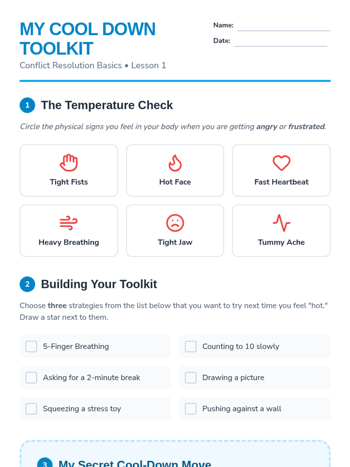 A comprehensive 5-lesson unit for 2nd graders to build somatic awareness, identifying physiological and behavioral signs of emotional escalation before they reach a crisis point. Students learn to recognize their 'baseline' calm state, map sensations to emotions, use an emotional thermometer, and identify personal warning signals.