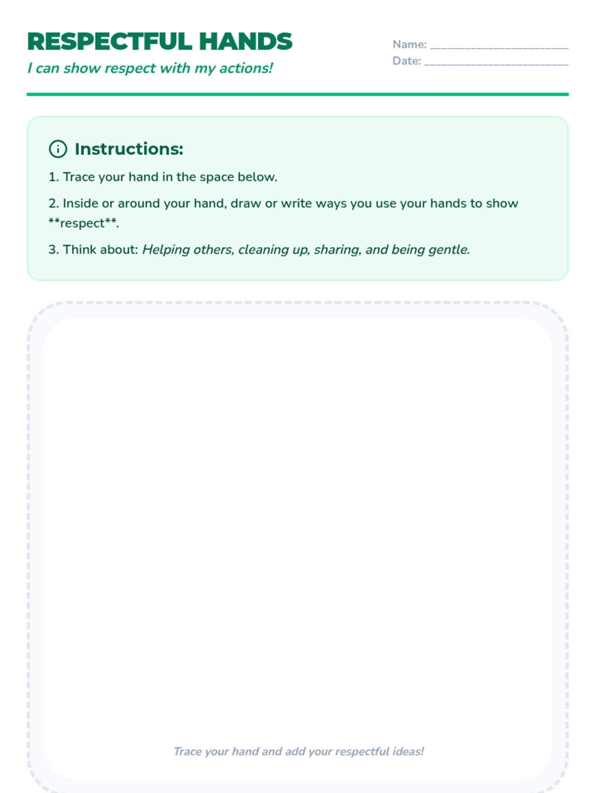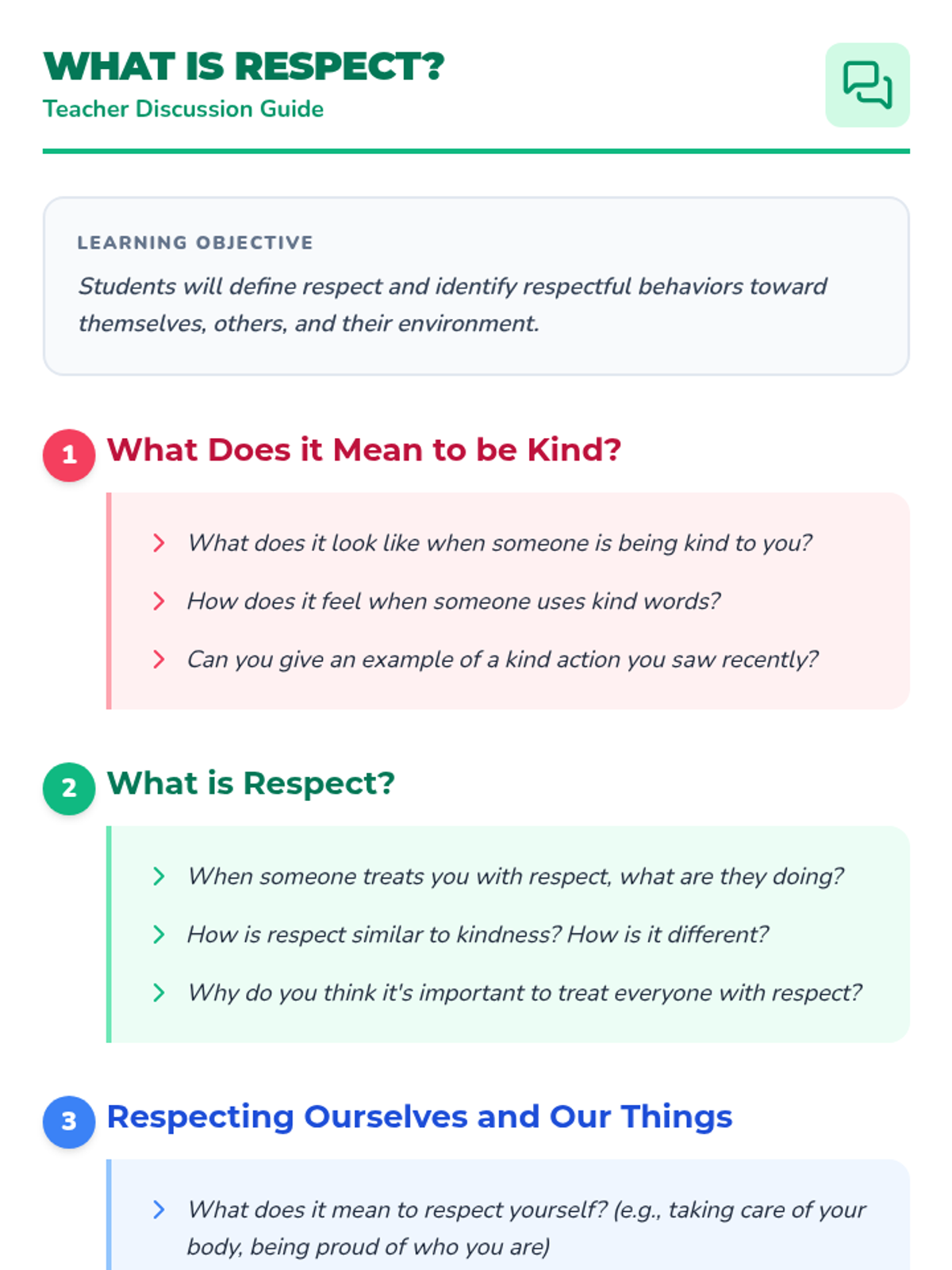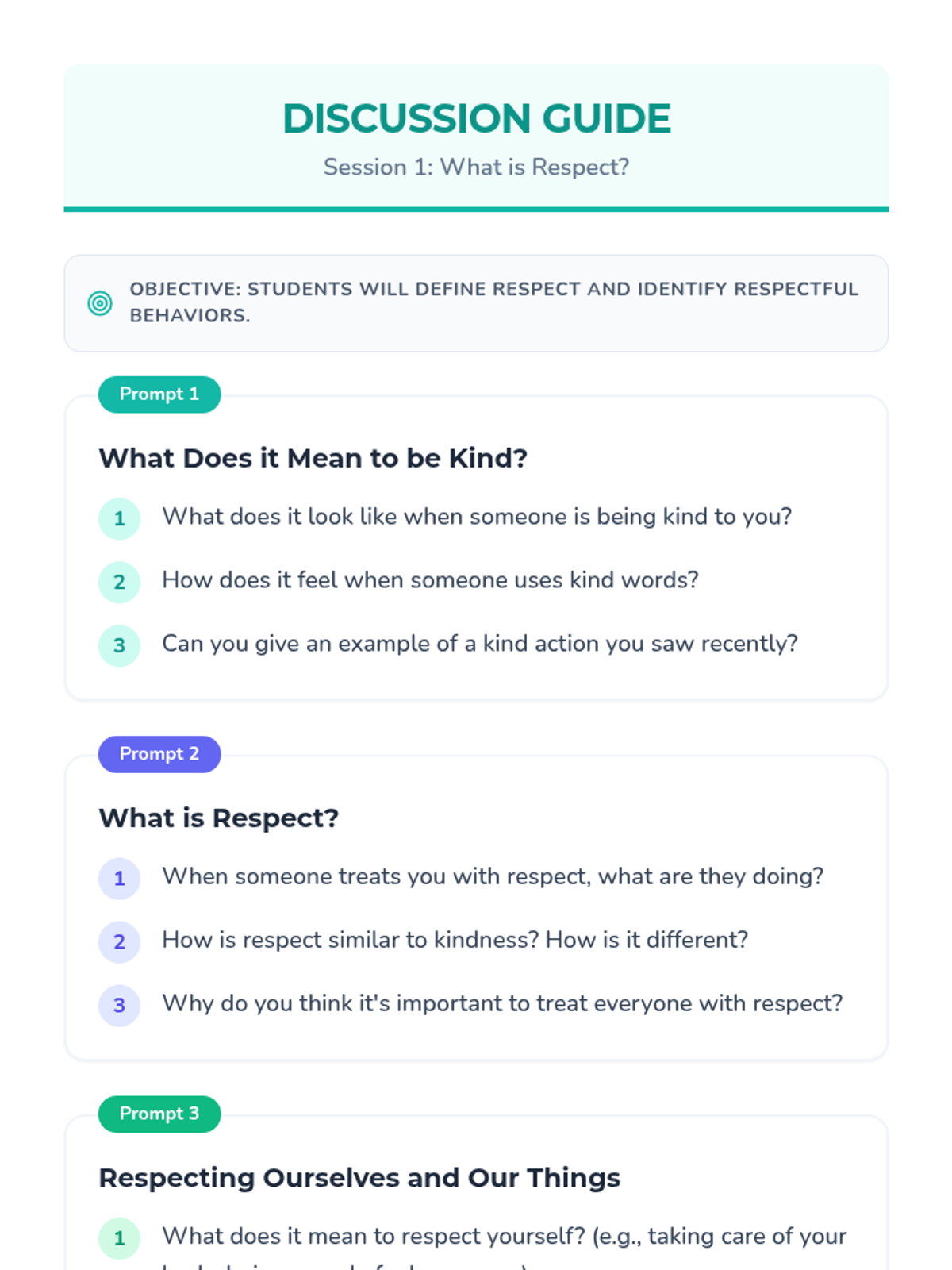 A five-session unit teaching 1st and 2nd graders the foundational concepts of respect, including self-respect, respecting others, and caring for the environment and community.