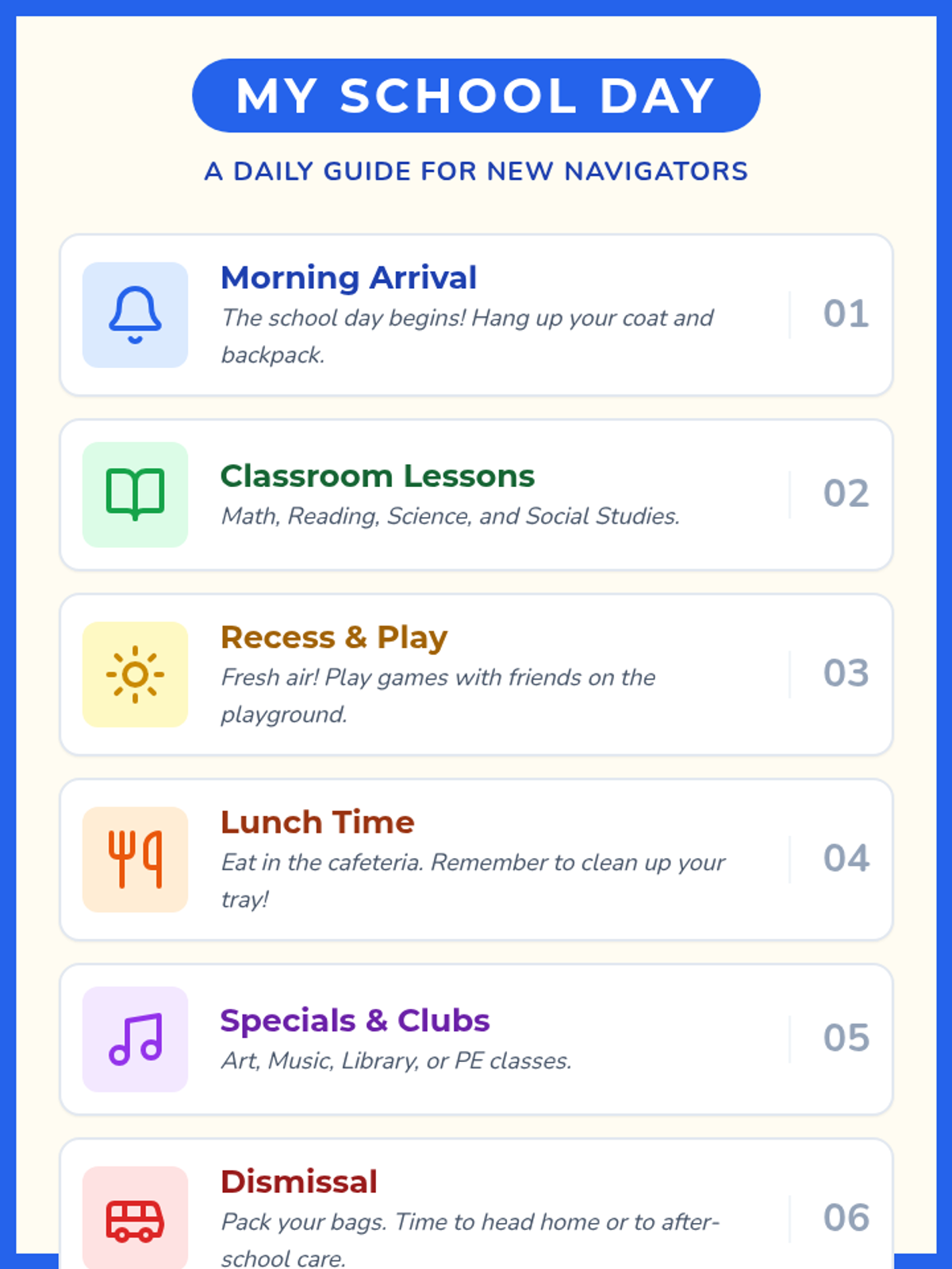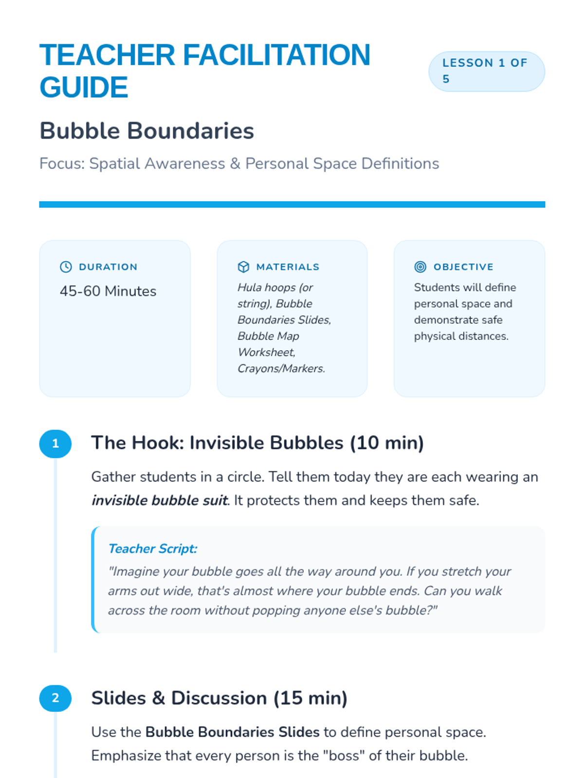 A 5-lesson sequence for 2nd-grade students focusing on the logistics and social responsibility of movement breaks. Students learn spatial awareness, time management using timers, cool-down transitions, and self-reflection to ensure breaks are effective and respectful.