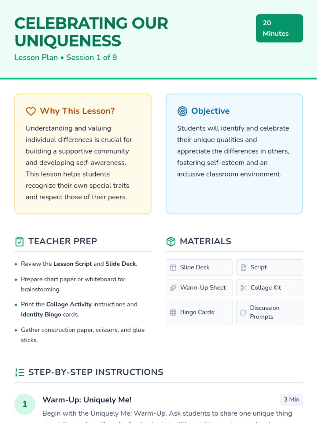 A 9-session lesson series for second-grade students exploring culture, diversity, and identity through interactive activities, discussions, and creative expression. Students learn to celebrate their own uniqueness while appreciating the varied traditions, foods, clothing, and stories of the global family.