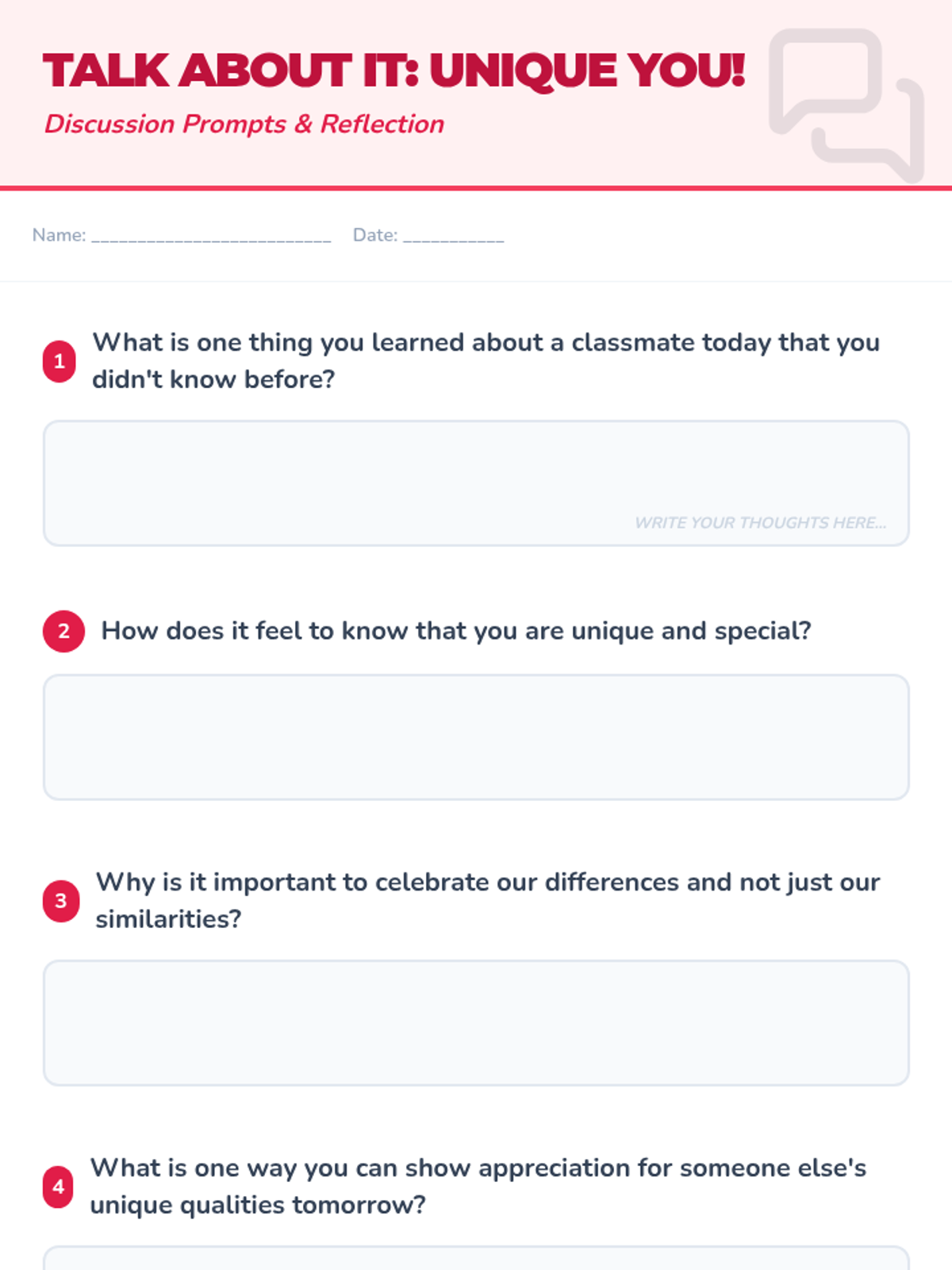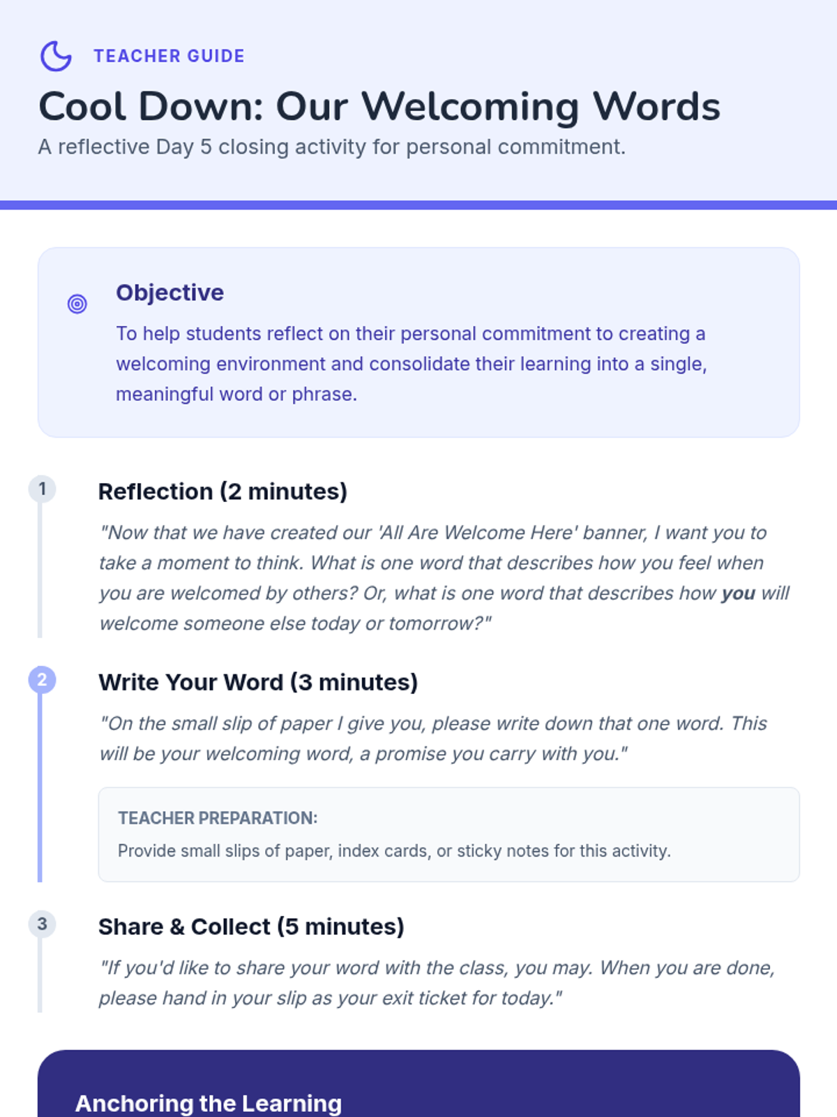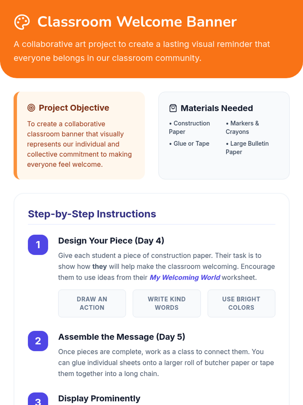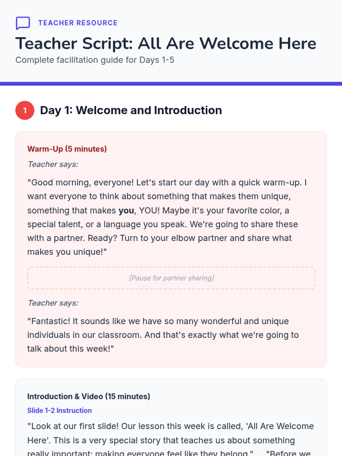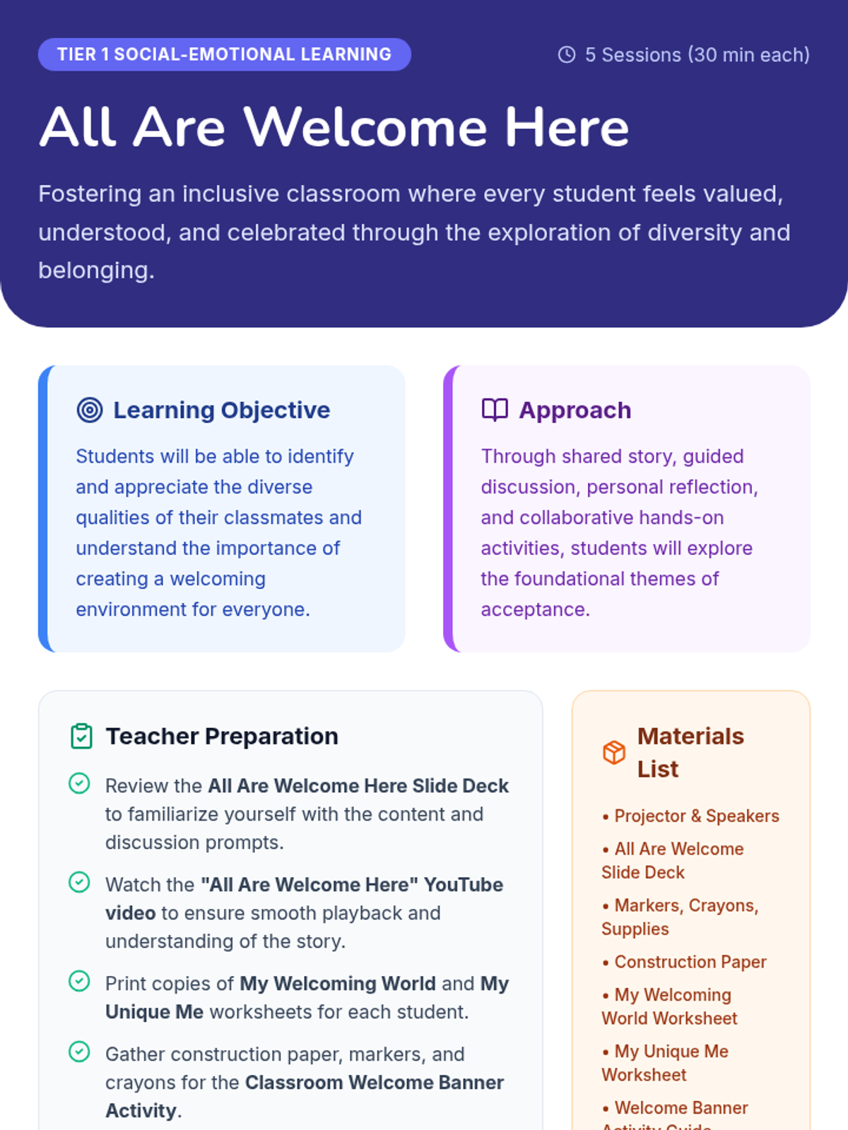 A five-day social-emotional learning sequence for elementary students exploring acceptance, diversity, and belonging through the story 'All Are Welcome Here'. Students build empathy and celebrate classroom community through discussion, reflection, and collaborative art.
