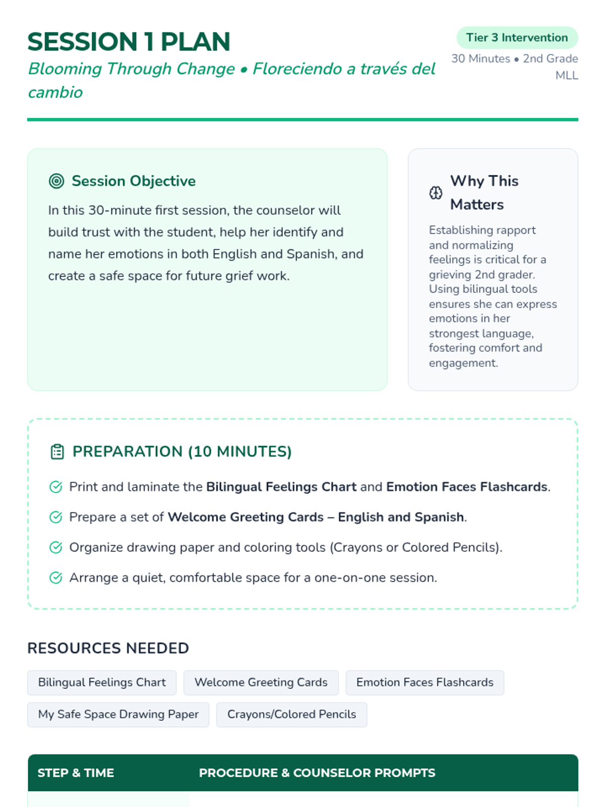 A comprehensive four-week individual counseling sequence designed for a 2nd-grade MLL student navigating grief and school transition. The sequence utilizes bilingual (English/Spanish) tools to build trust, explore emotions, and teach resilient coping strategies.