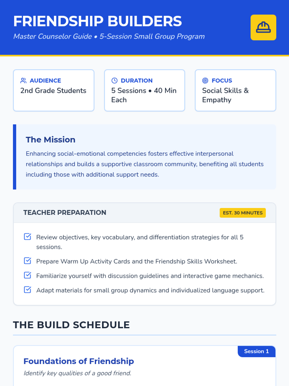 A 5-session small group counseling sequence for 2nd graders designed to build social-emotional skills, communication, empathy, and cooperation through a 'builder' theme. Students engage in hands-on activities like 'Friendship Soup' and cooperative games to foster a supportive classroom community.