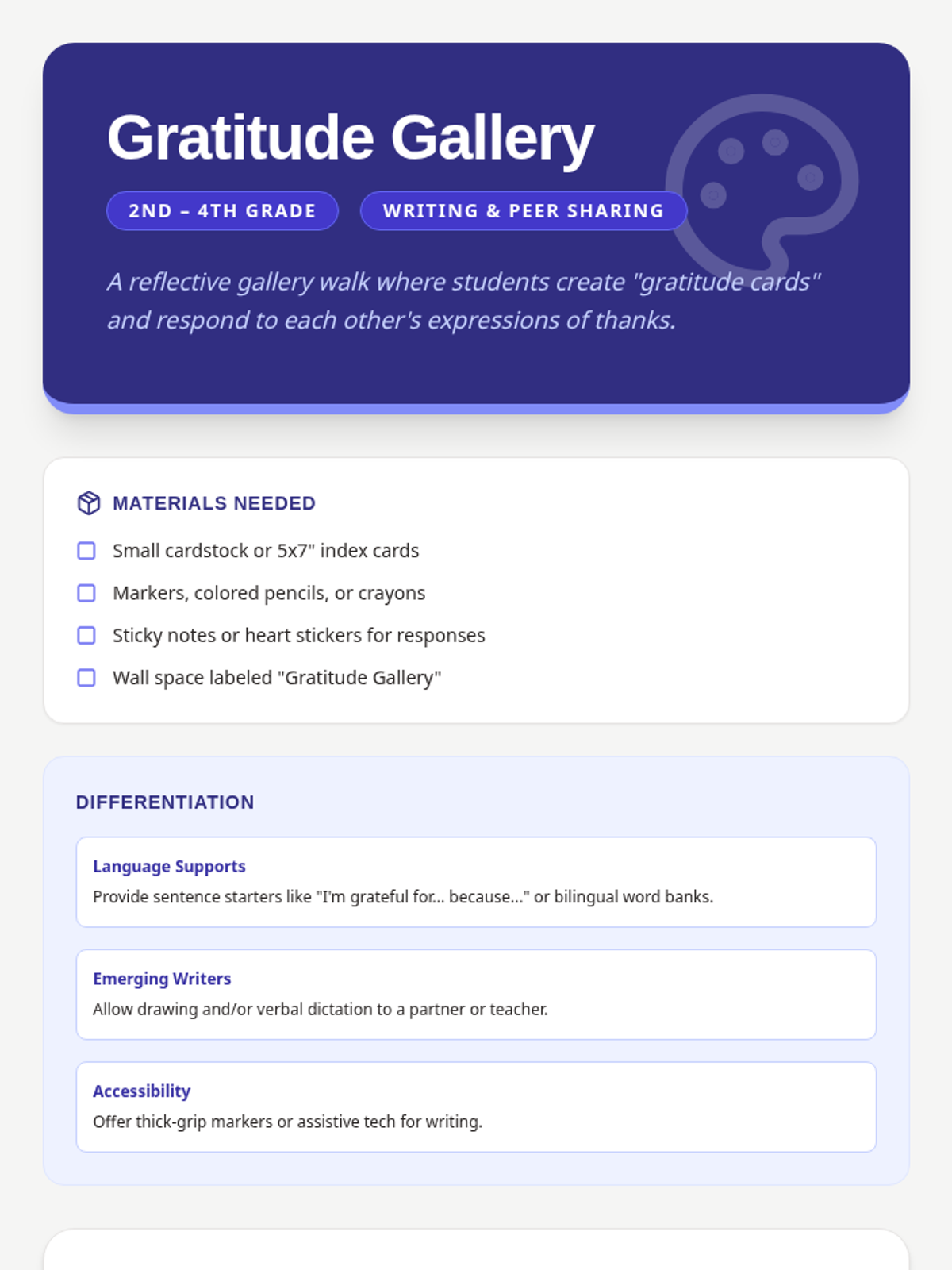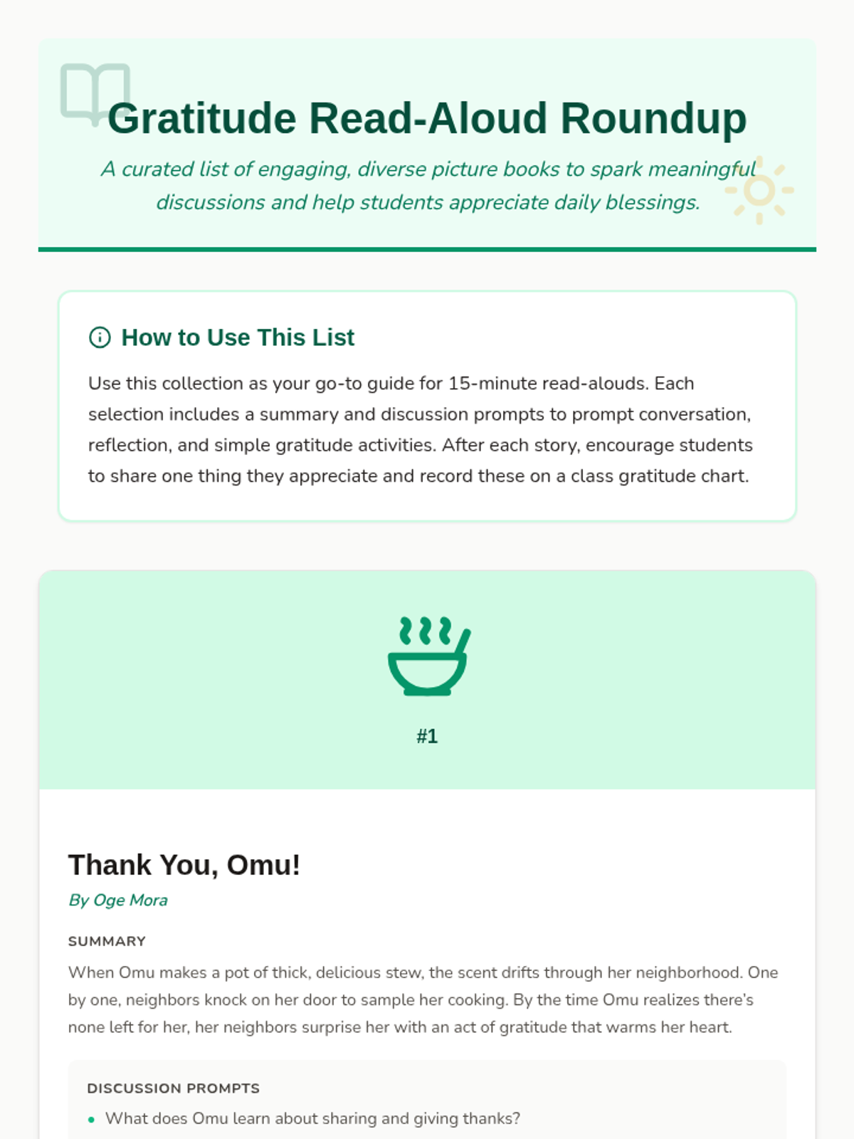 A curated sequence of activities and read-alouds focused on cultivating gratitude in Pre-K through 4th-grade classrooms through diverse literature and hands-on projects.