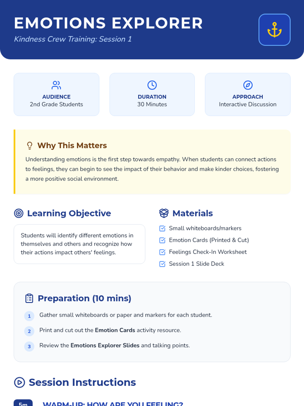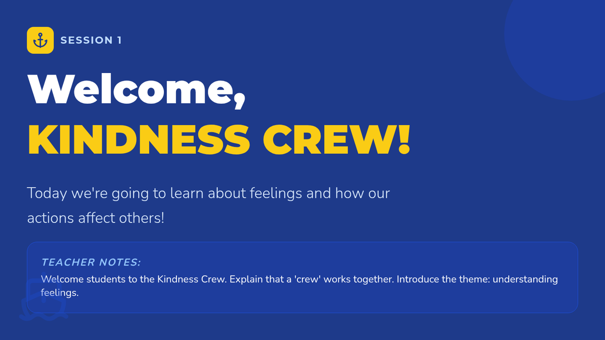 A four-session Tier 2 intervention for second-grade students to build empathy, respect, and positive social skills through the 'Kindness Crew' framework.