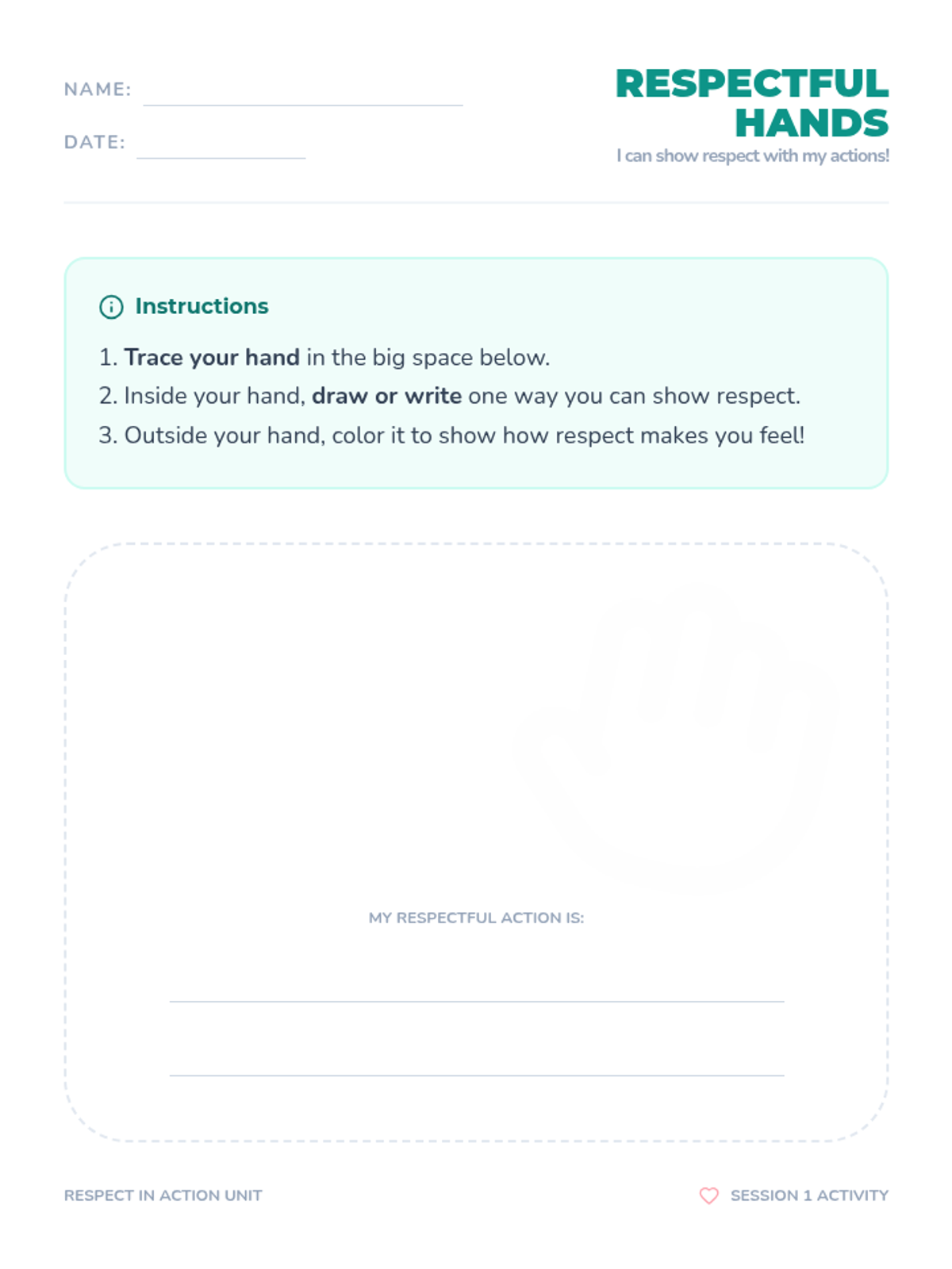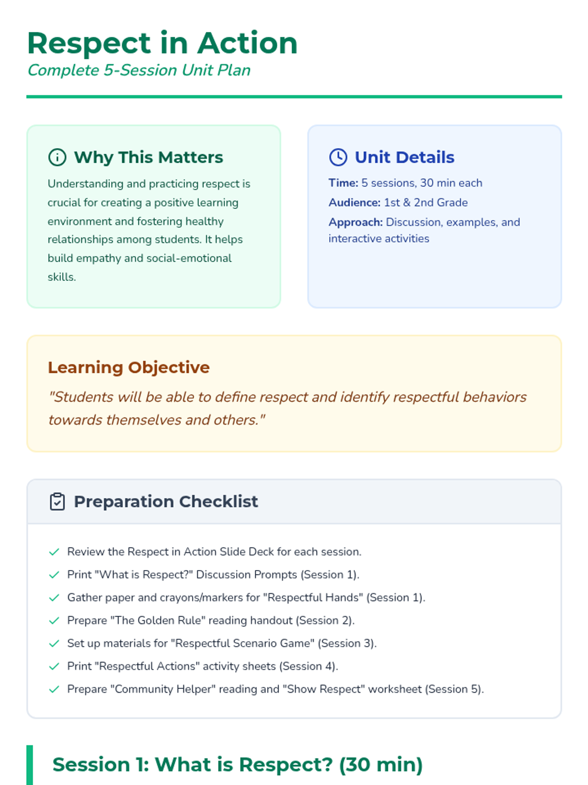 A five-session social-emotional learning unit for 1st and 2nd graders focusing on self-respect, respecting others, and understanding different types of respect in the community.