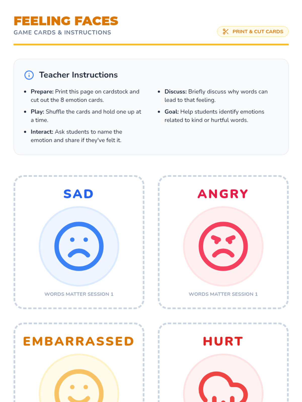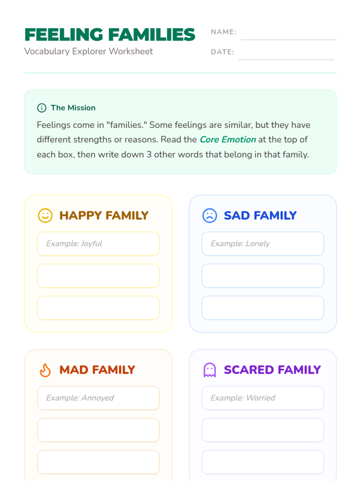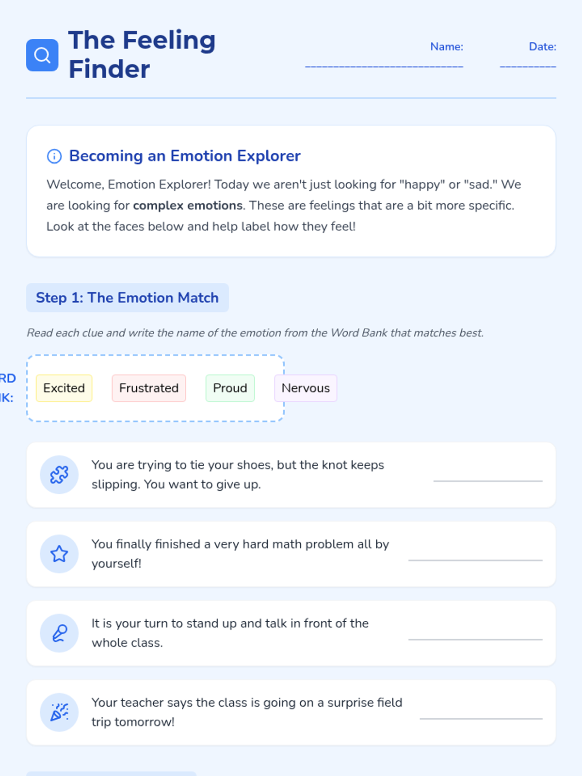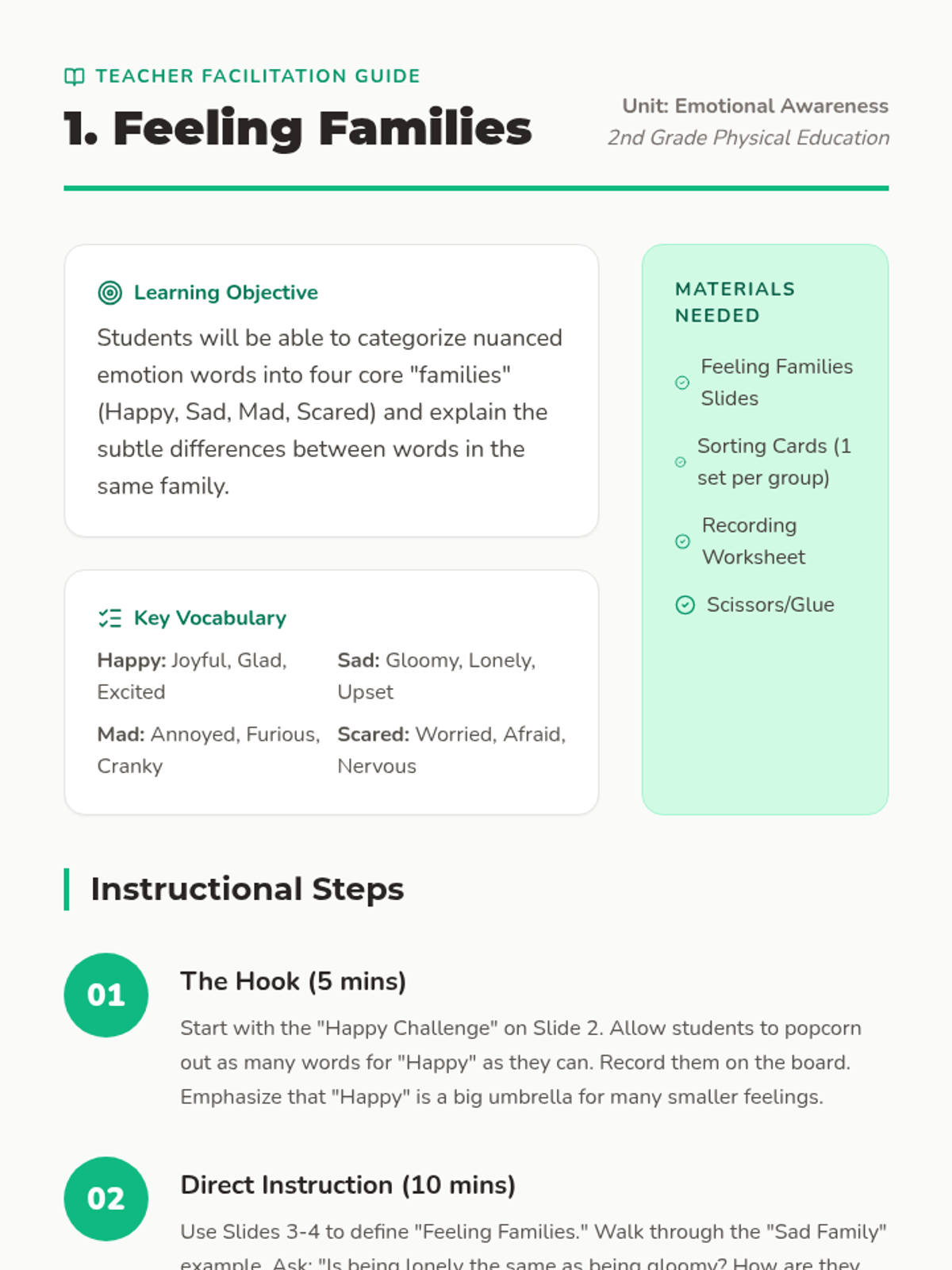 A comprehensive unit for 2nd graders to expand their emotional vocabulary, recognize non-verbal cues, understand emotional intensity, identify mixed feelings, and practice constructive communication using 'I statements'. Students move from basic emotion recognition to nuanced expression and conflict resolution.