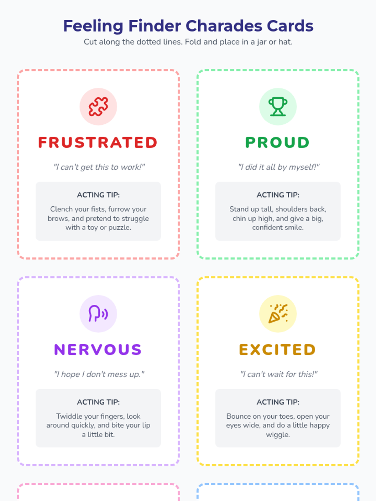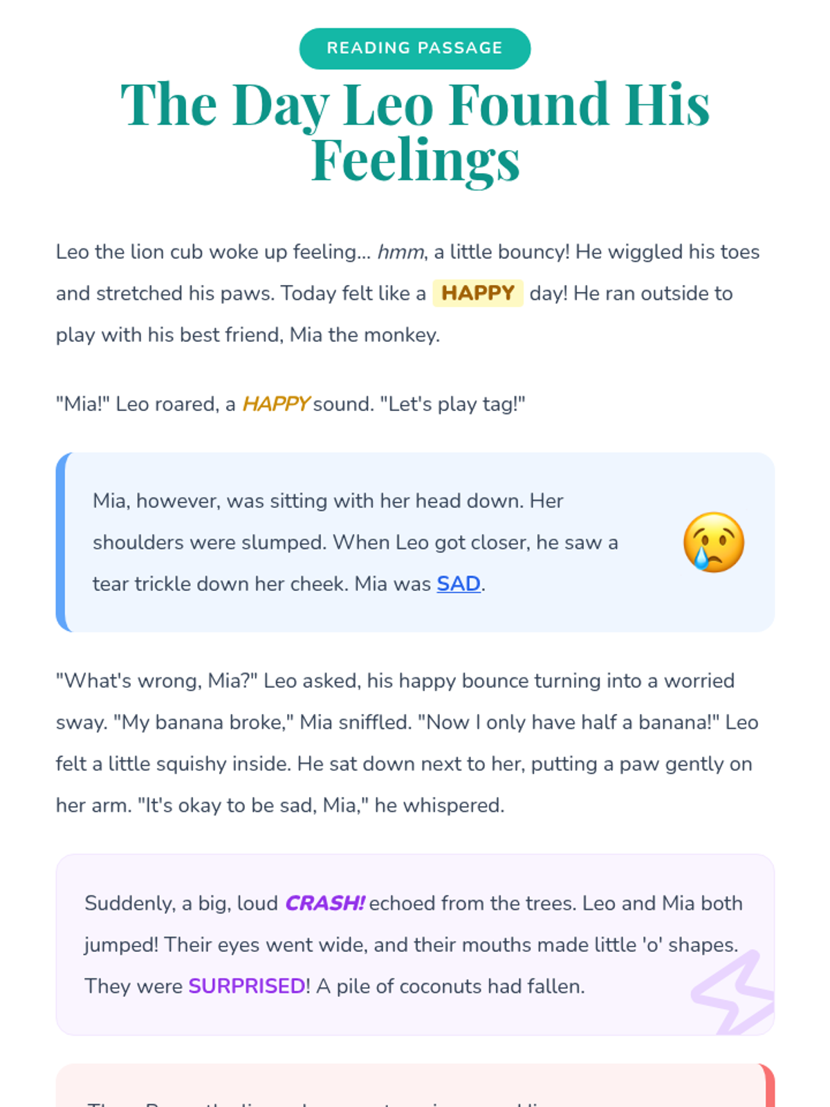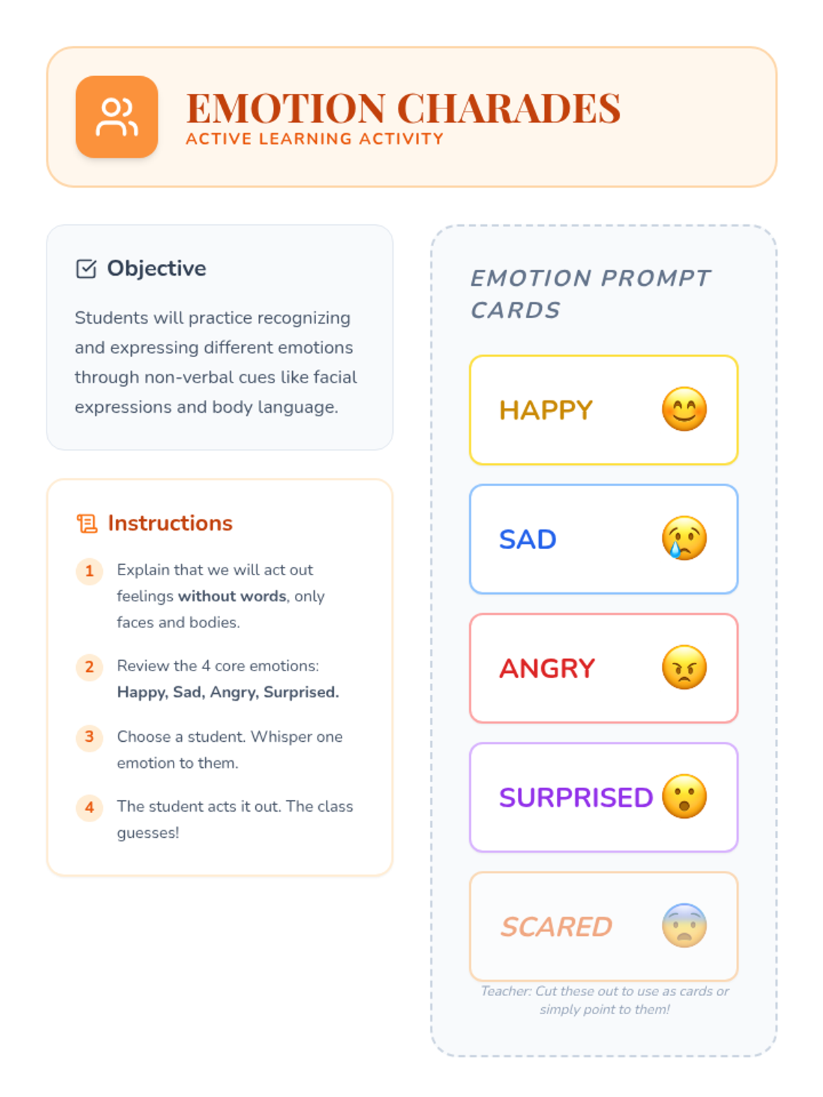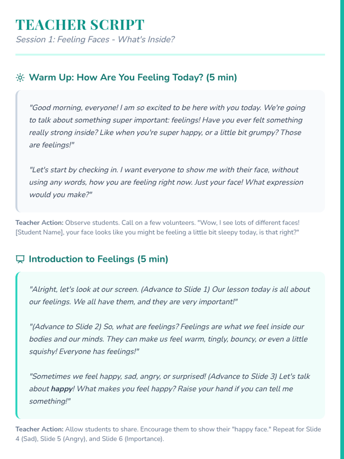 A comprehensive unit for 2nd graders to expand their emotional vocabulary, recognize non-verbal cues, understand emotional intensity, identify mixed feelings, and practice constructive communication using 'I statements'. Students move from basic emotion recognition to nuanced expression and conflict resolution.