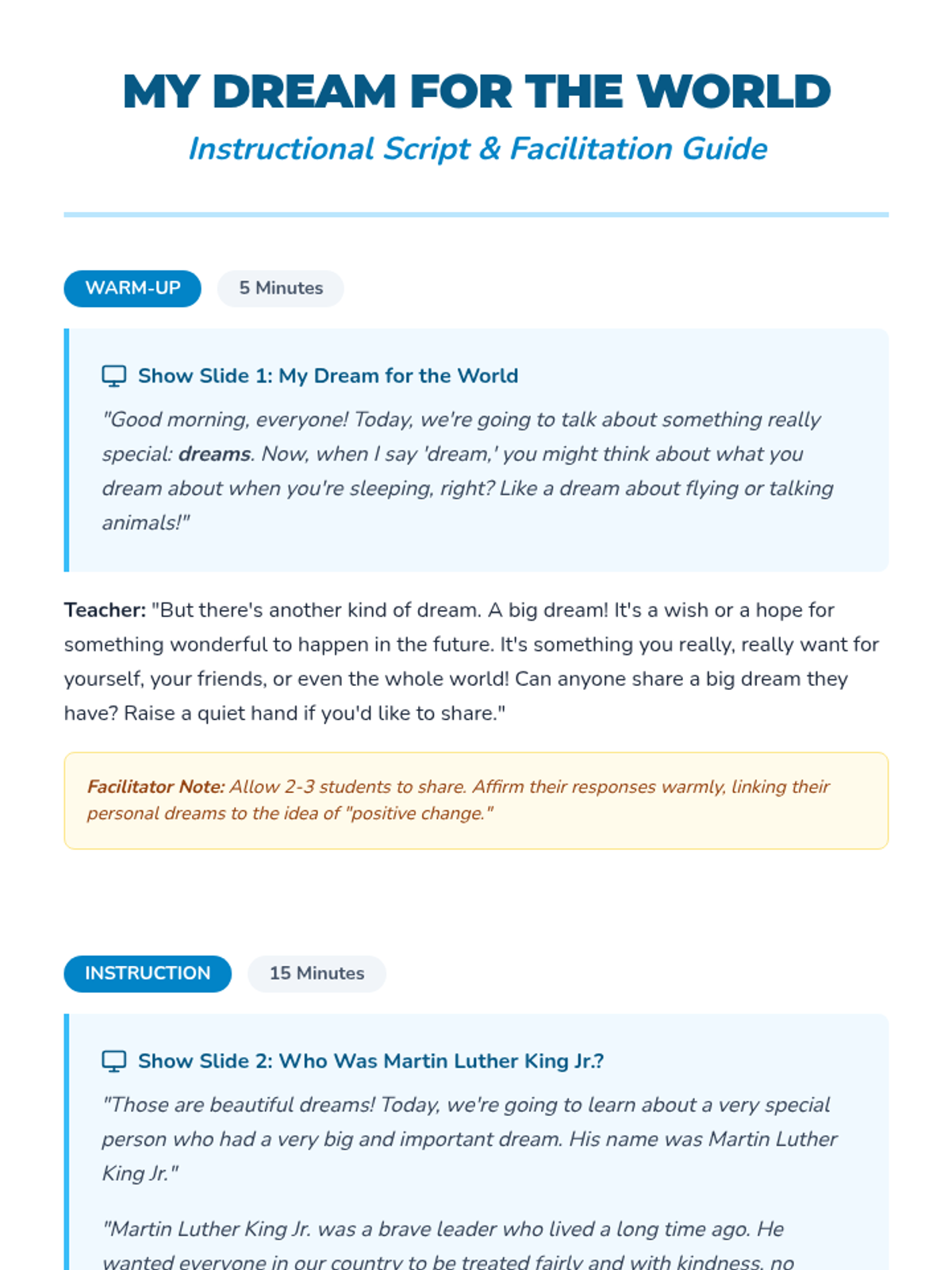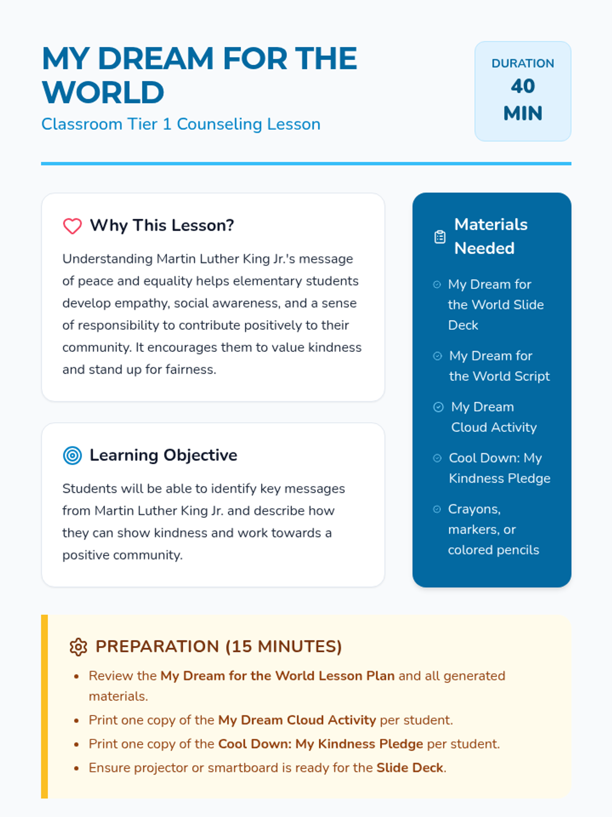 A social-emotional learning sequence for elementary students focused on empathy, community, and self-worth. It includes a lesson on Martin Luther King Jr.'s message of peace and equality, followed by a lesson on recognizing and celebrating personal pride and accomplishments.